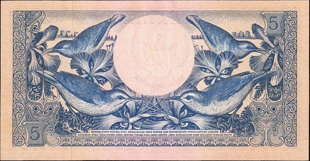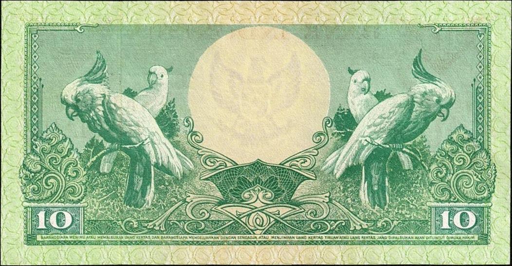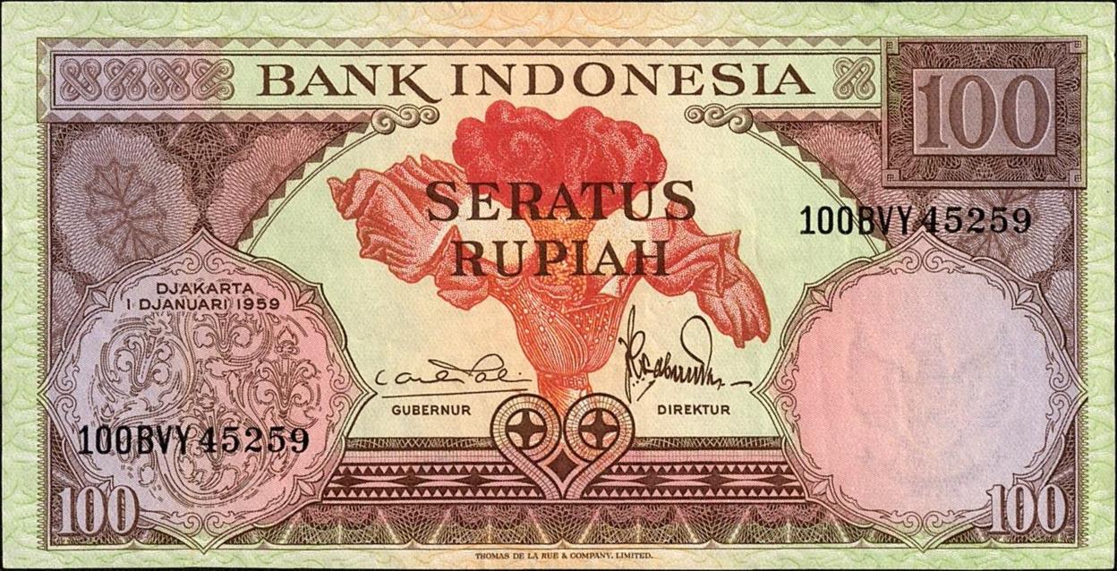 1995/1996. Black, dark grayish green and red on multicolored underprint. Red bird of paradise at center. Arms at upper right area. Cloves flower at center, map of Indonesian Archipelago at right on back. Watermark: K. H. Dewantara. Segmented foil over the security thread. Second date appears after imprint.