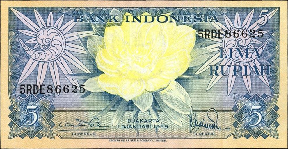 1.1.1959. Dark brown and red on multicolor underprint. Giant Rafflessia Patma flowers at center. Back: Violet on multicolor underprint. Rhinoceros hornbills. Watermark: Arms. Printer: TDLR.