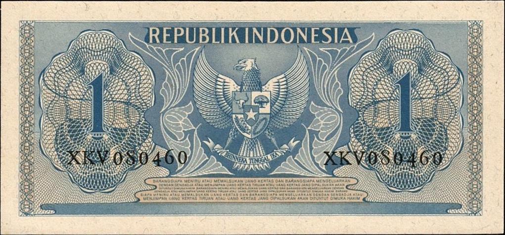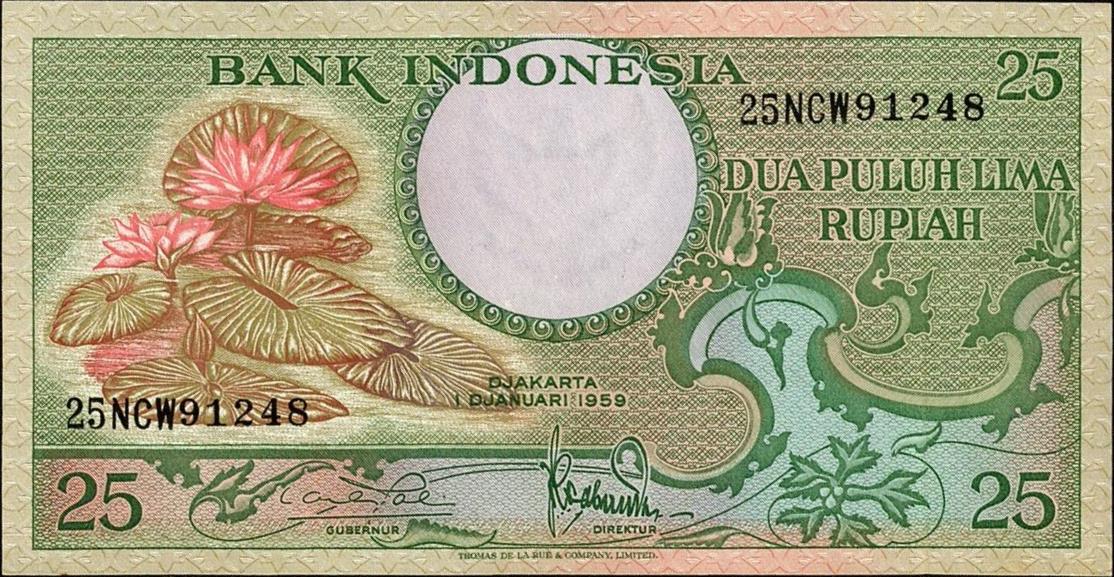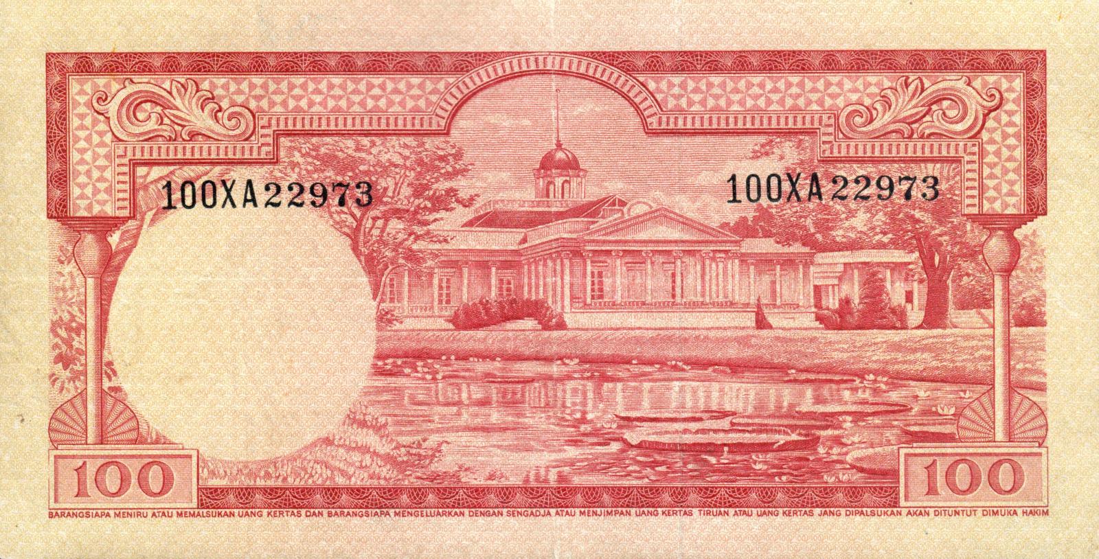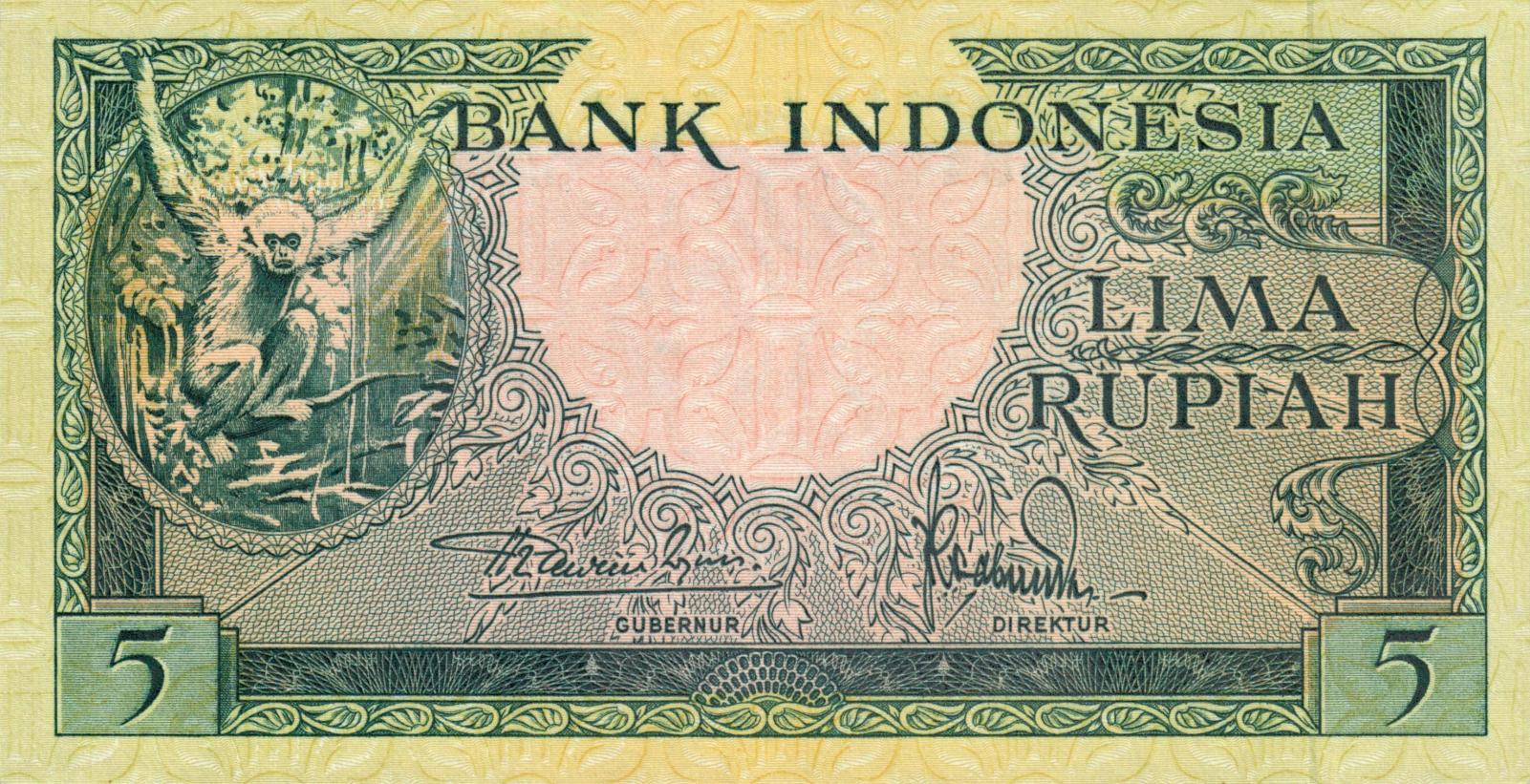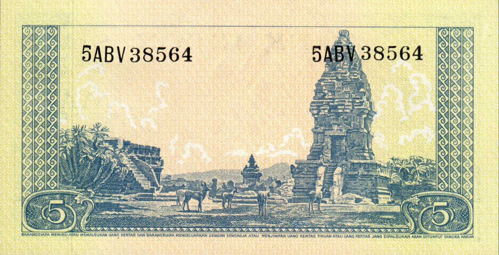 ND (1957). Green on pink and yellow underprint. Orangutan at left. Back: Prambanan temple in blue.