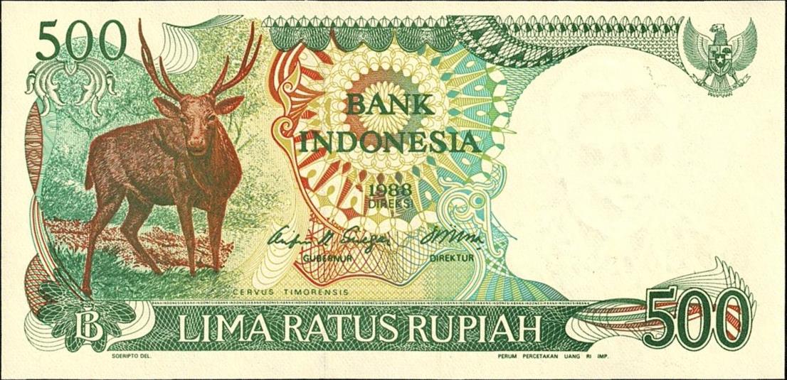 1988. Brown and dark green on multicolored underprint. Rusa Deer at left. Bank of Indonesia Cirebon branch at right on back. Watermark: General A. Yani.