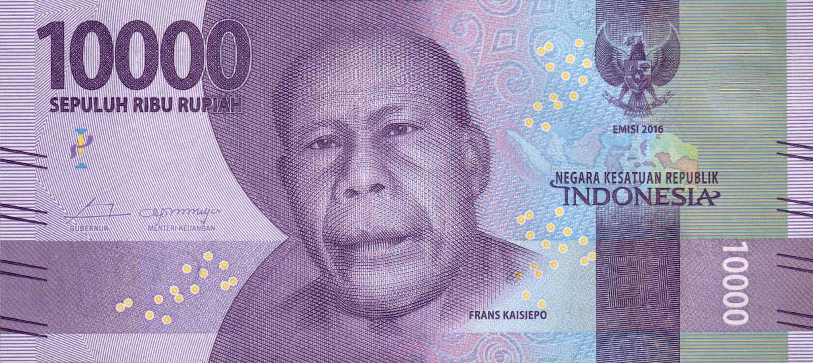 2016/2018. Dark purple on purple and multicolored underprint. Portrait of Frans Kaisiepo at center on face, eagle and national crest at top right. Back features Taman Nasional Wakatobi at left, woman in traditional costume dancing at center on back.