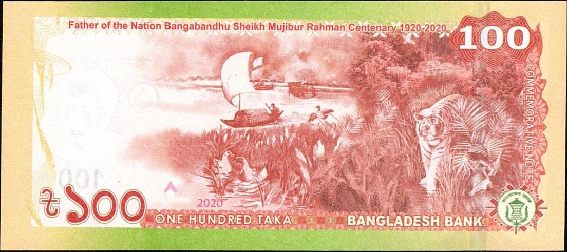 2020. Maroon on yellow and green underprint. Mujibur Rahman at left on face. Commemorative banknote: "Father of the Nation Bangabandhu Sheikh Mujibur Rahman Centenary 1920-2020." River fishing scene at center, tiger in brush at right on back.
