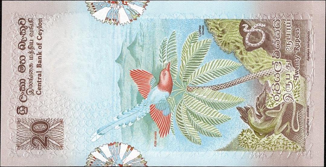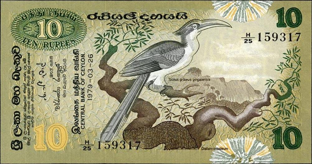 26.3.1979. Green, brown and black on multicolor underprint. Sri Lanka Grey Hornbill in tree at center. Back: Flowers and Yelloweared Bulbul. Watermark: Chinze. Replacement notes: Serial number prefix Z/1.