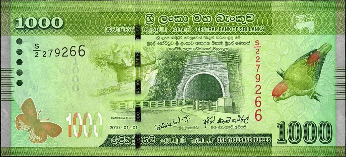 1.1.2010. Green and multicolored. Ramboda tunnel at center, parrot at right. Back: Malpadaya dancer and Dawul Bera drummer. Vertical format. Watermark: parrot and 1000. Issued banknote.
