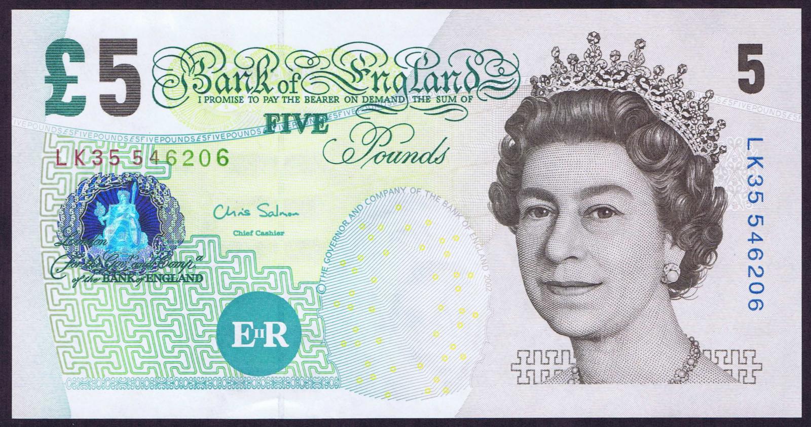 2016 (2015). Grey blue on blue and green underprint. Security features at left, portrait of Queen Elizabeth II at right. Back features Winston Churhill at center.