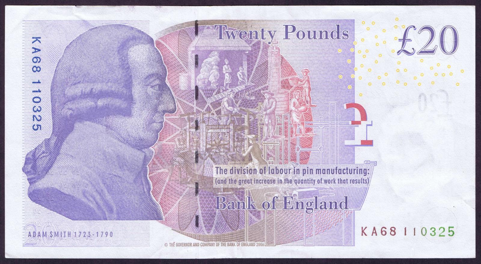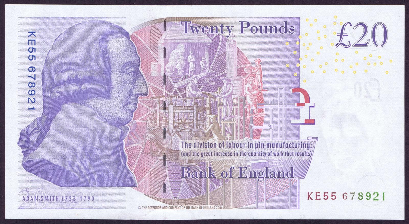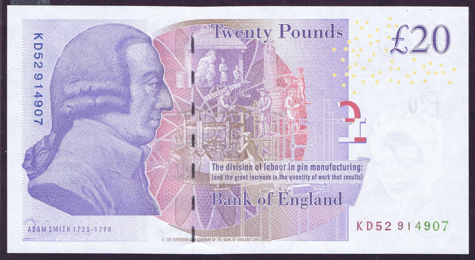 Copyright 2006. Deep violet, purple, and black on multicolored underprint. Queen Elizabeth II at right, facade of Buckingham Palace at lwoer center, Britannia at lower left. Back: Adam Smith at left and pin factory at center. Watermark: Adam Smith.
