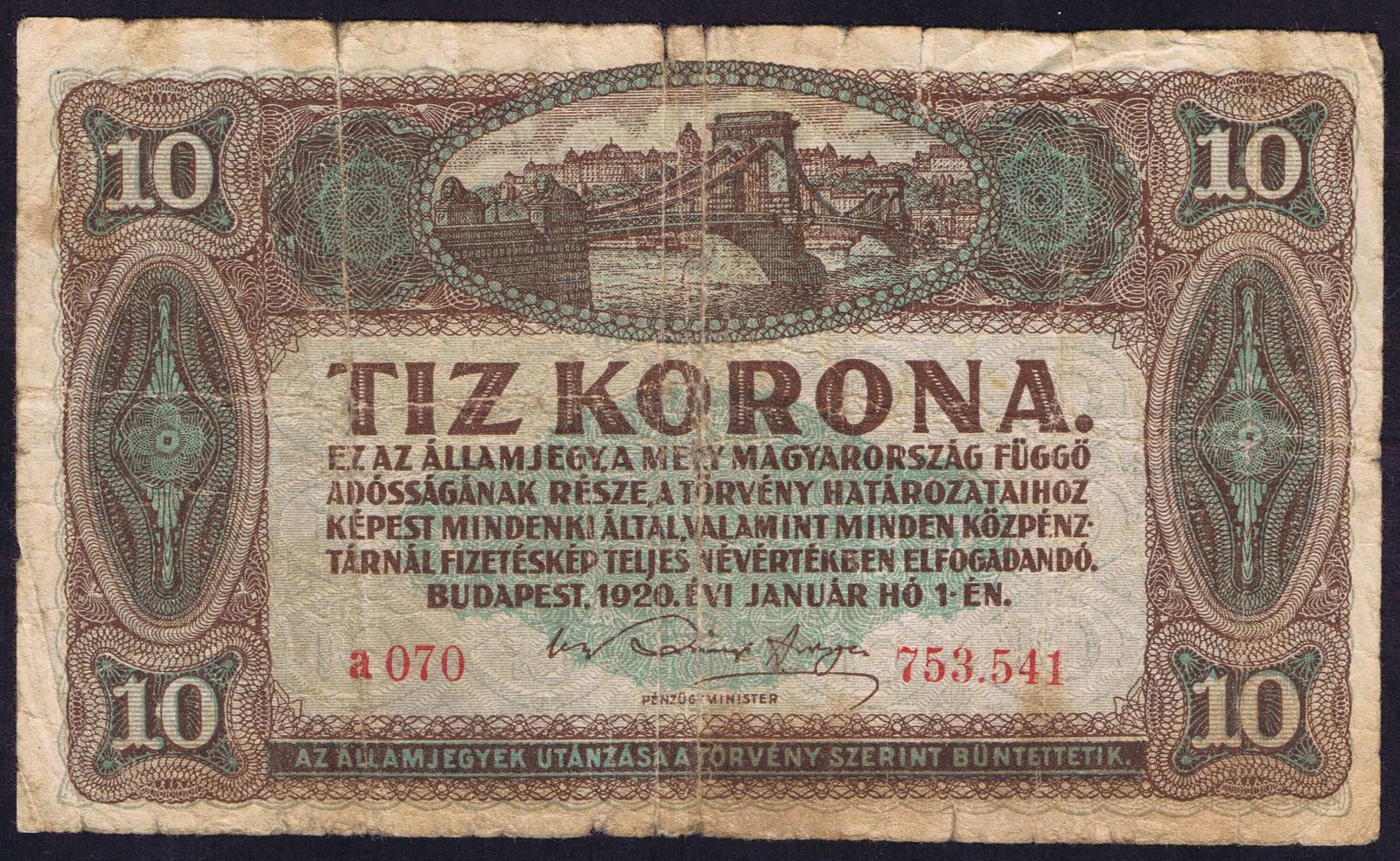 1.1.1920. Brown on blue-green underprint. Chain bridge, Budapest at upper center. 2 serial number varieties(with and without decimal point within). Back: Arms at right.