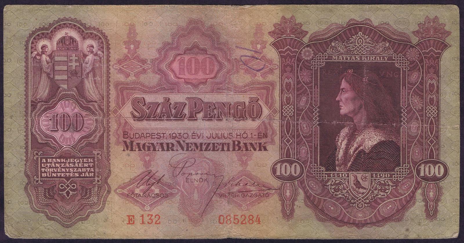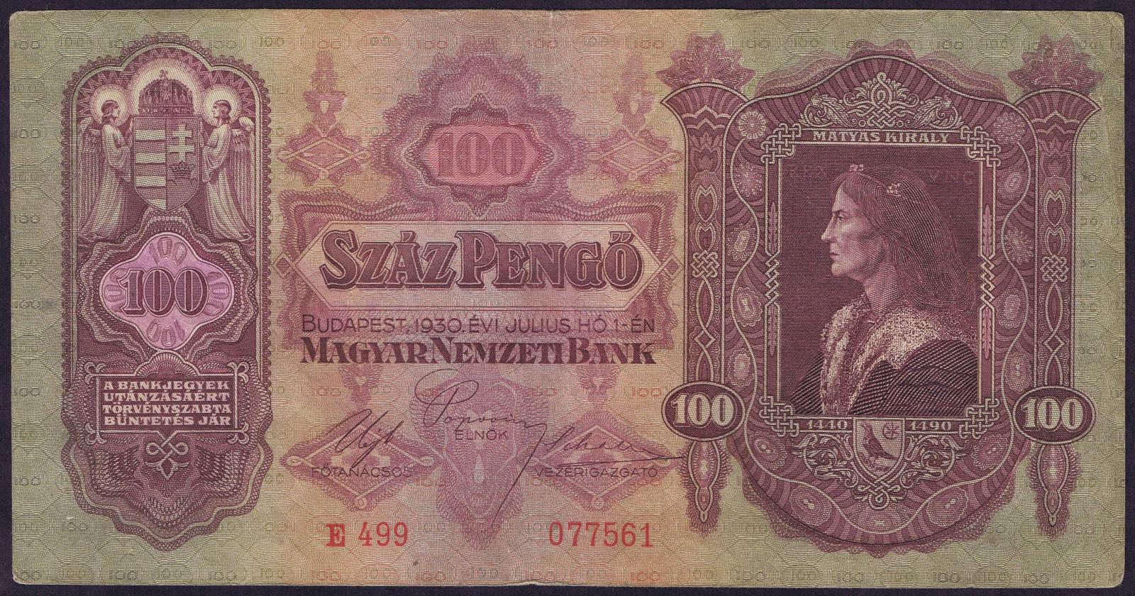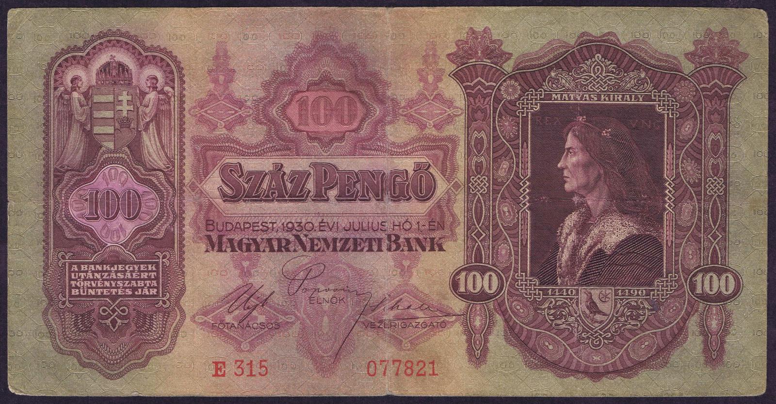 1.7.1930. Violet. Portrait King Mátyás at right. Series number without asterisk. Back: Violet and dark blue. Royal Palace at Budapest at center.
