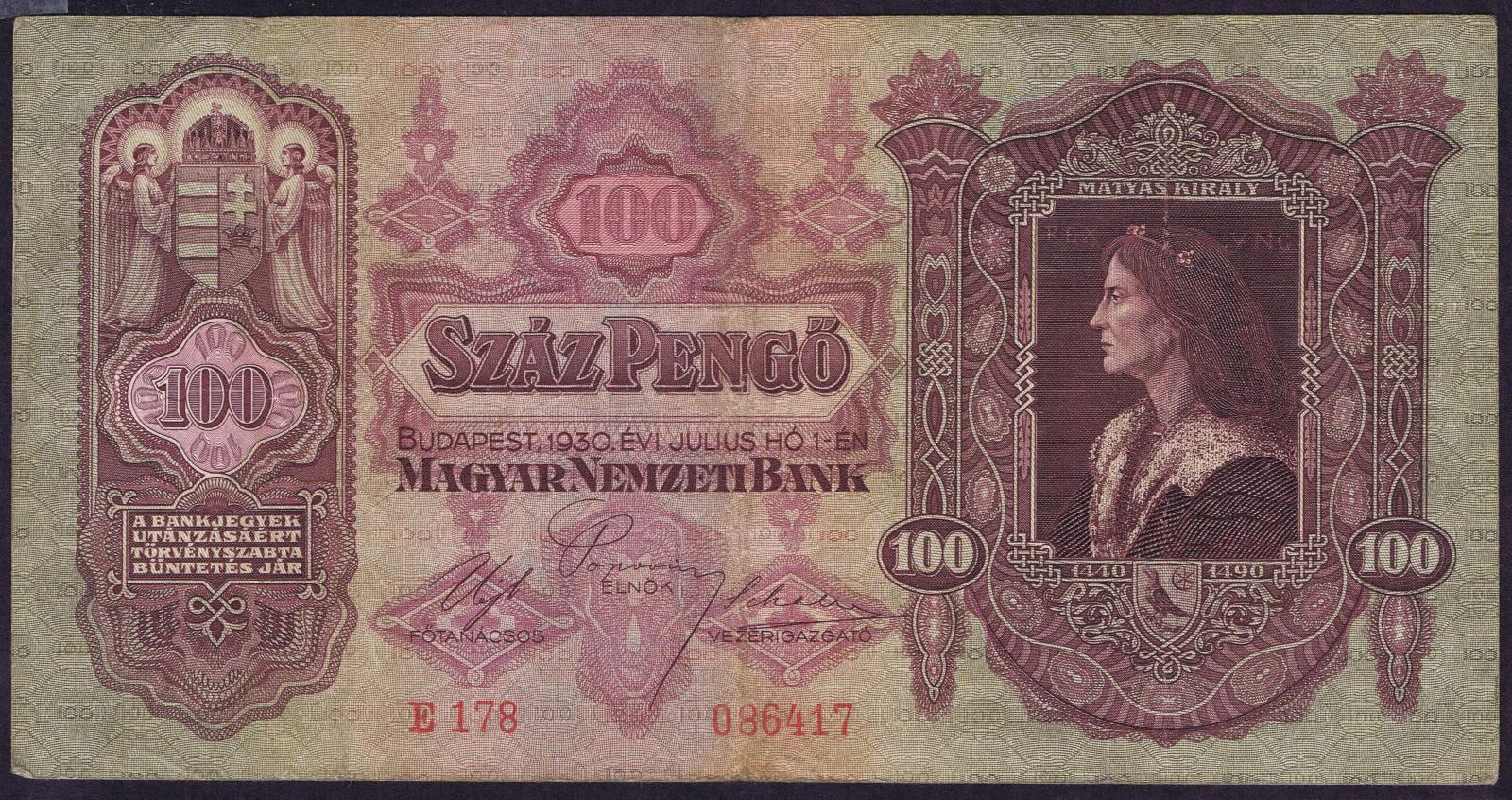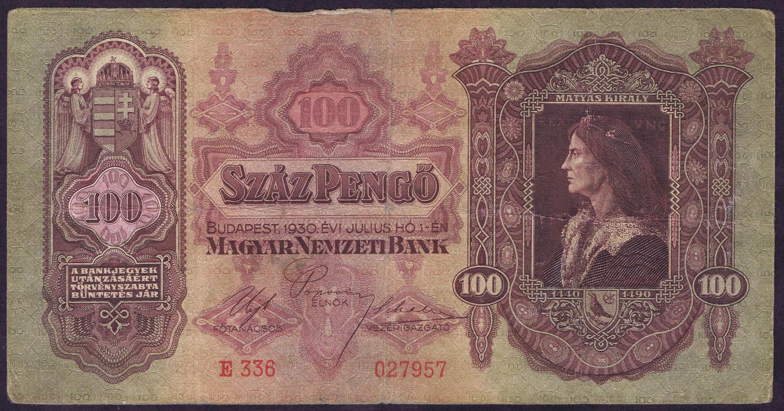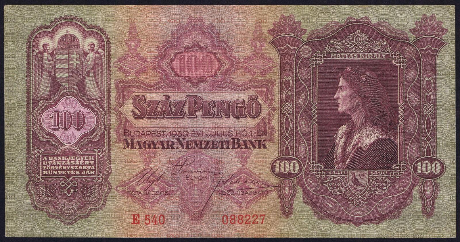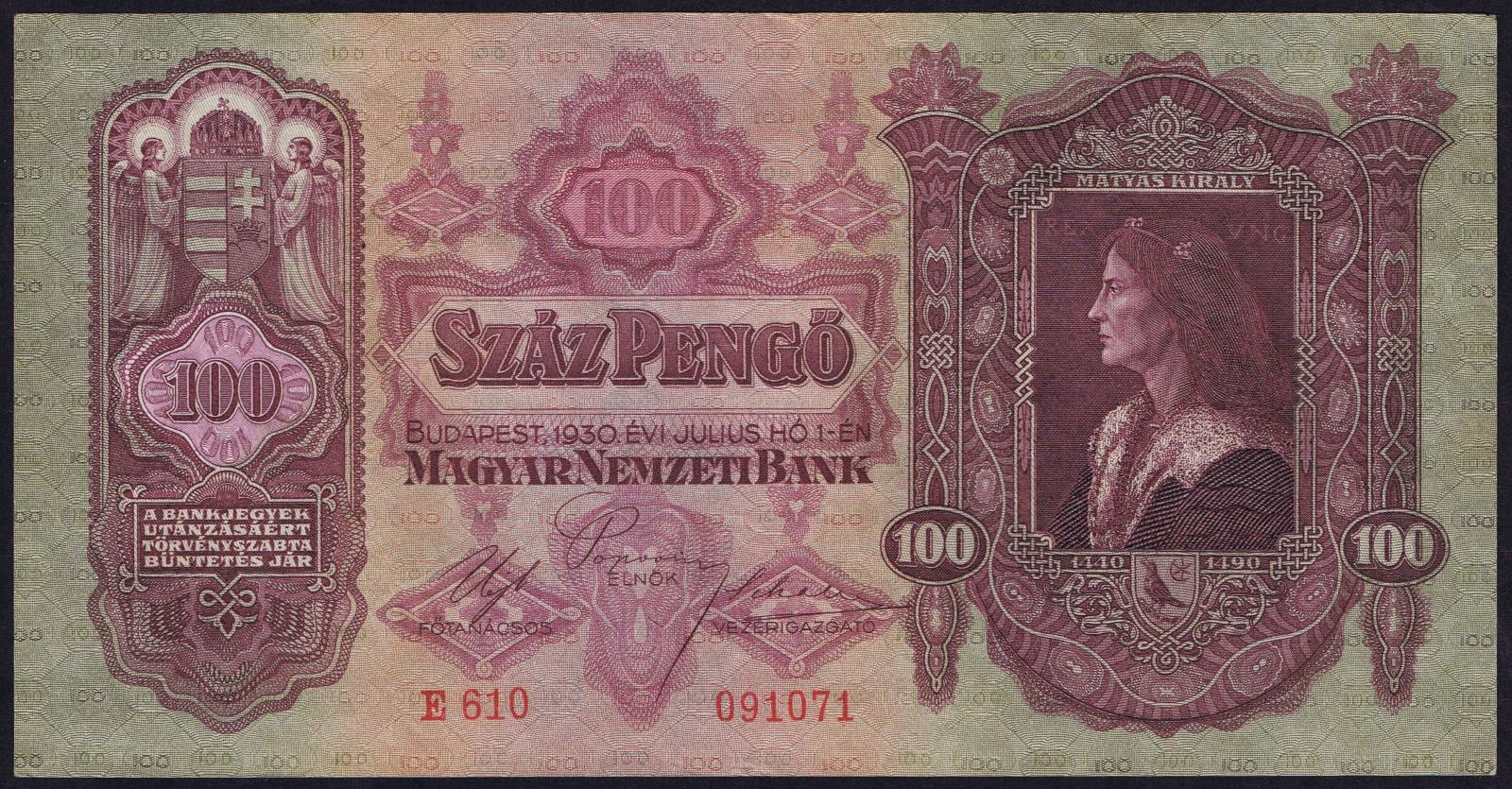 1.7.1930. Violet. Portrait King Mátyás at right. Series number without asterisk. Back: Violet and dark blue. Royal Palace at Budapest at center.