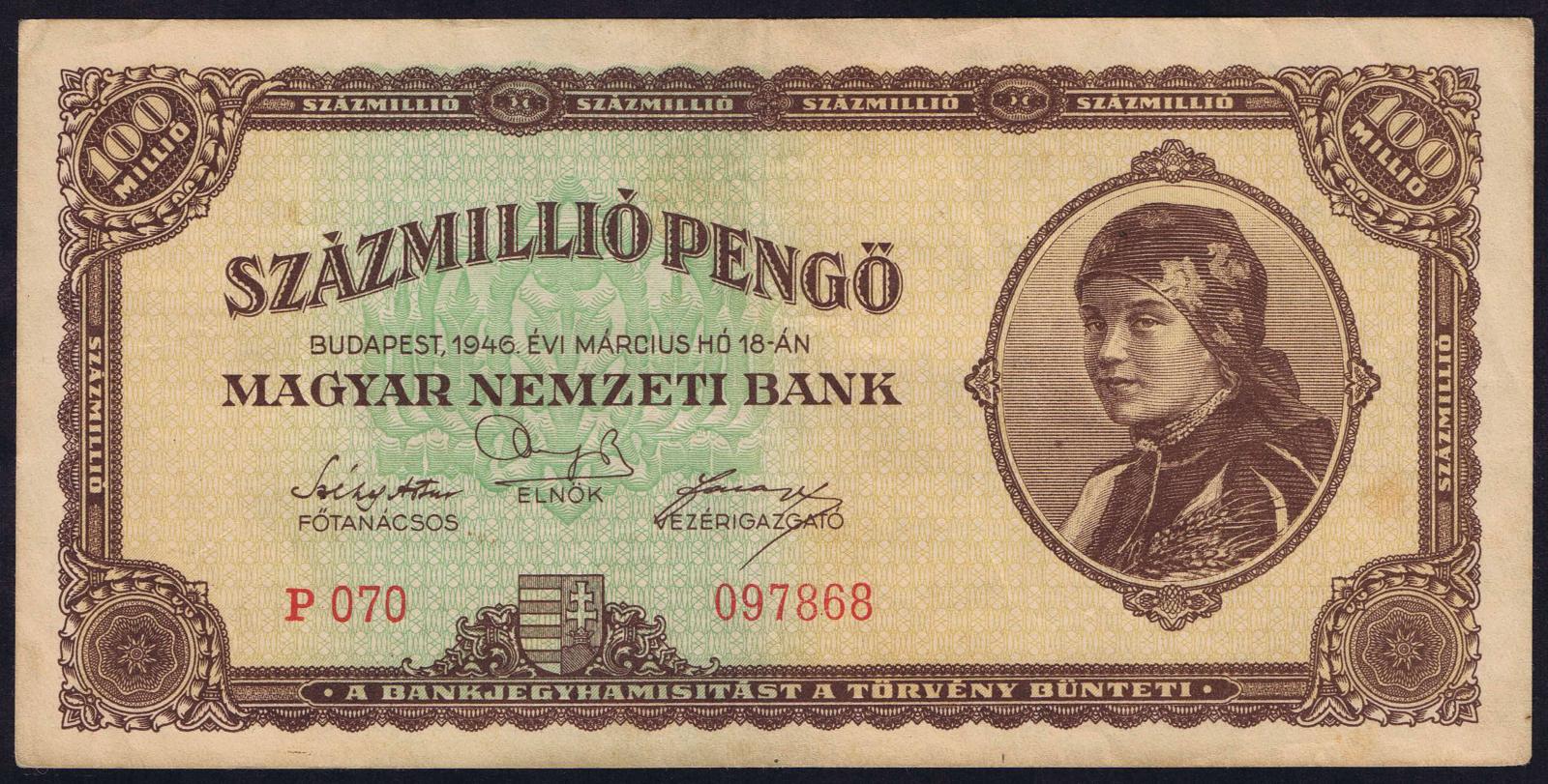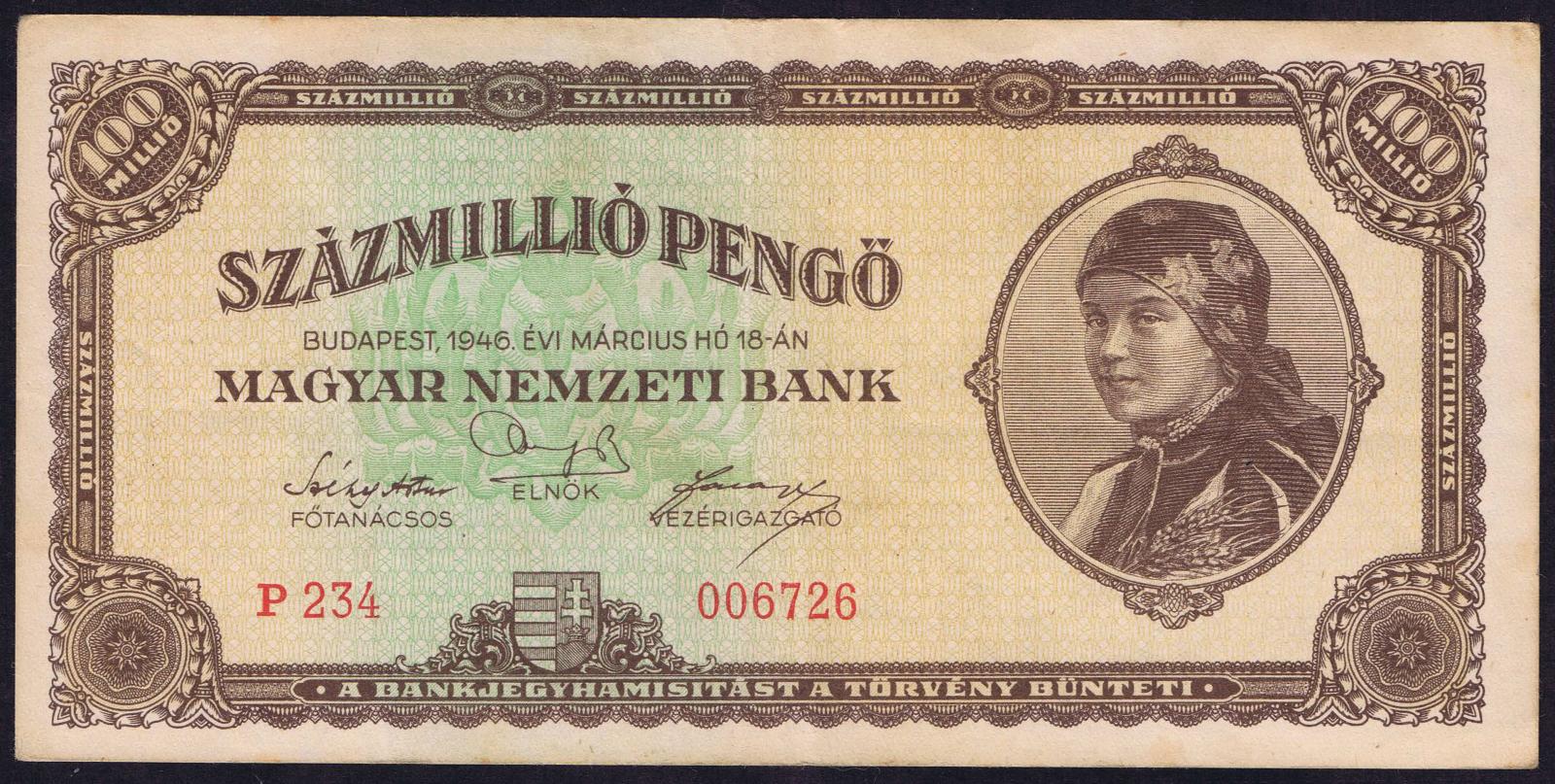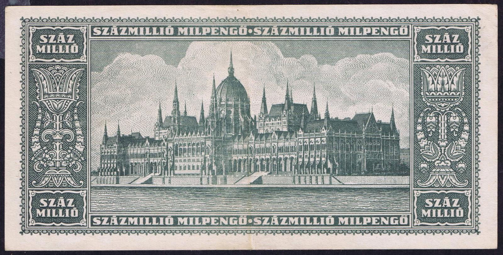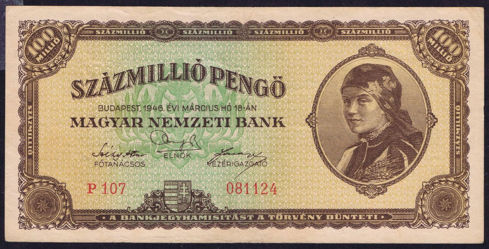 3.6.1946. 100 Million Milpengö. Green. Portrait woman wearing headscarf at right. Without serial number. Back: Parliament house.