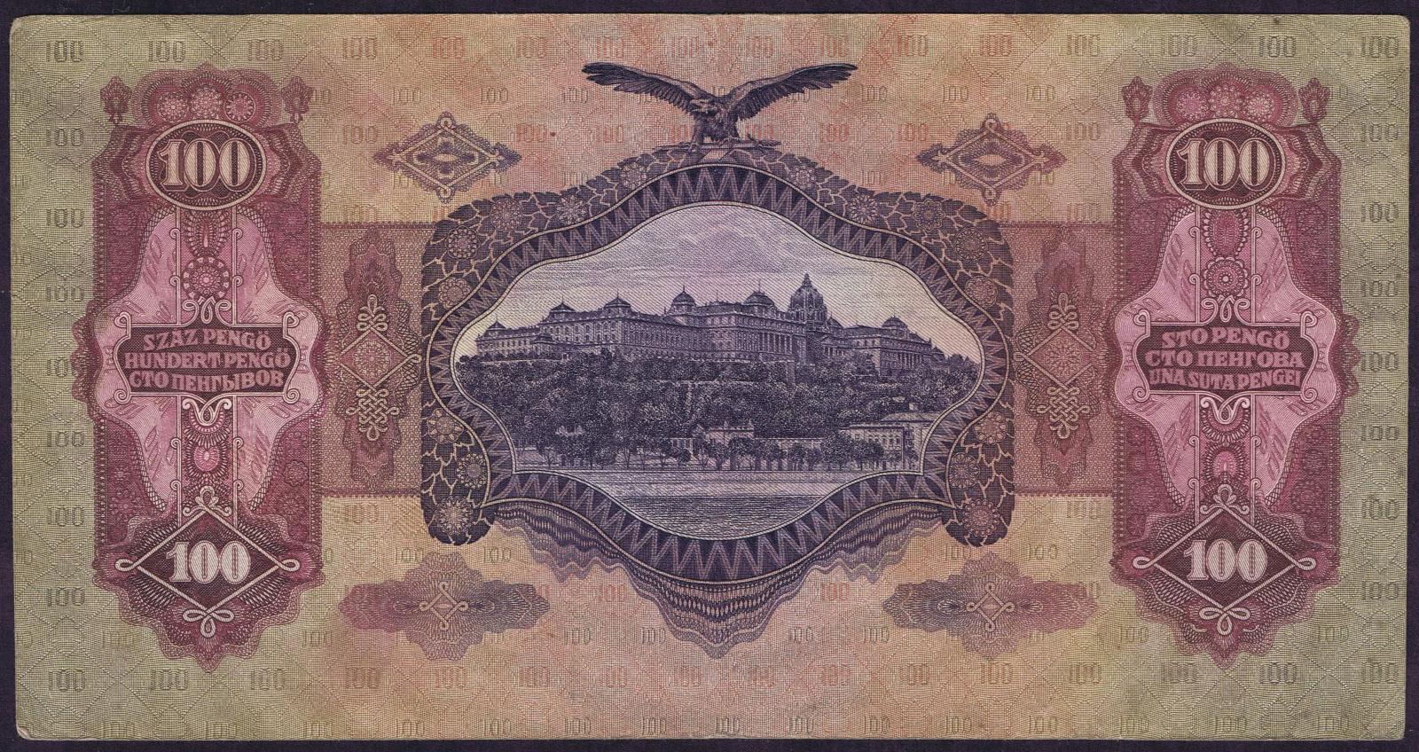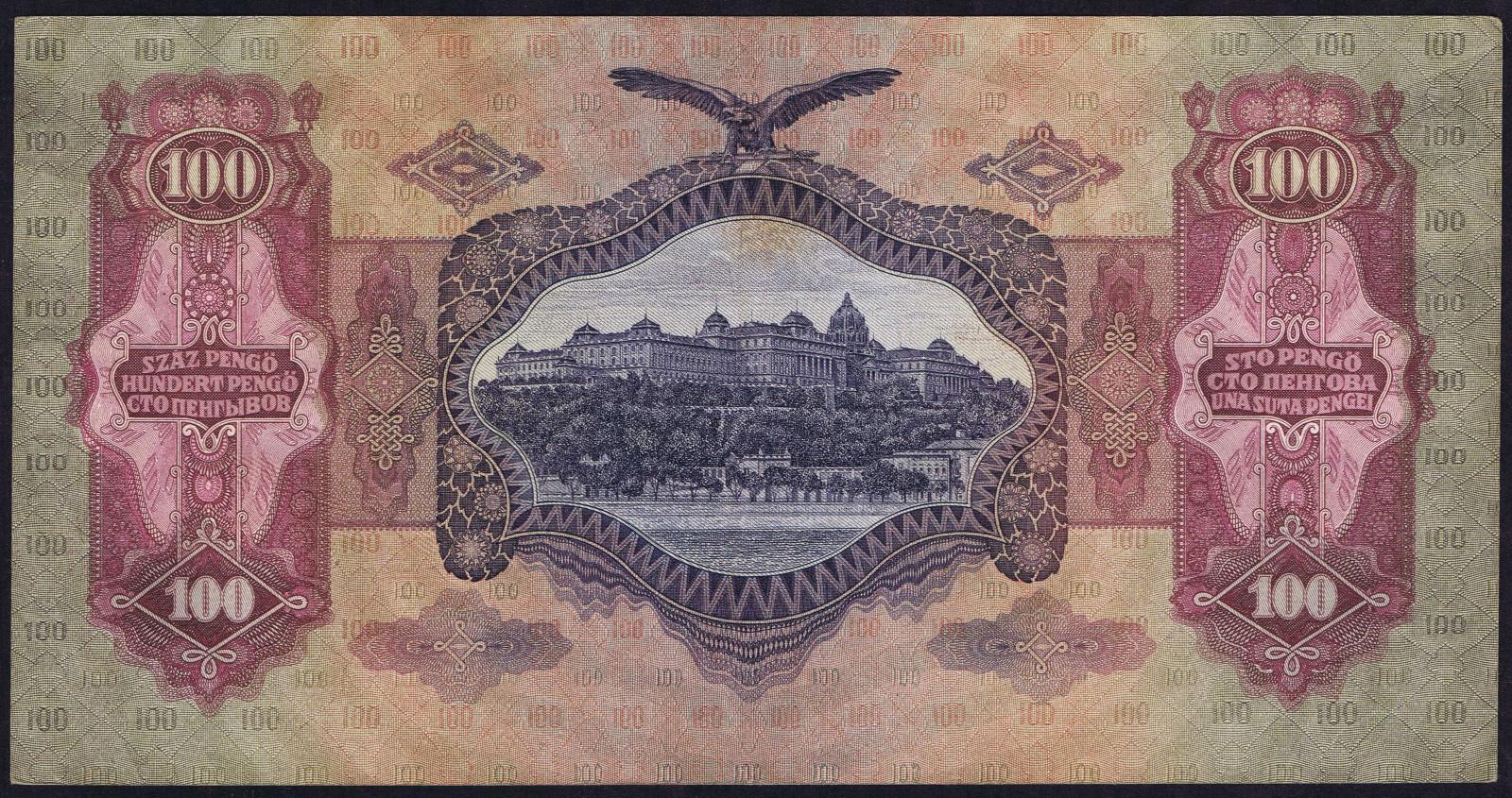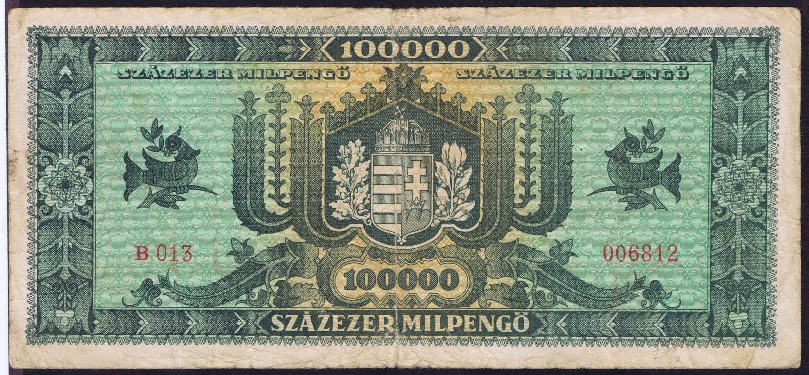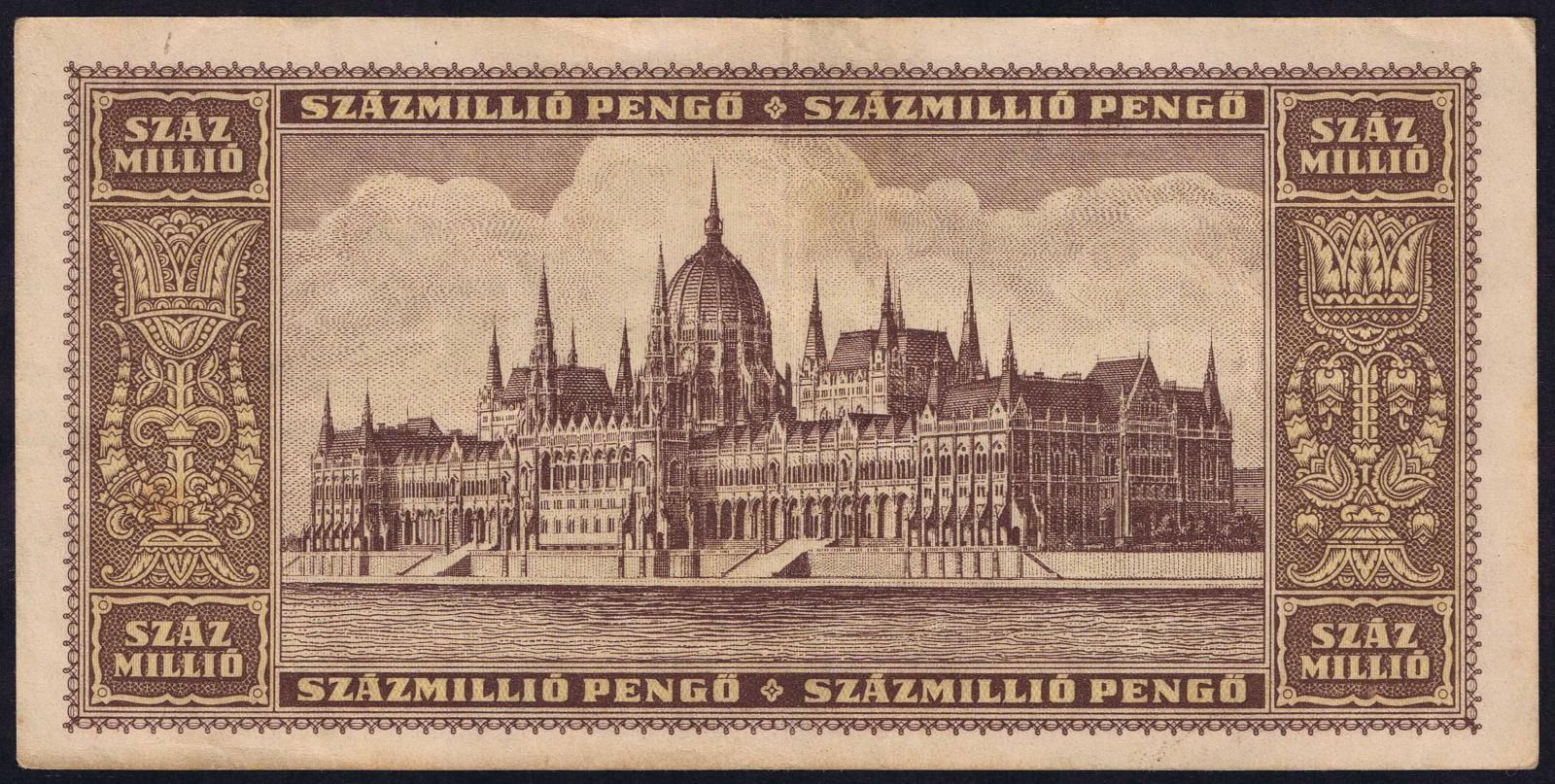3.6.1946. 100 Million Milpengö. Green. Portrait woman wearing headscarf at right. Without serial number. Back: Parliament house.
