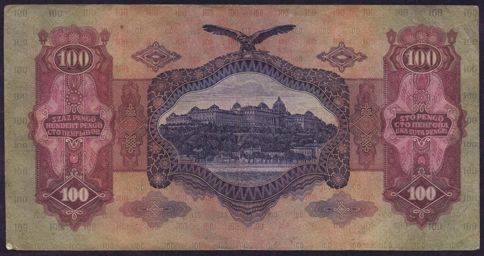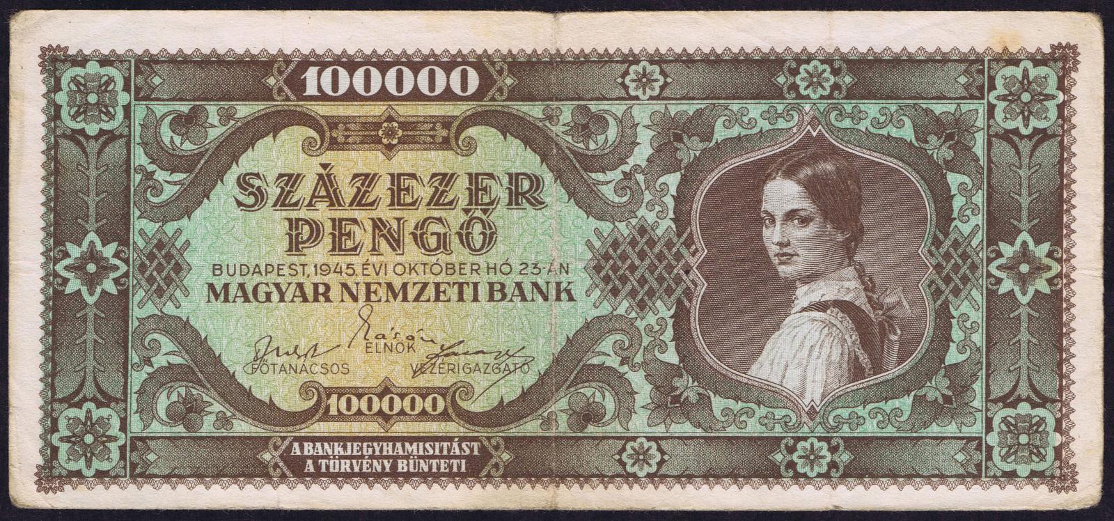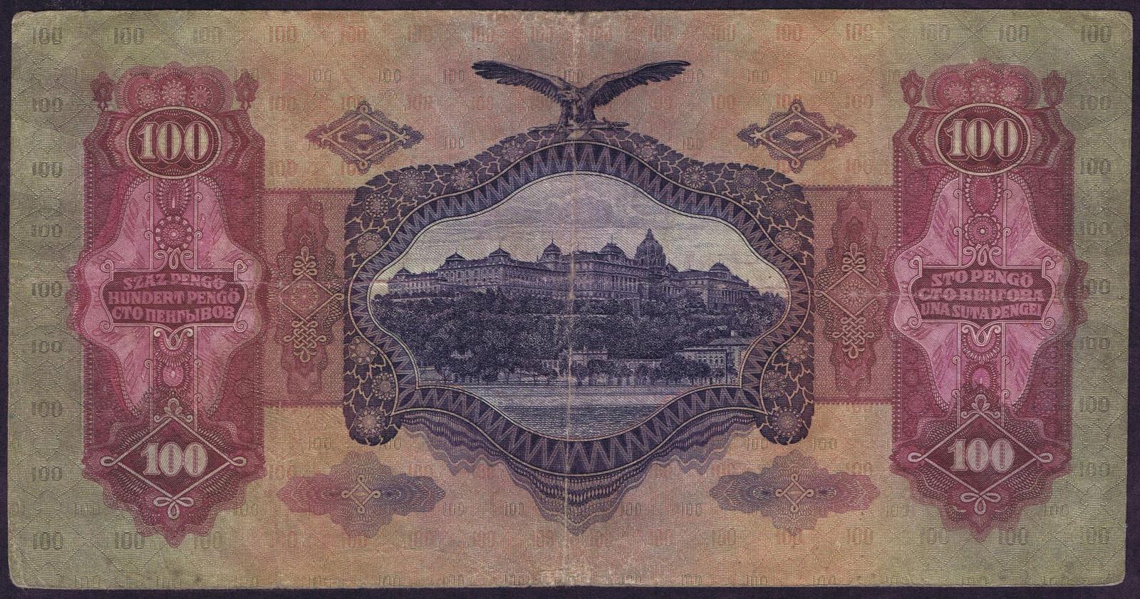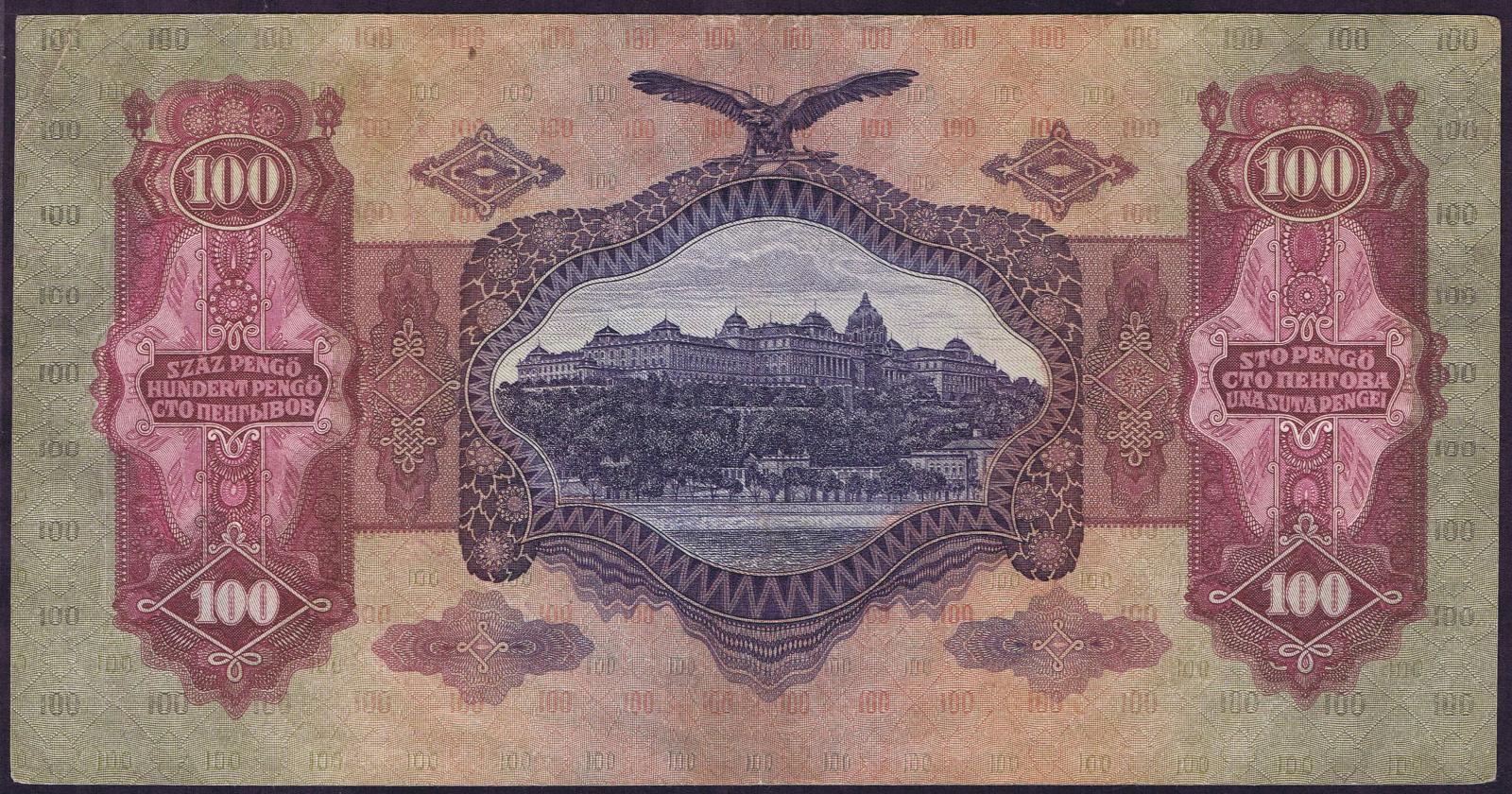 3.6.1946. 100 Million Milpengö. Green. Portrait woman wearing headscarf at right. Without serial number. Back: Parliament house.