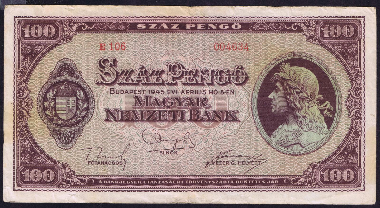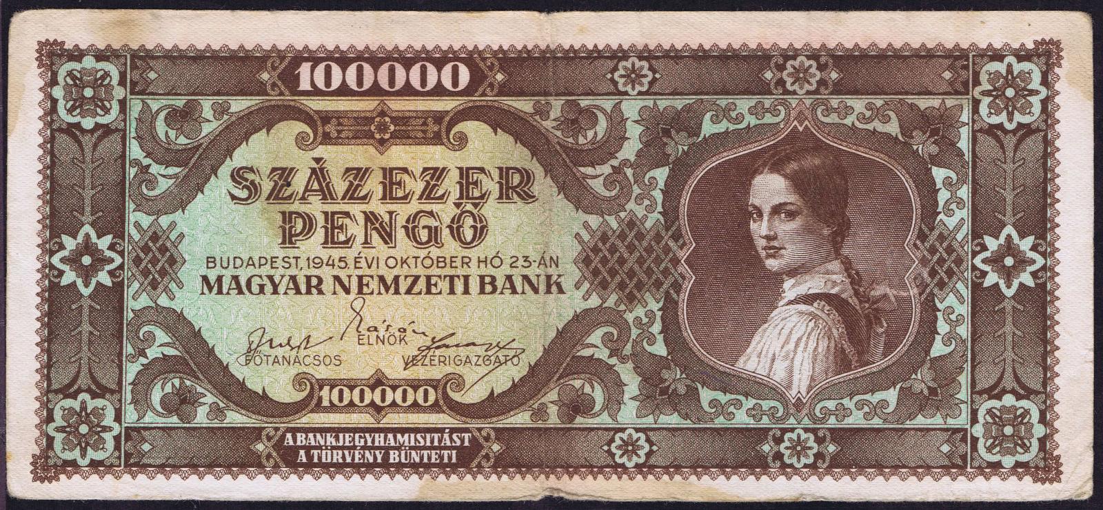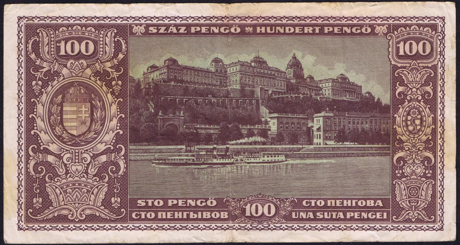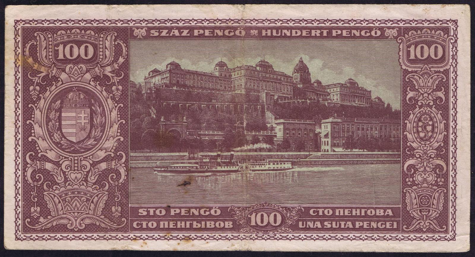 3.6.1946. 100 Million Milpengö. Green. Portrait woman wearing headscarf at right. Without serial number. Back: Parliament house.