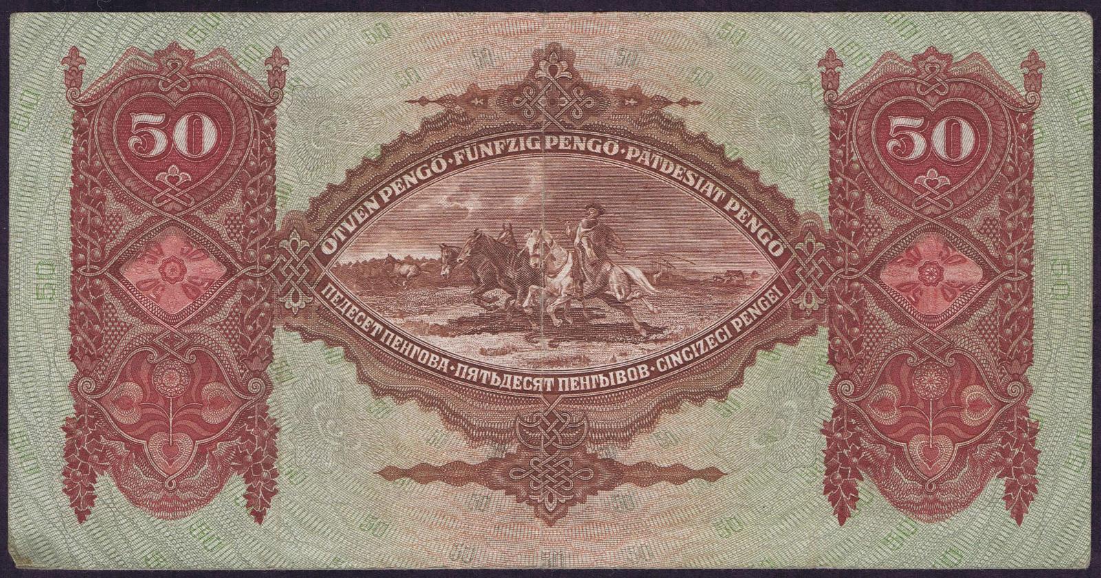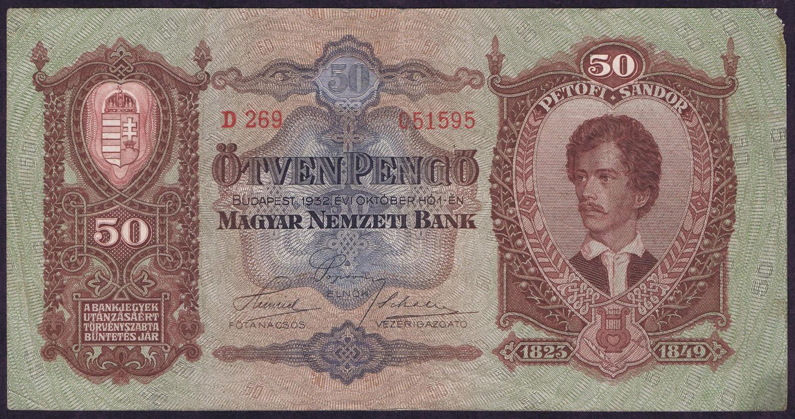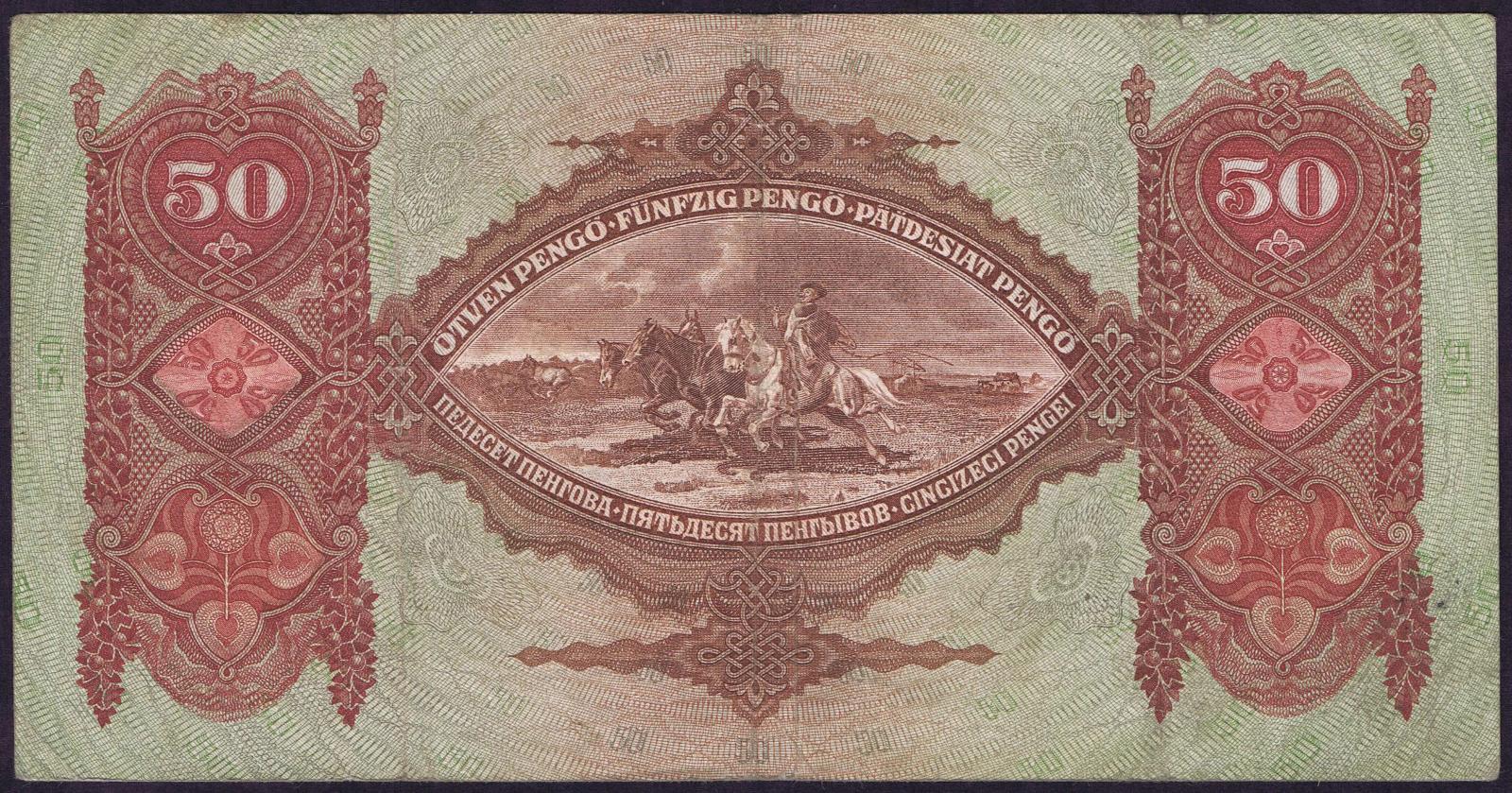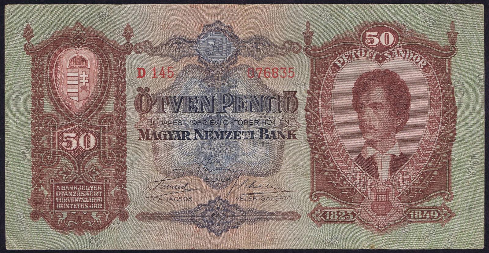 1.10.1932. Red-brown on green and blue underprint. Arms at upper left, portrait S. Petófi at right. Back: János Visky\'s painting Horse driving in Hortobágy.