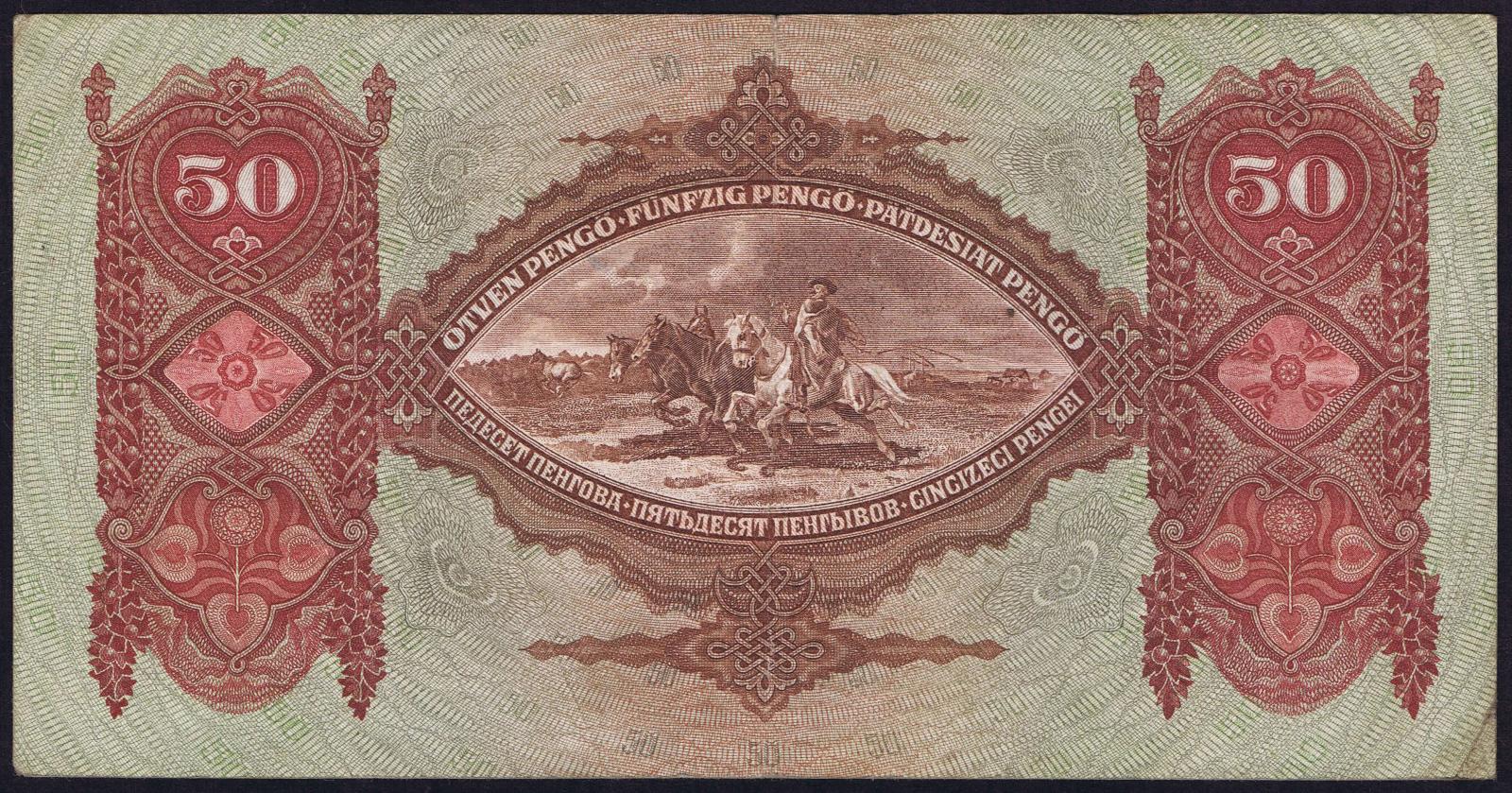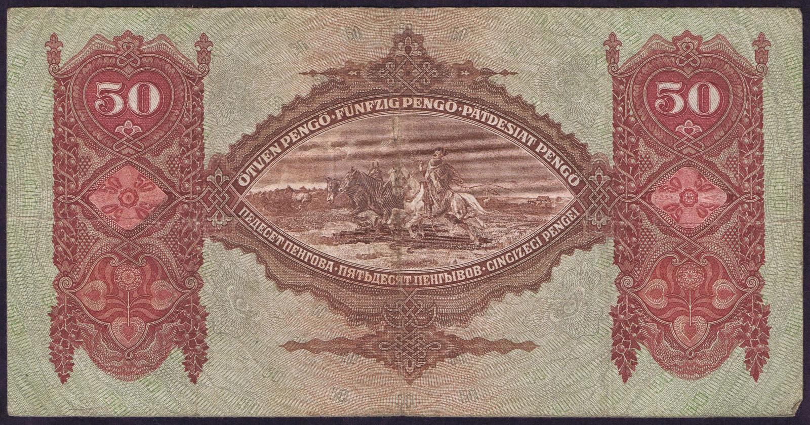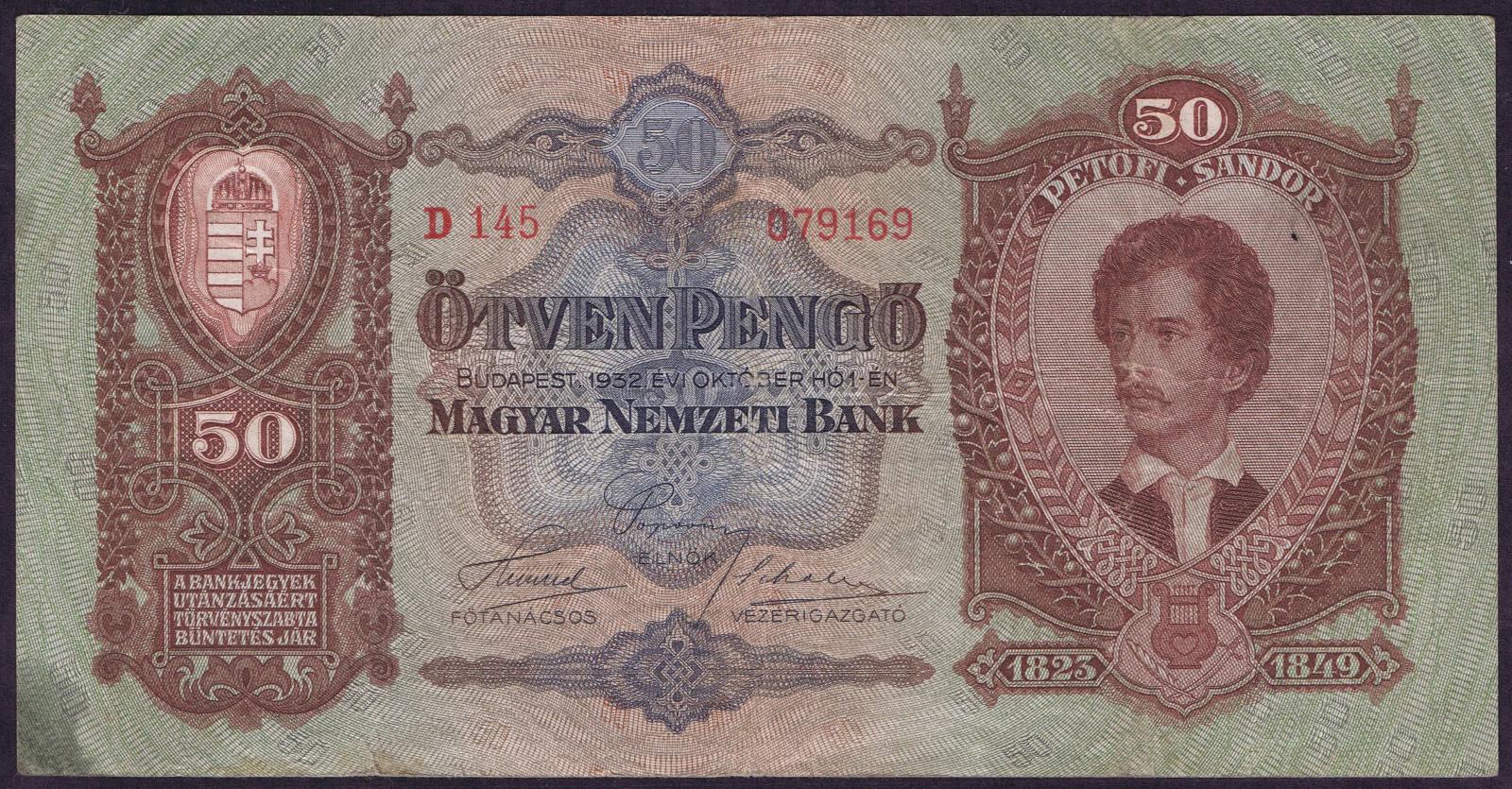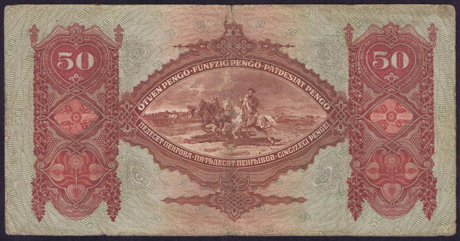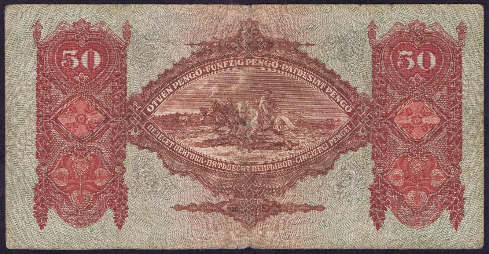 1.10.1932. Red-brown on green and blue underprint. Arms at upper left, portrait S. Petófi at right. Back: János Visky\'s painting Horse driving in Hortobágy.