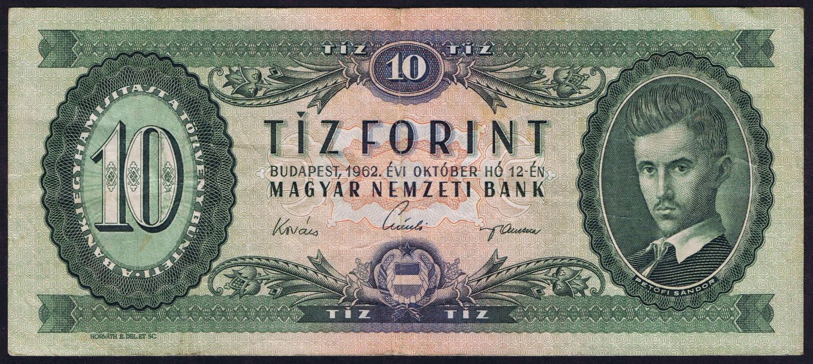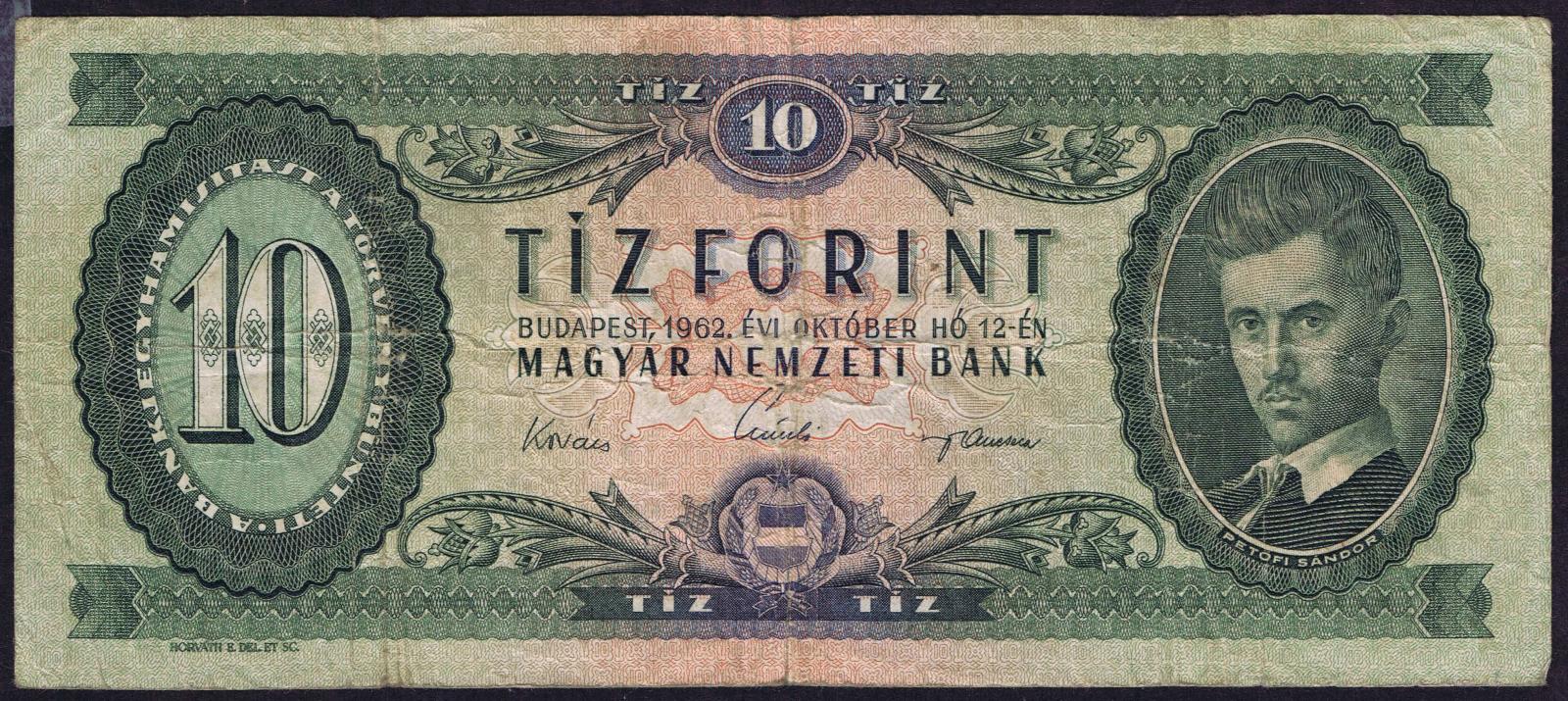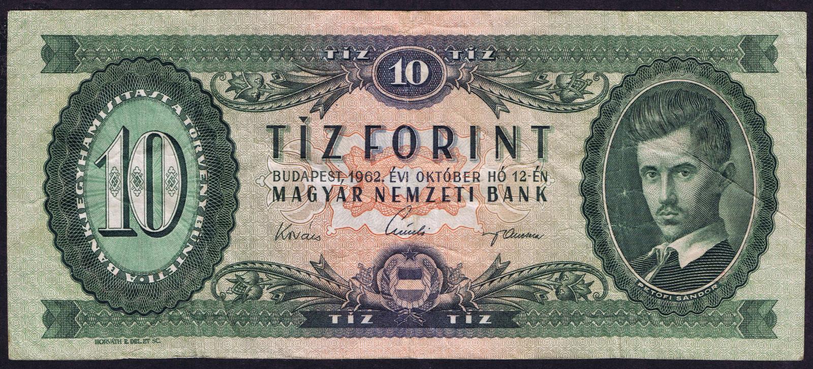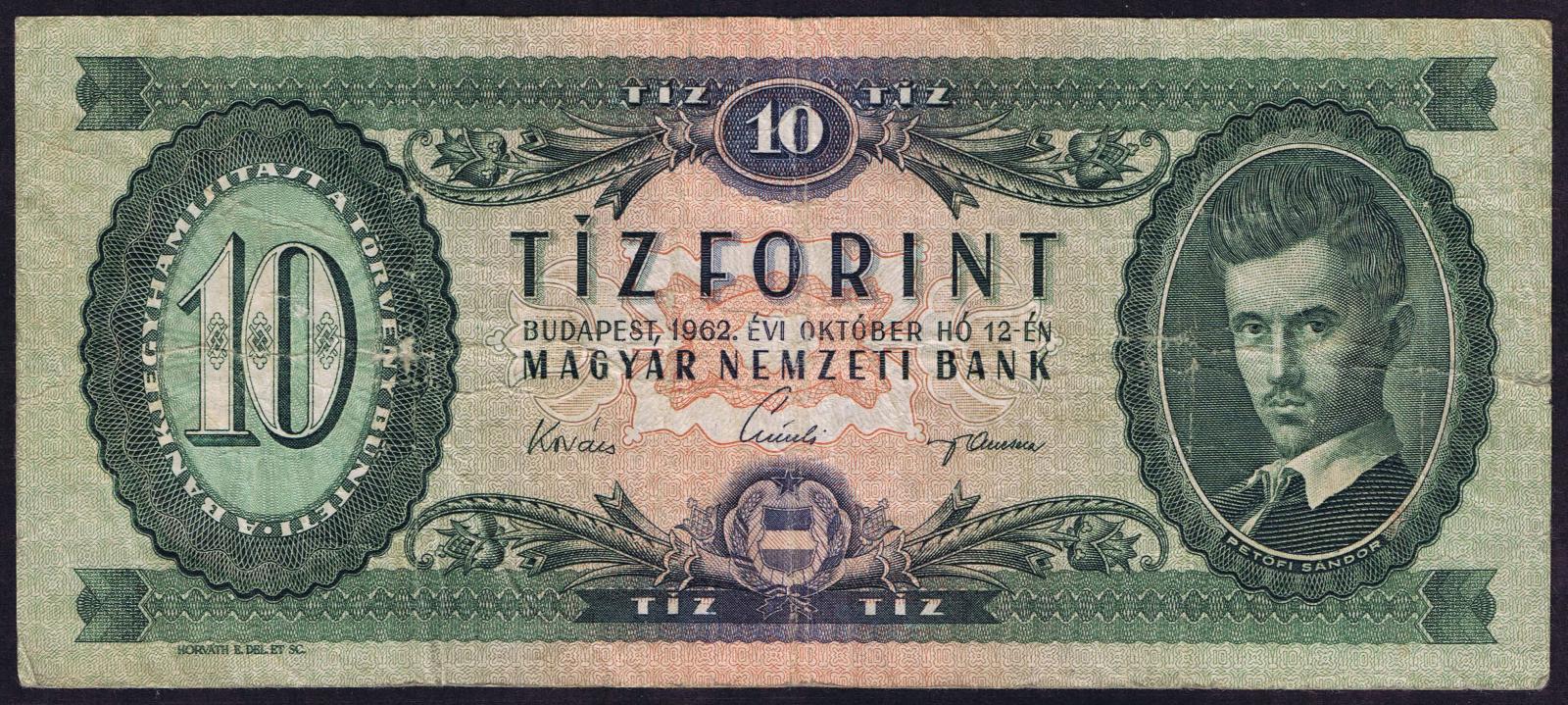 12.10.1962. Green and slate black on orange and lilac underprint. New arms and signatures. Value at left, portrait of Sandar Petofi at right. Trees and river, Birth of the Song by Janos Janko at center on back.