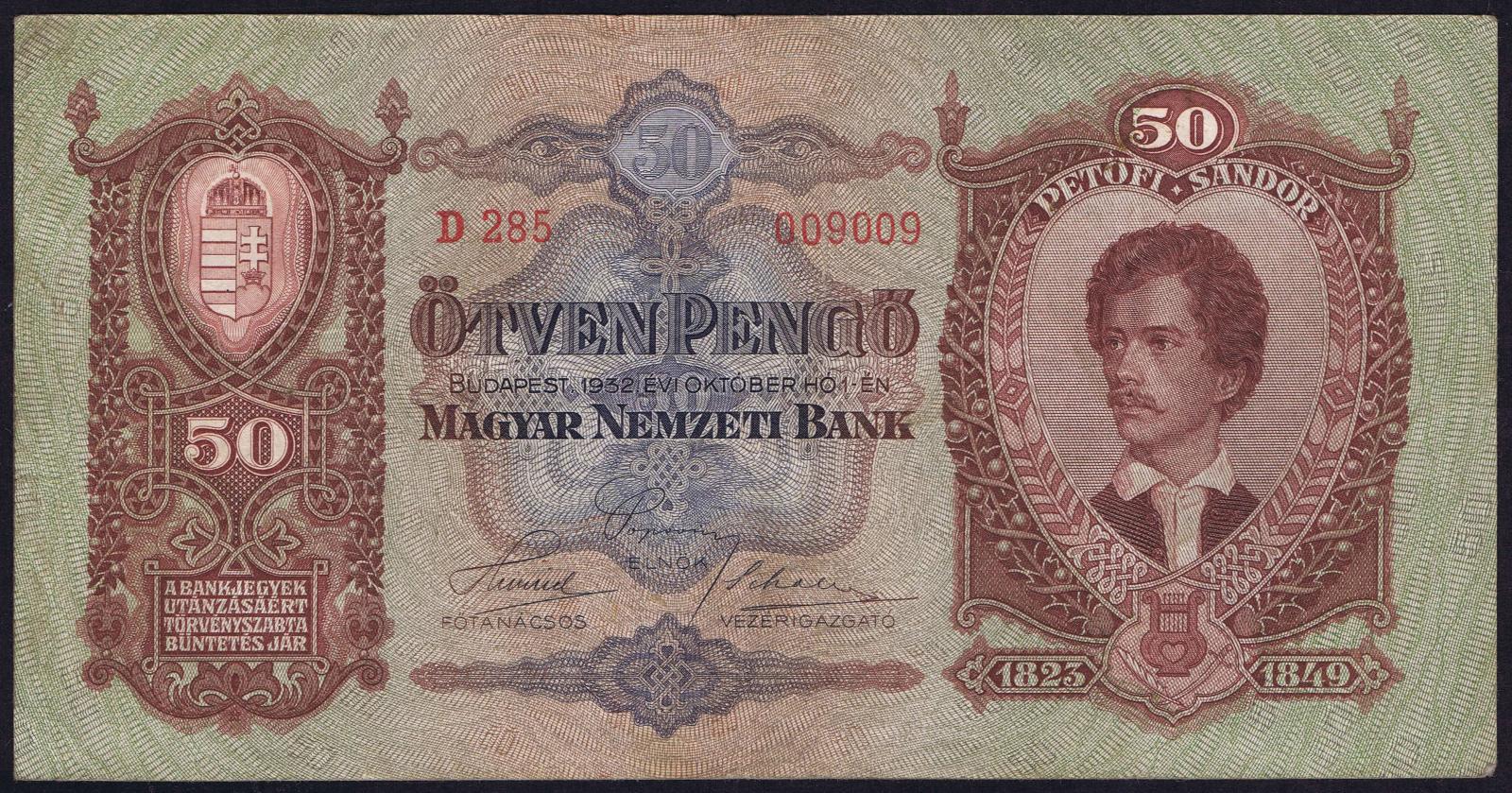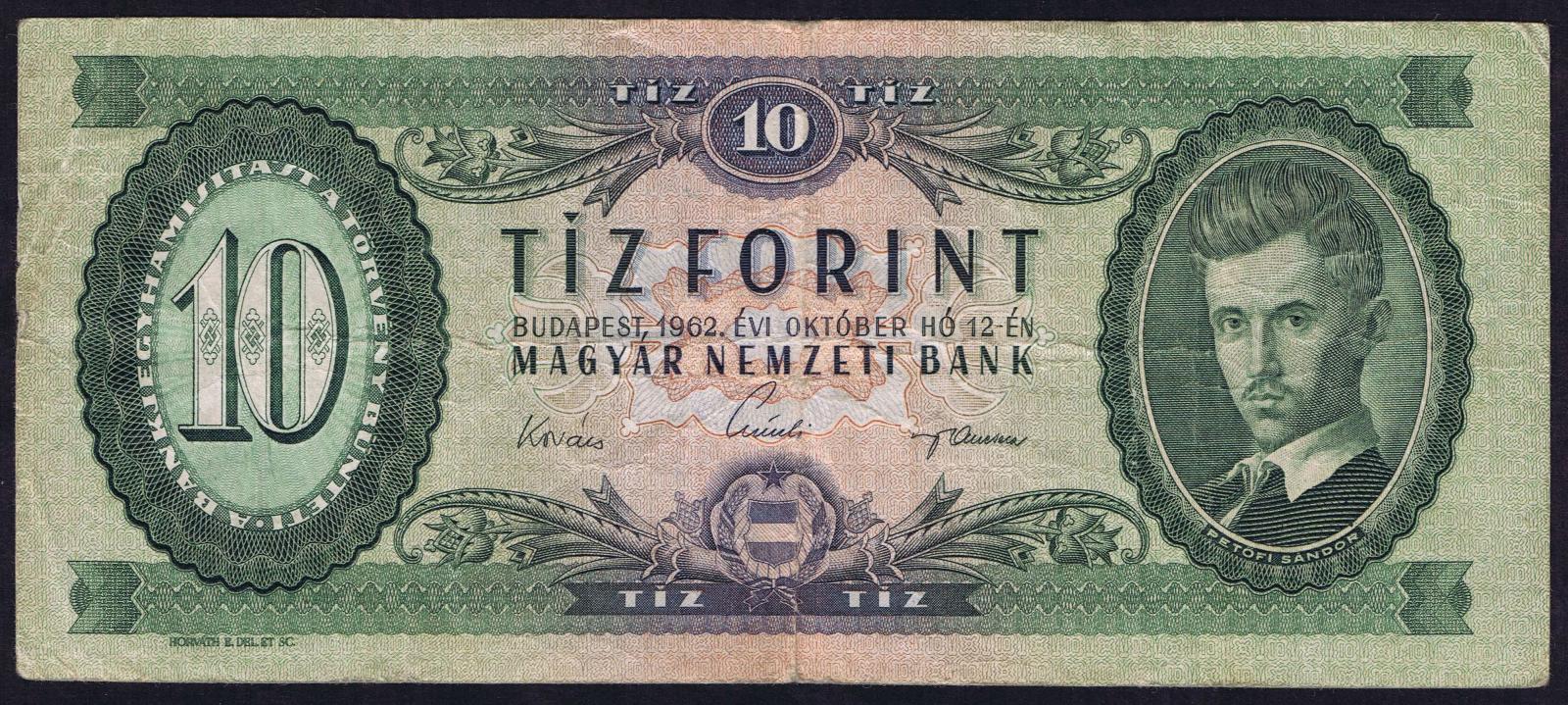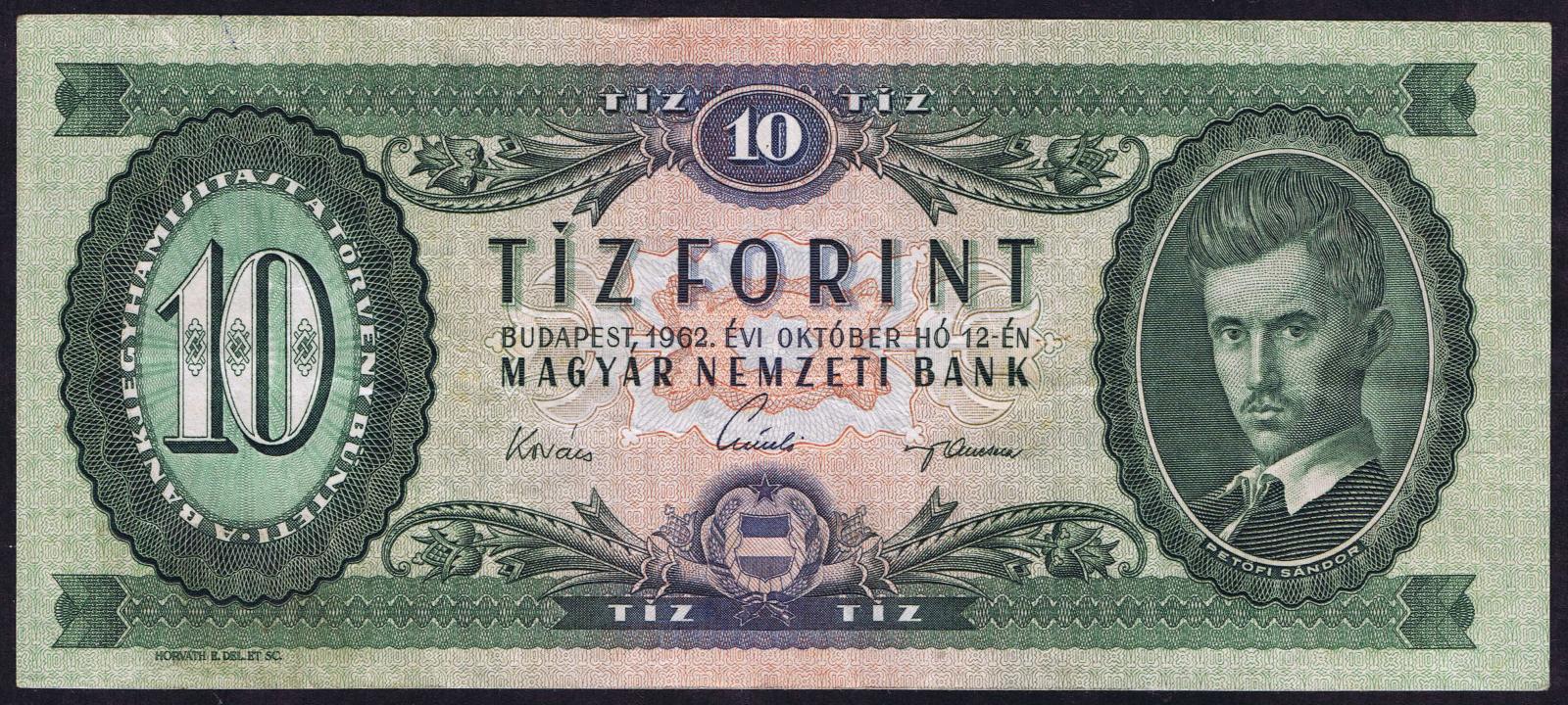 12.10.1962. Green and slate black on orange and lilac underprint. New arms and signatures. Value at left, portrait of Sandar Petofi at right. Trees and river, Birth of the Song by Janos Janko at center on back.