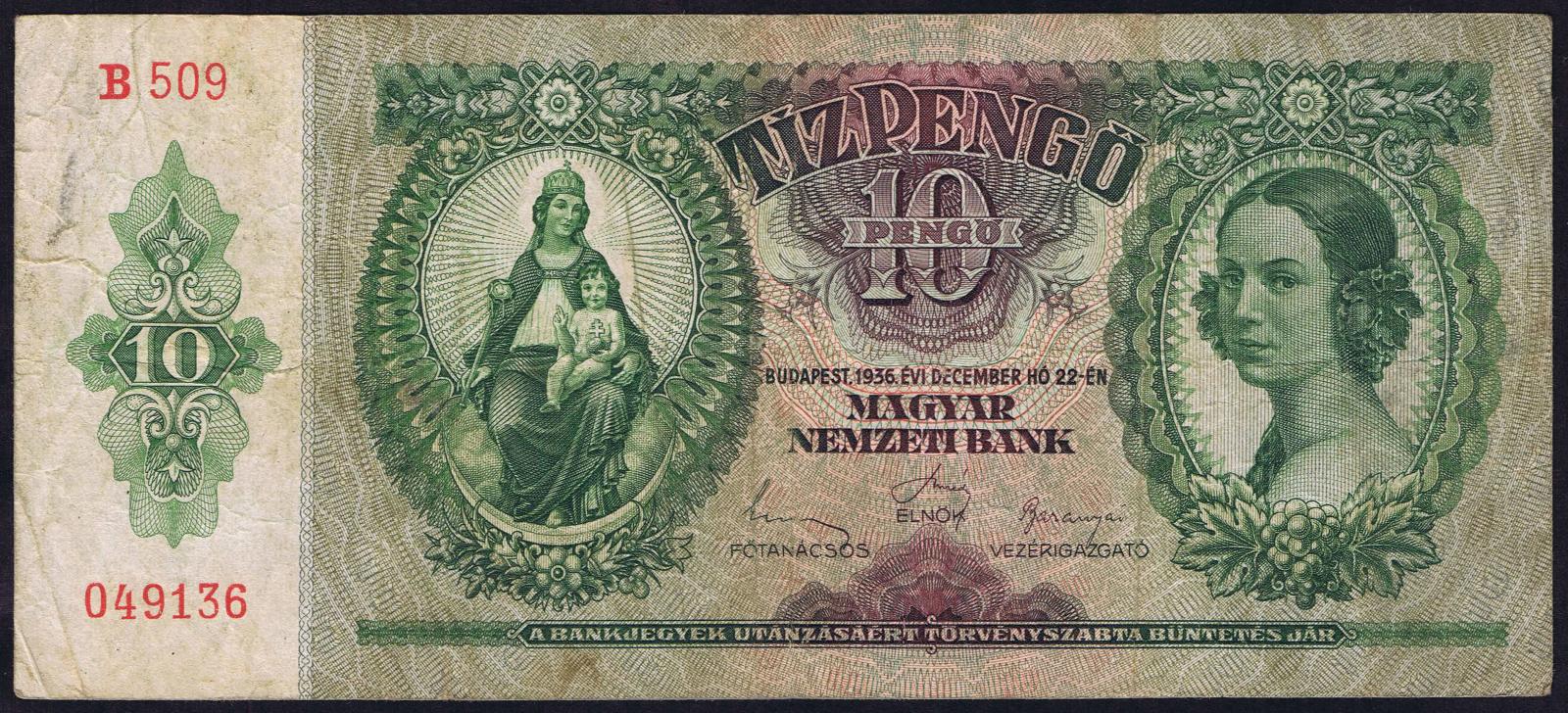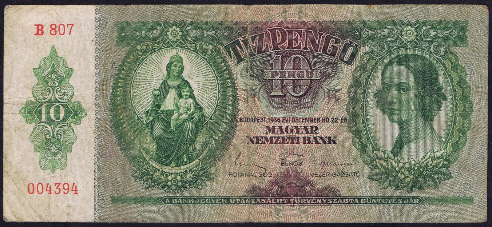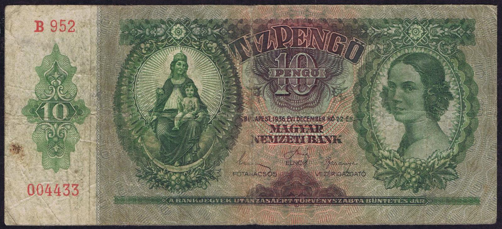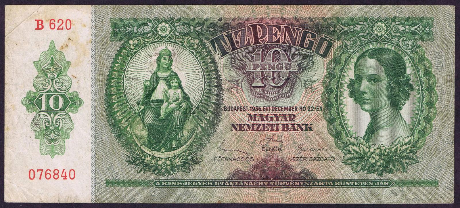 22.12.1936. Green on orange, green and purple underprint. Patrona Hungariae at left, girl at at right. Series number without asterisk. Back: Equestrian statue of St. Stephan.