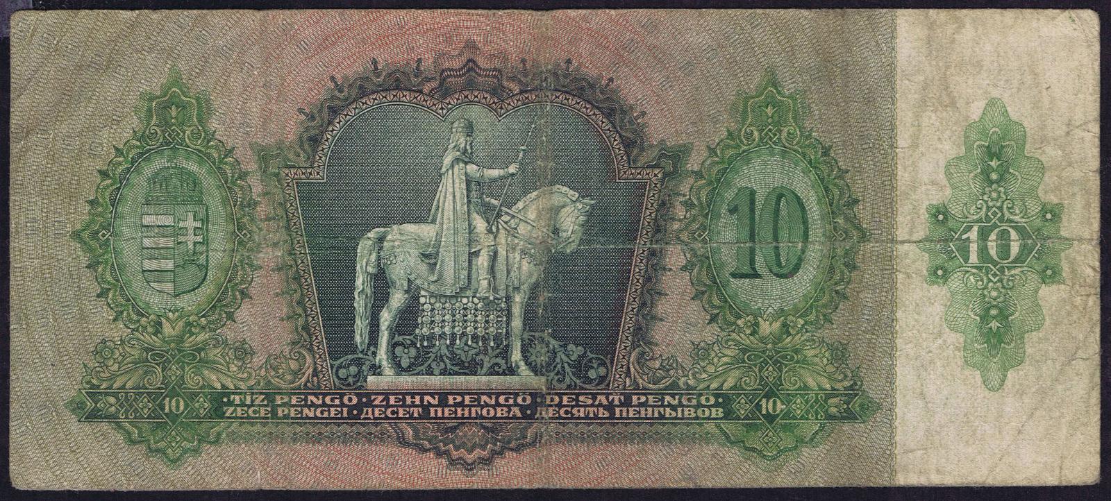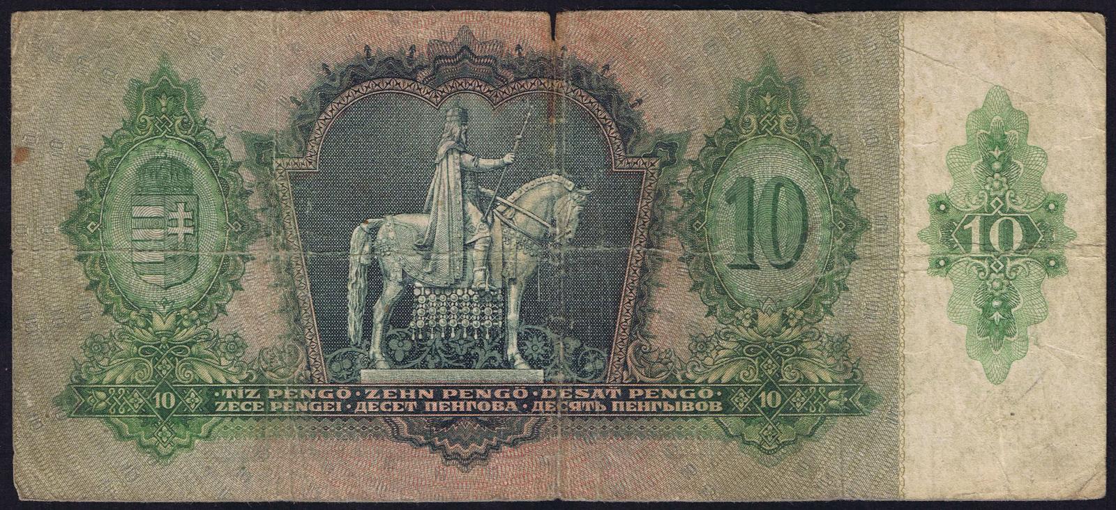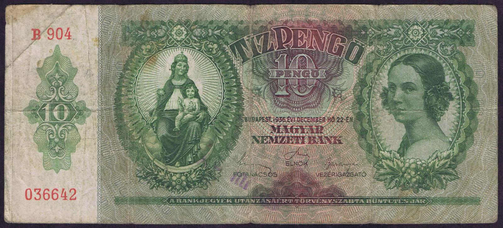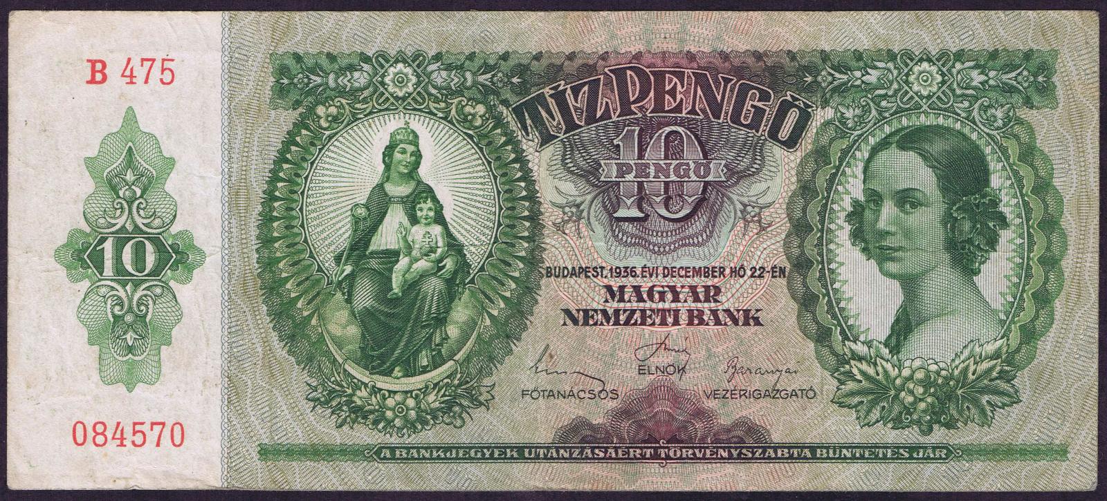 22.12.1936. Green on orange, green and purple underprint. Patrona Hungariae at left, girl at at right. Series number without asterisk. Back: Equestrian statue of St. Stephan.