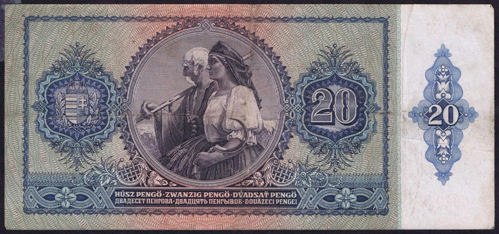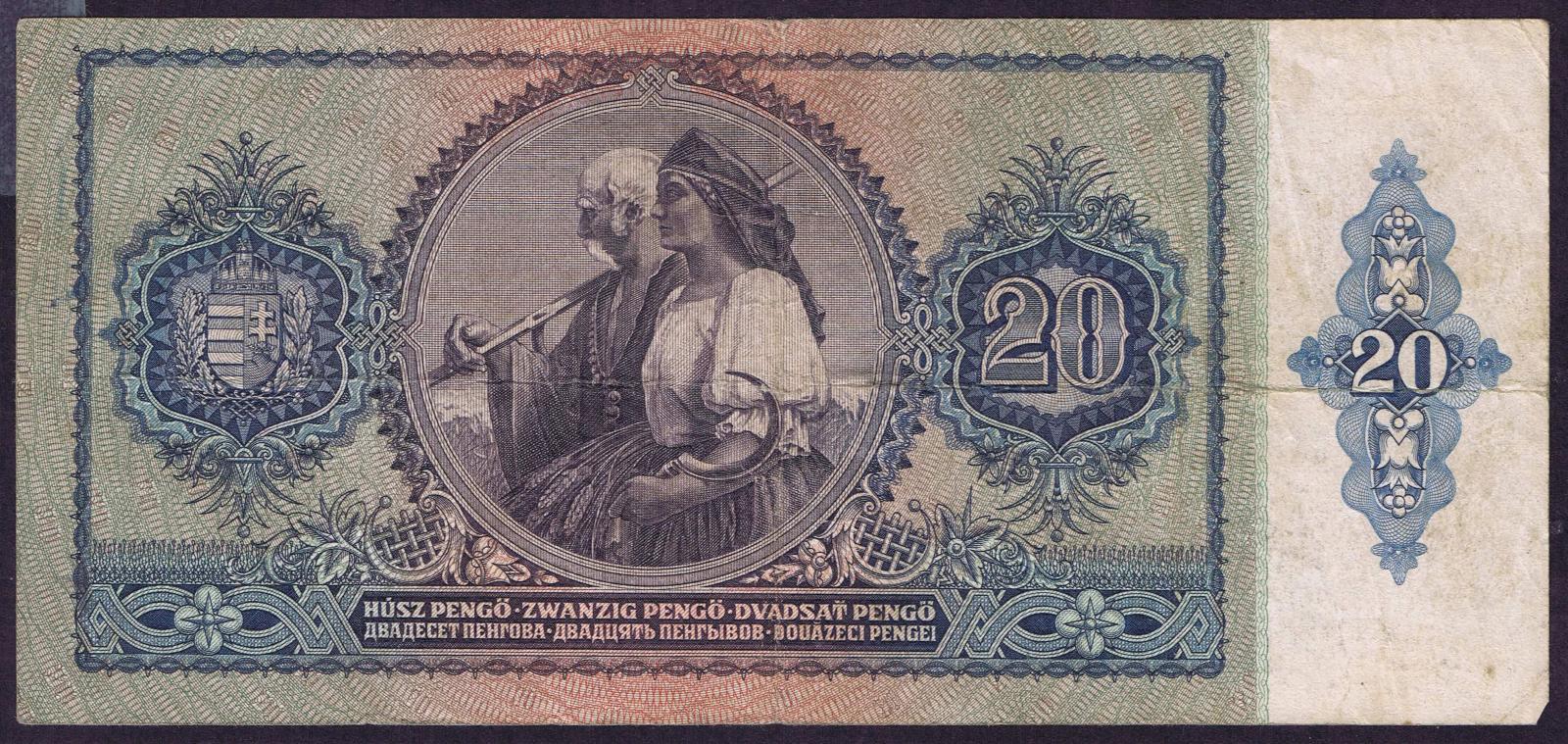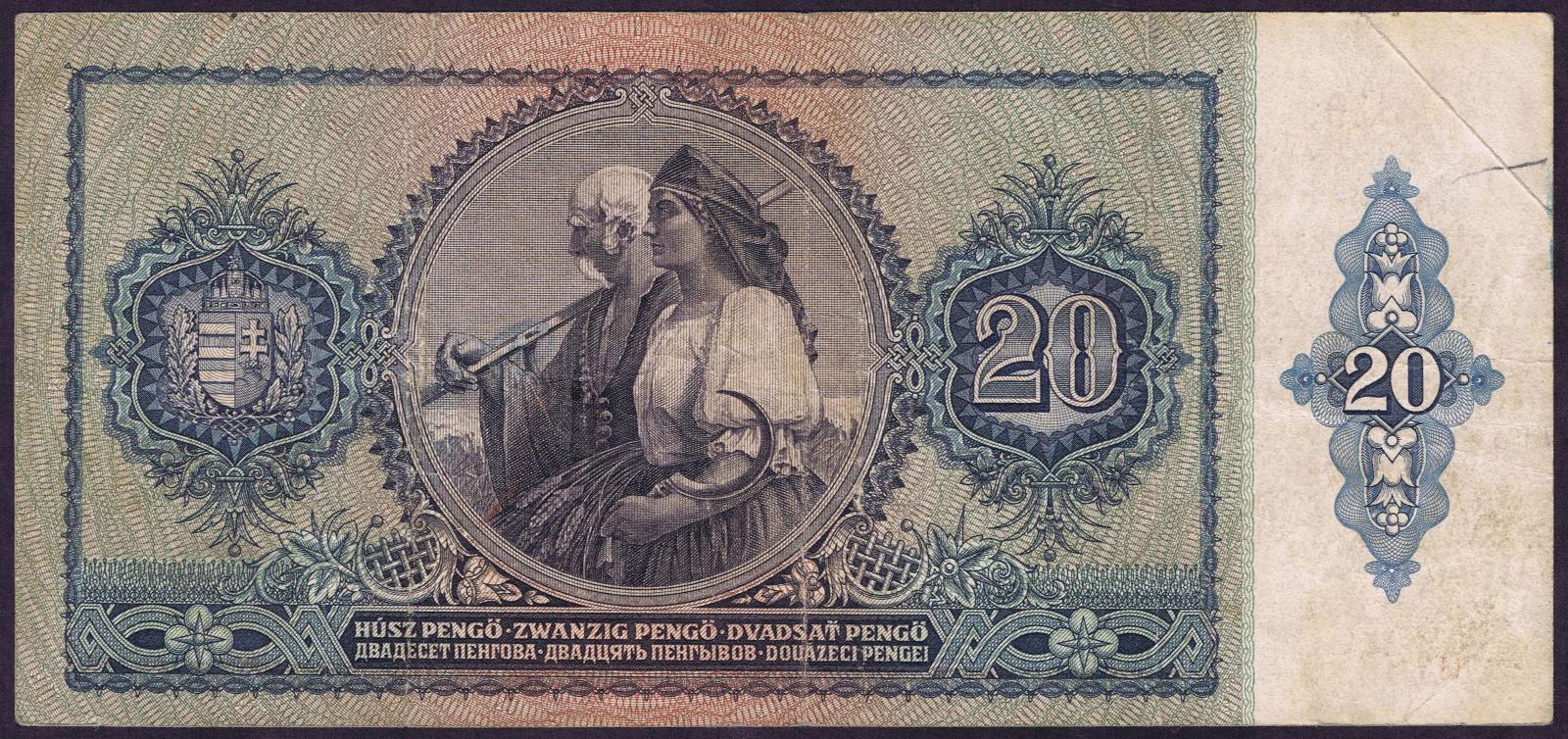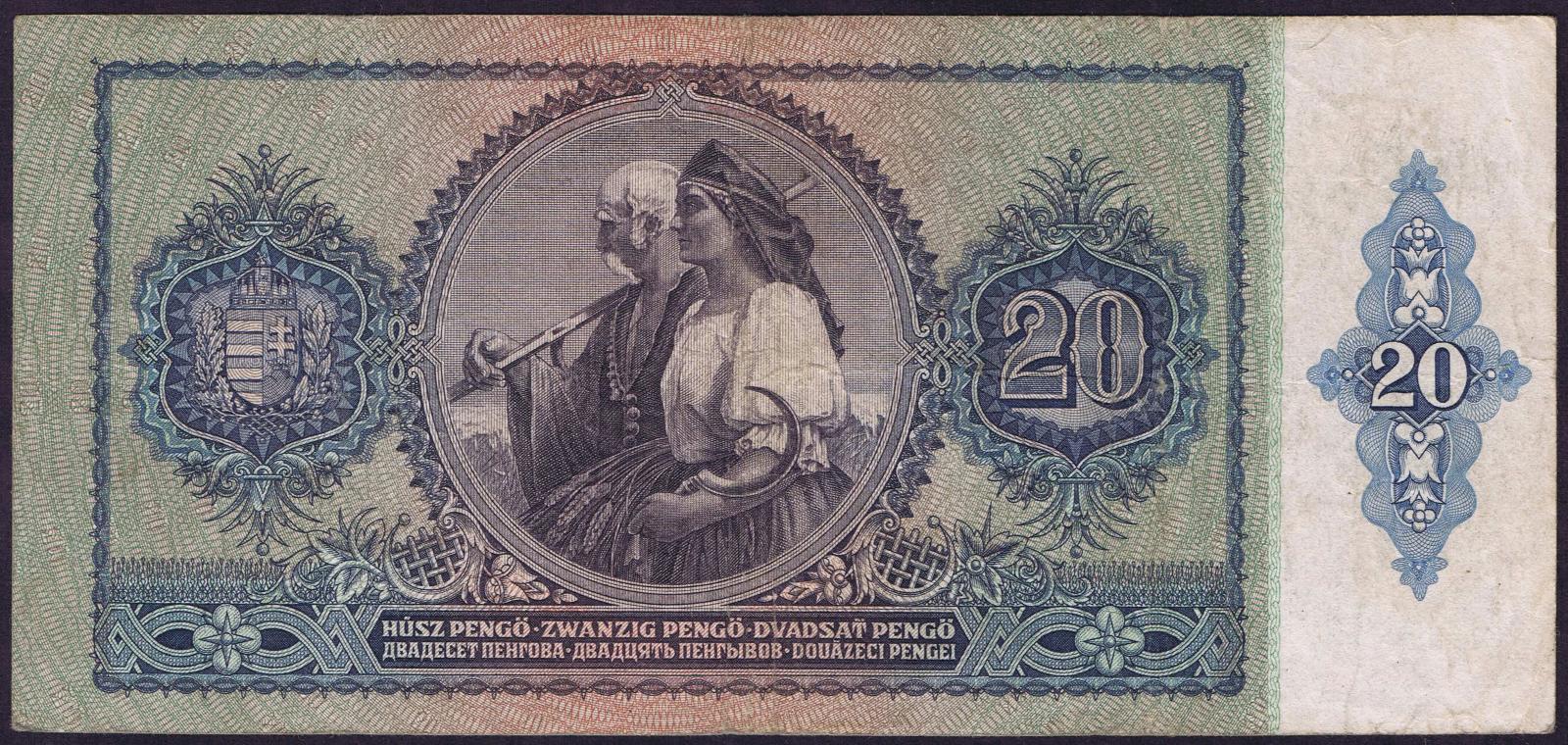 22.12.1936. Green on orange, green and purple underprint. Patrona Hungariae at left, girl at at right. Series number without asterisk. Back: Equestrian statue of St. Stephan.