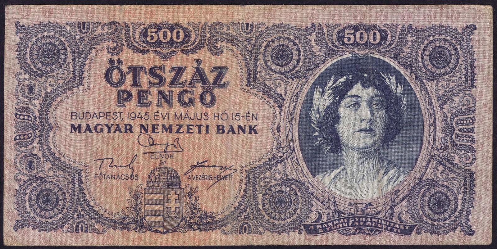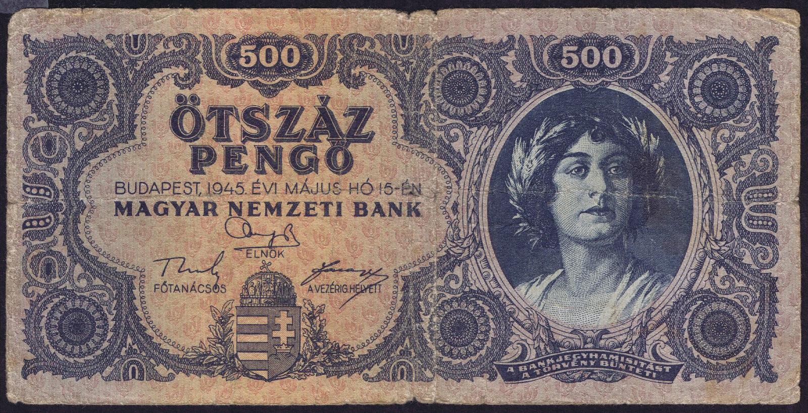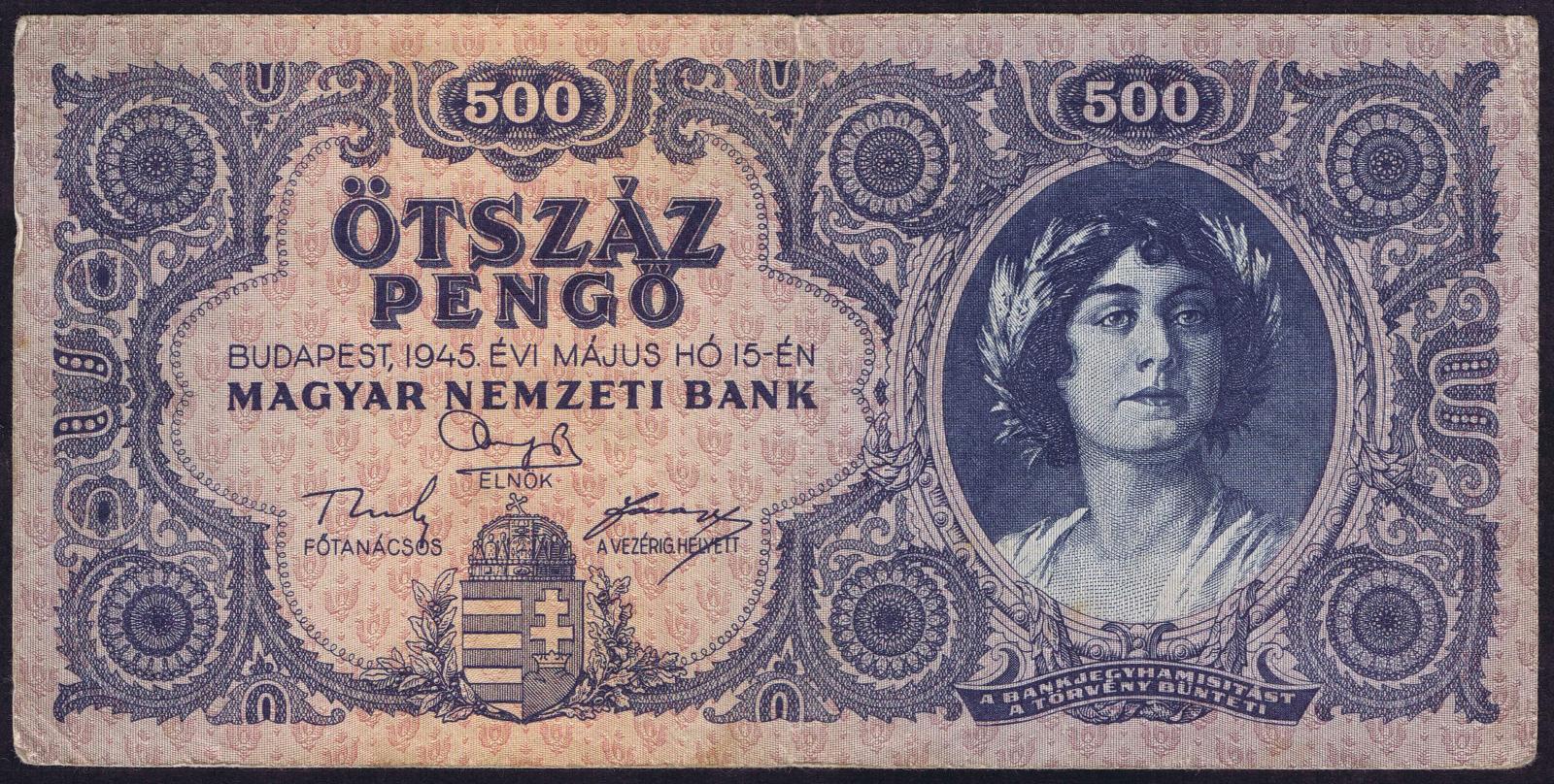 5.4.1945. Purple on light blue and lilac underprint. Portrait King Matayas at right. Back: Royal Palace at Budapest. Without a watermark. BUNTETES at bottom right on face with accent over N.