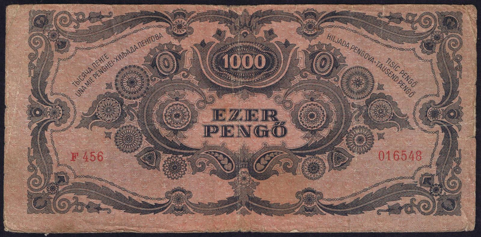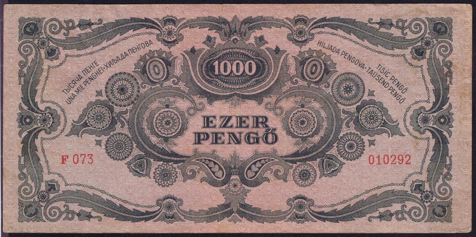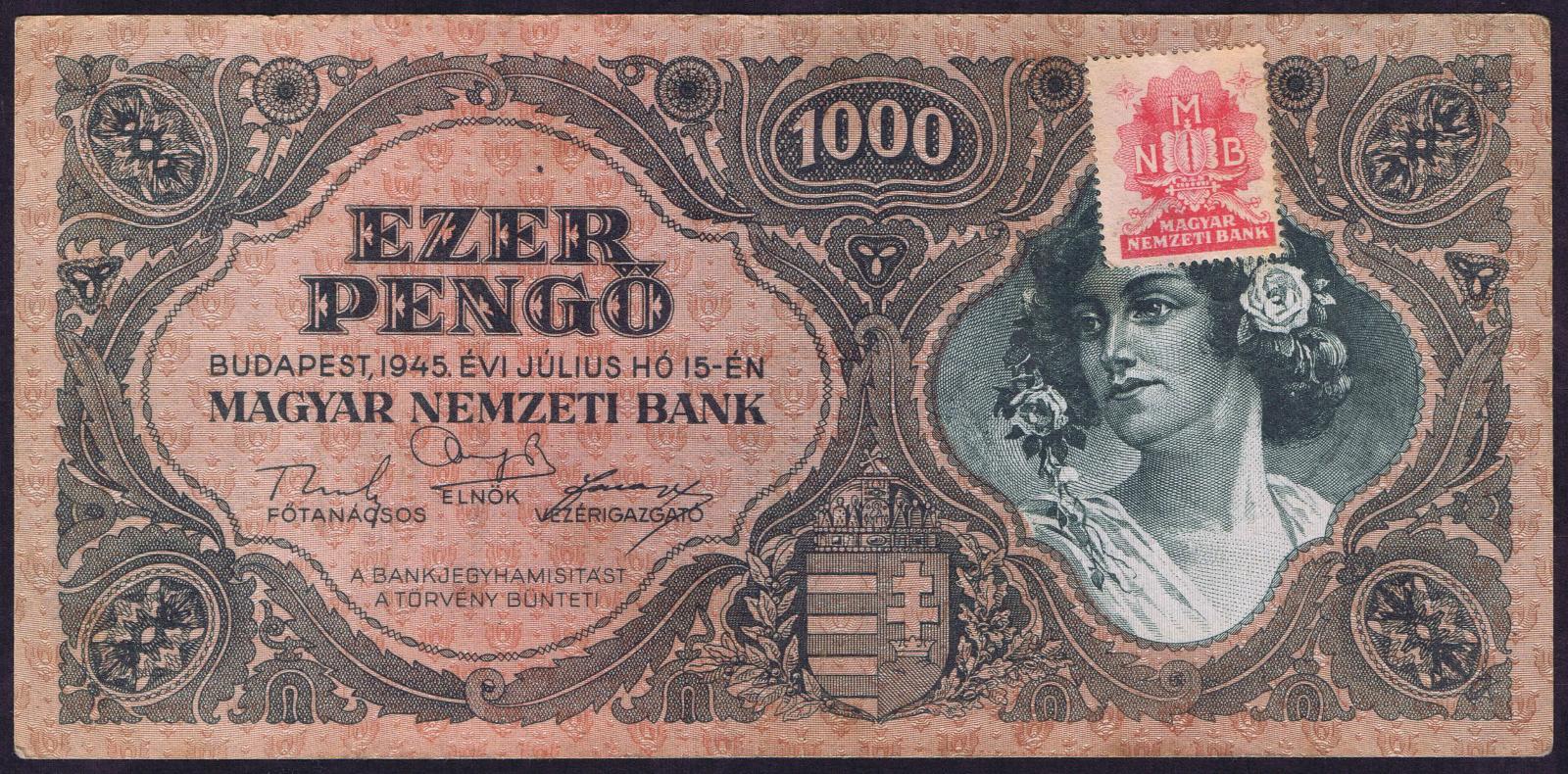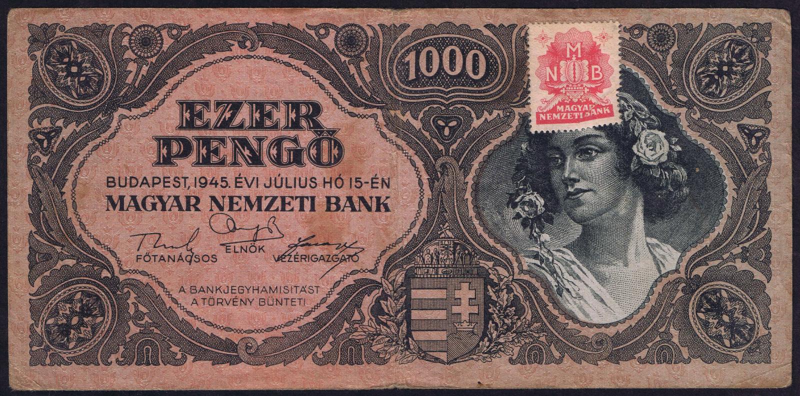 5.4.1945. Purple on light blue and lilac underprint. Portrait King Matayas at right. Back: Royal Palace at Budapest. Without a watermark. BUNTETES at bottom right on face with accent over N.