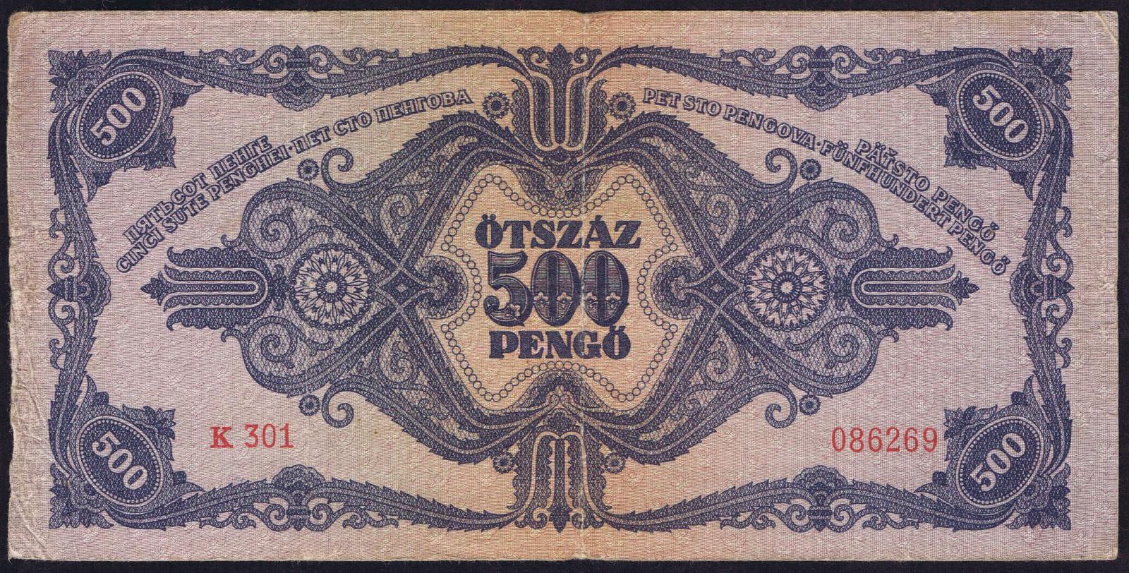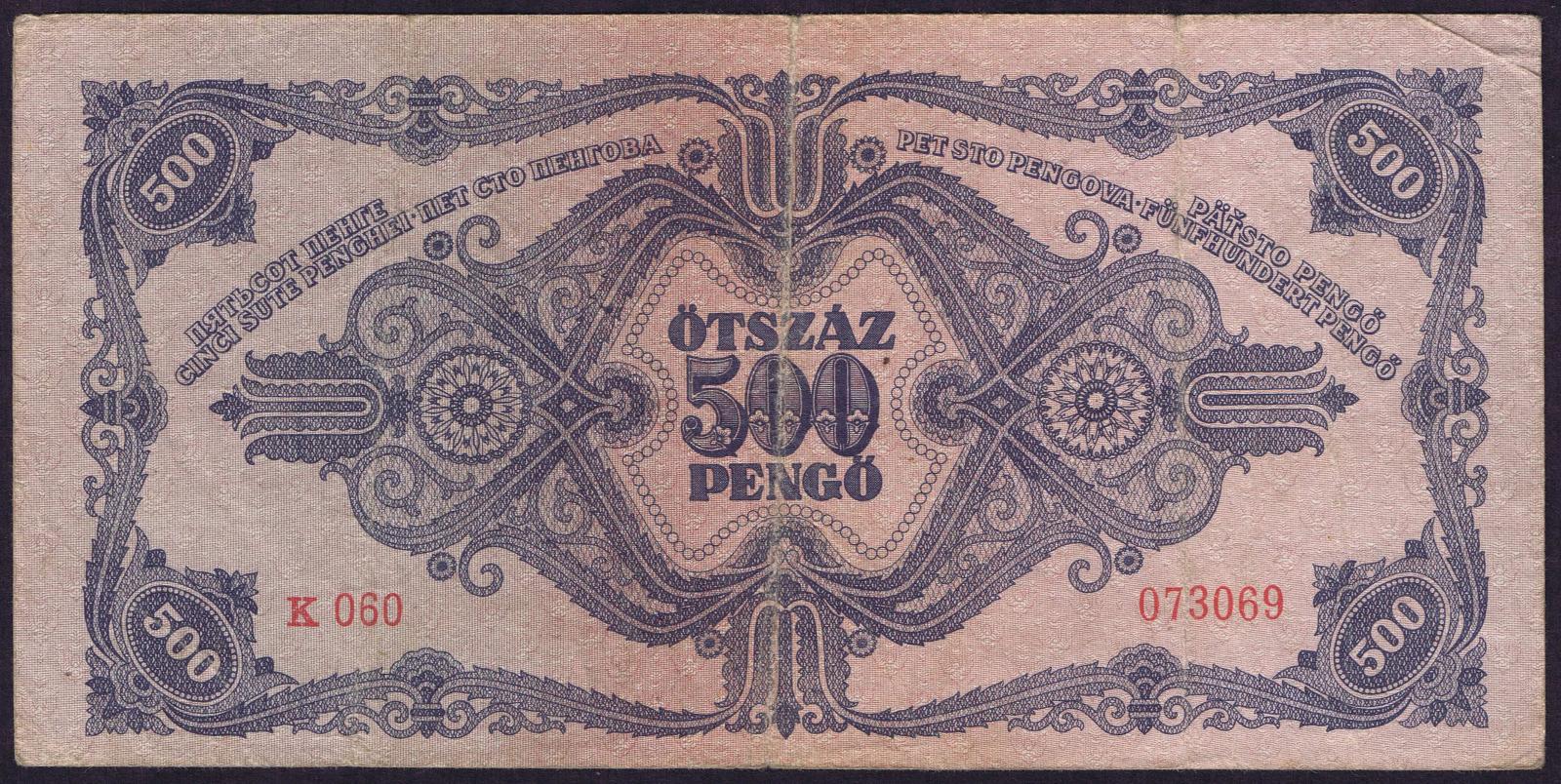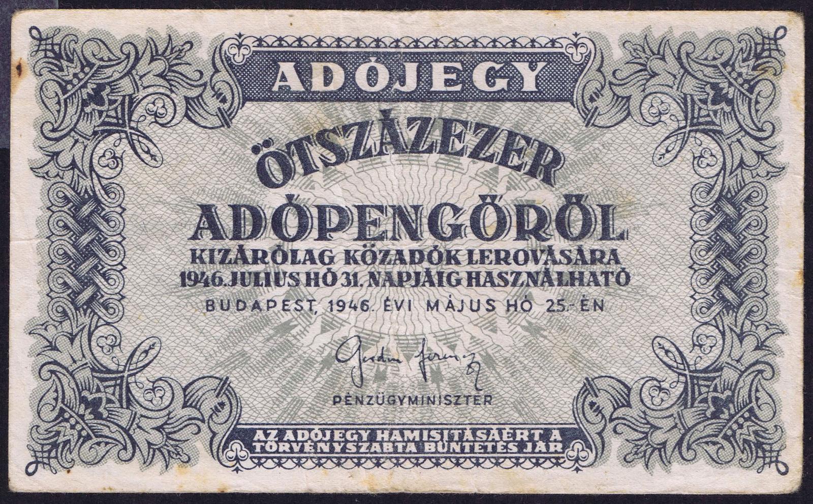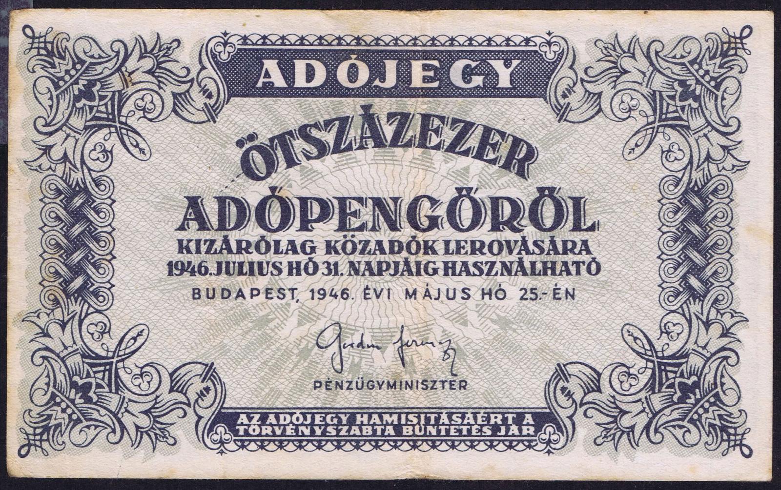 25.5.1946. 500,000 (Ötszazezer) Adópengö. Dark blue. Back: Arms in underprint at center. White paper without watermark, without serial number.
