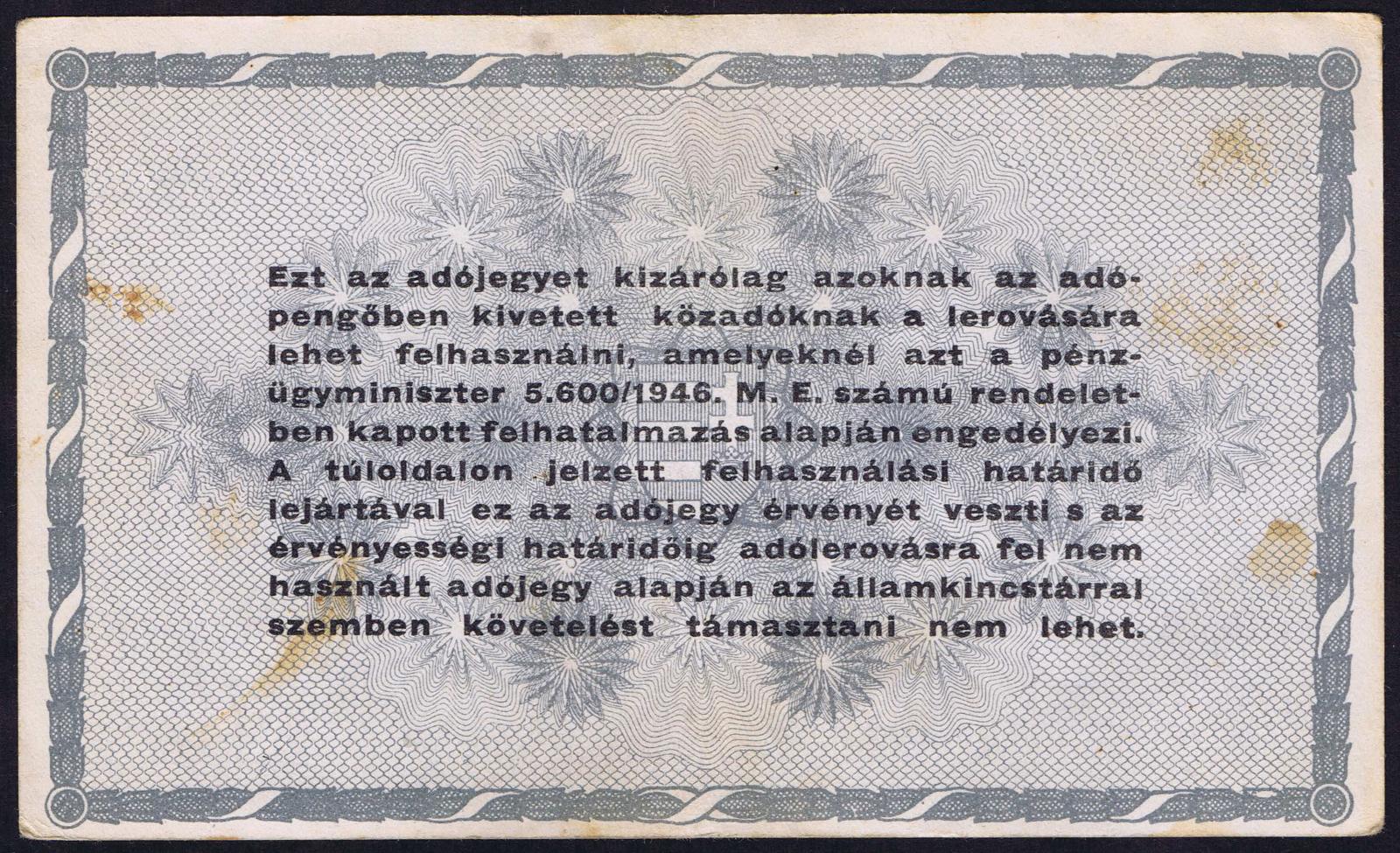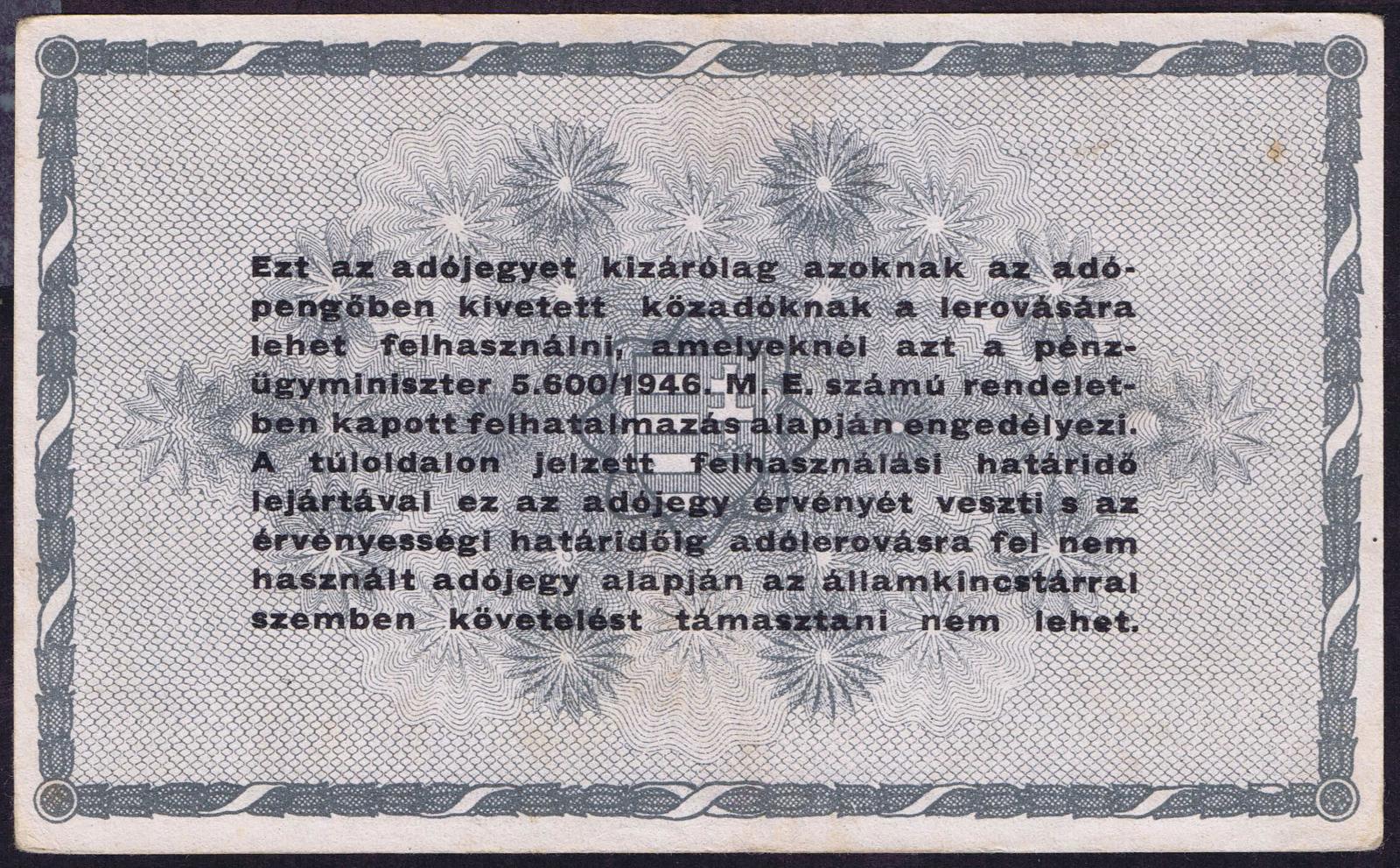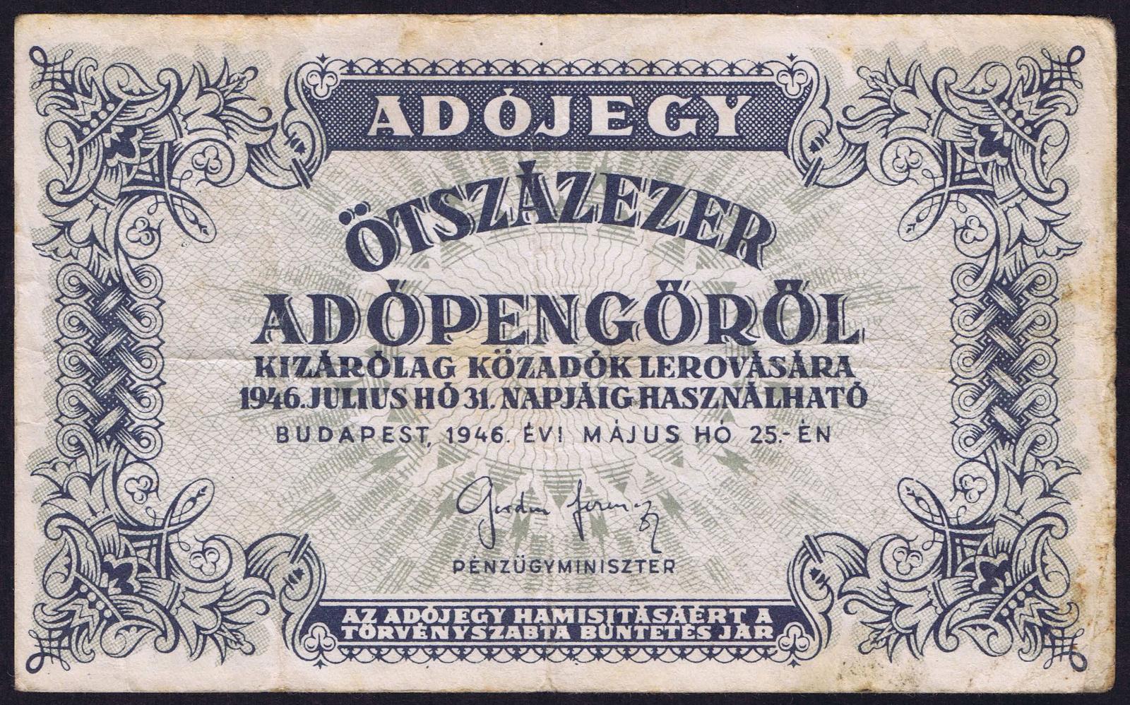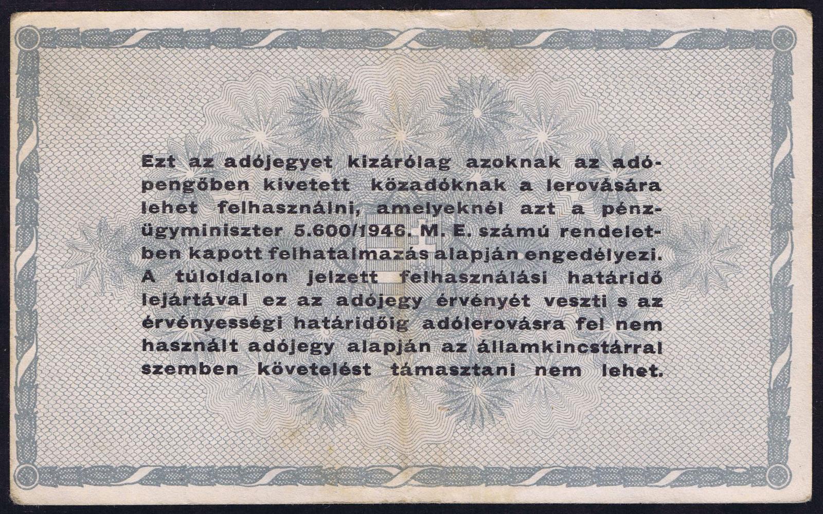 28.5.1946. 100,000 (Egyszázezer) Adópengö. Brown-lilac on pink underprint. Back: Arms in underprint at center. White paper without watermark, without serial number. 5.600/1946. M.E. on back.