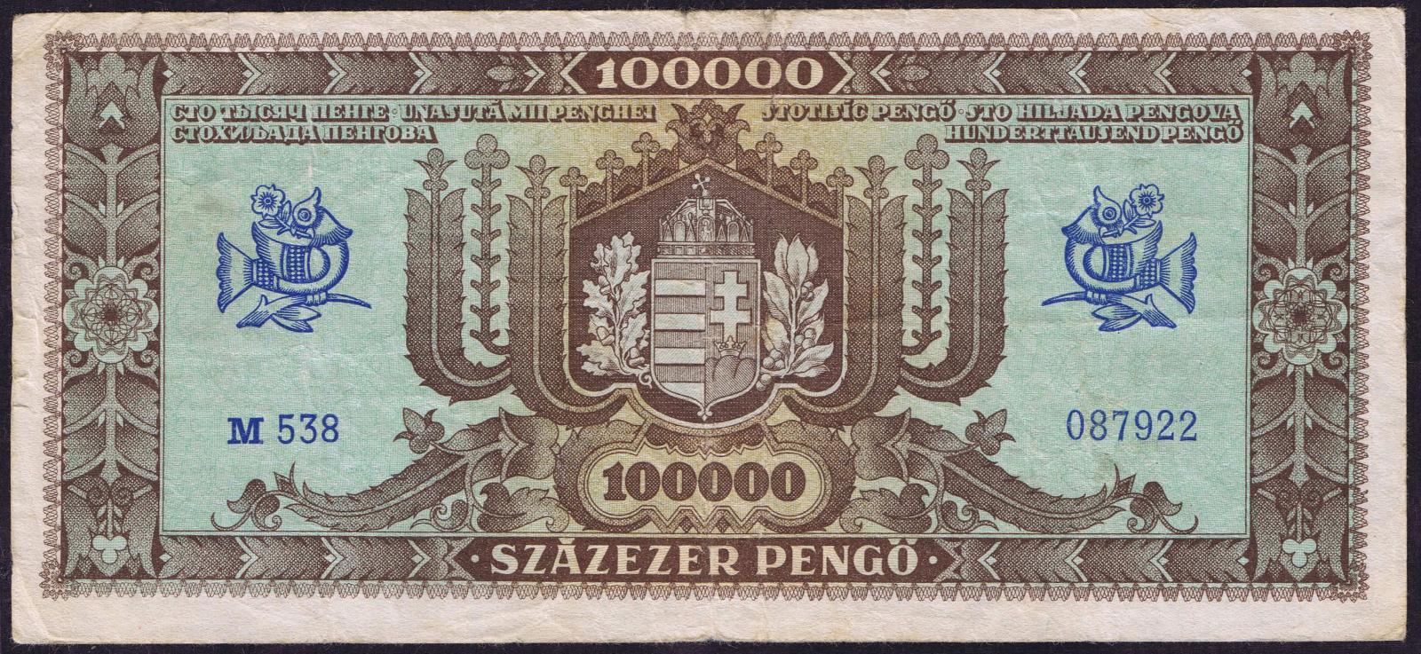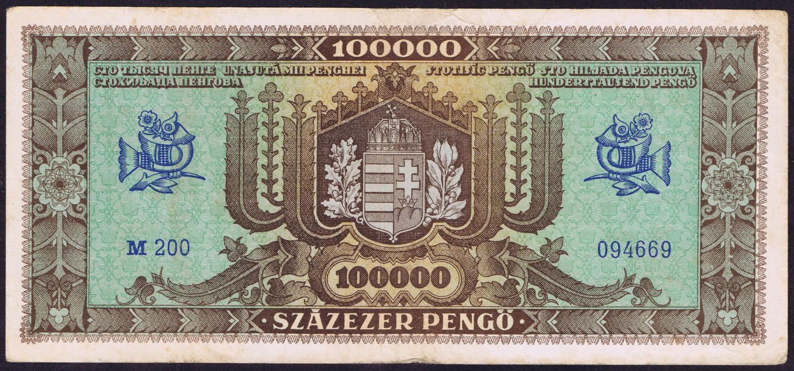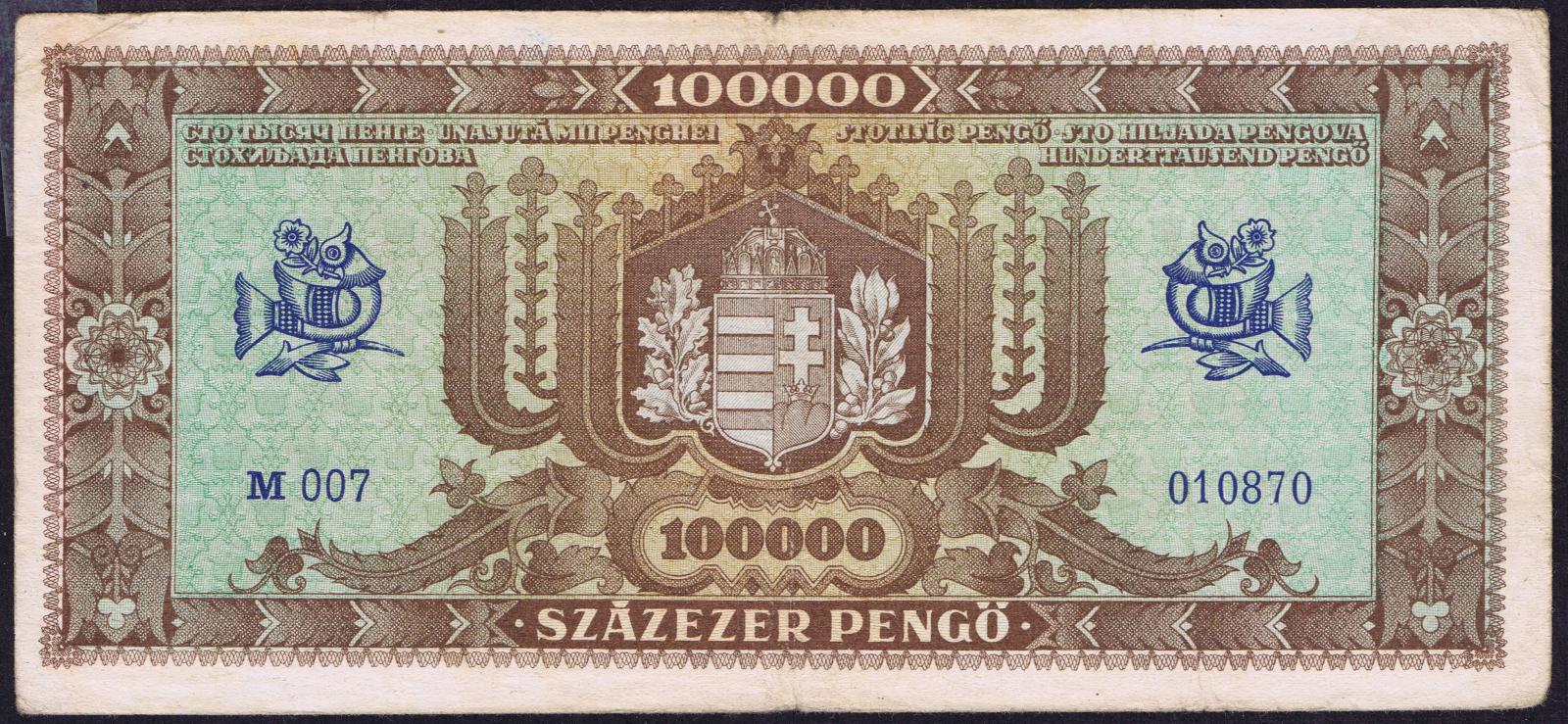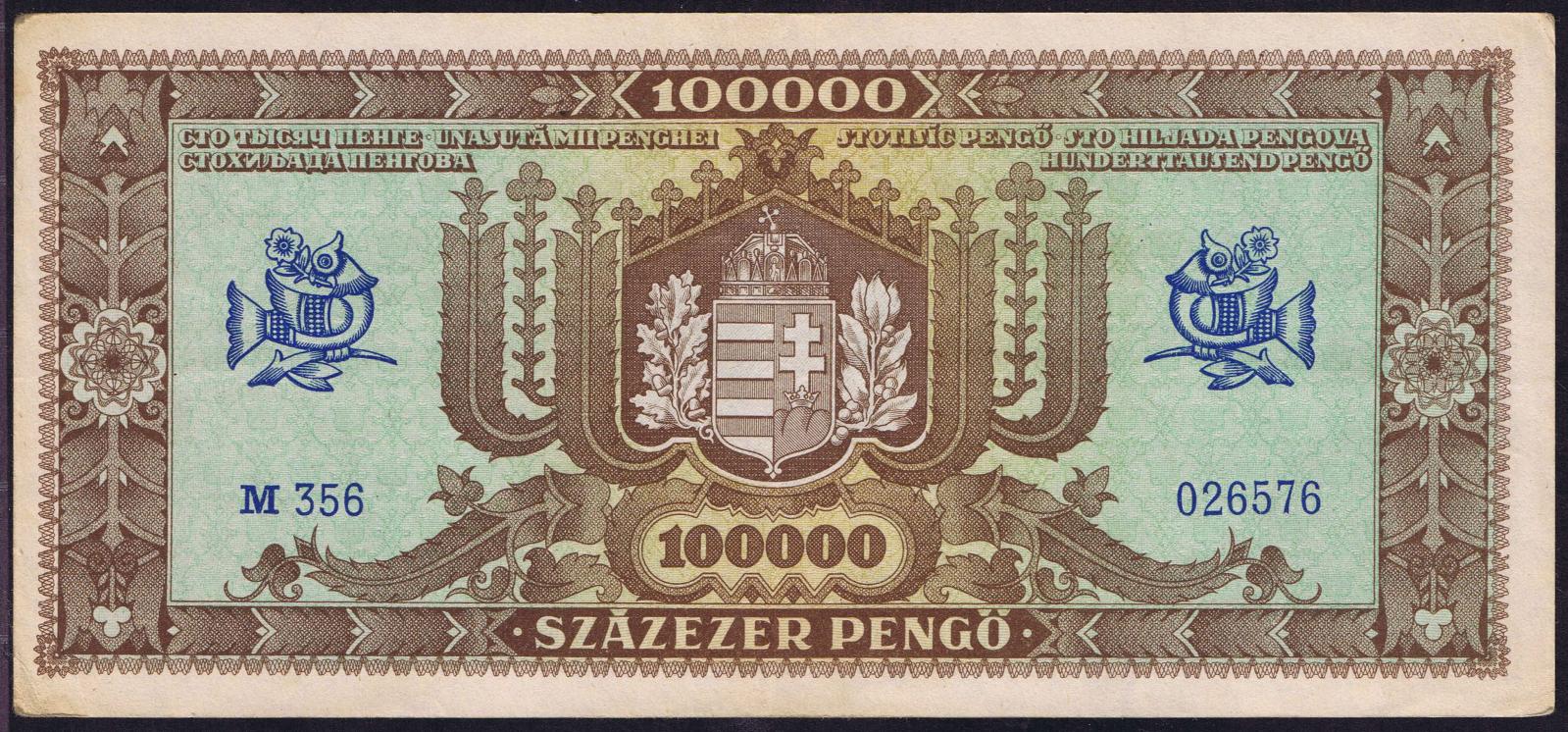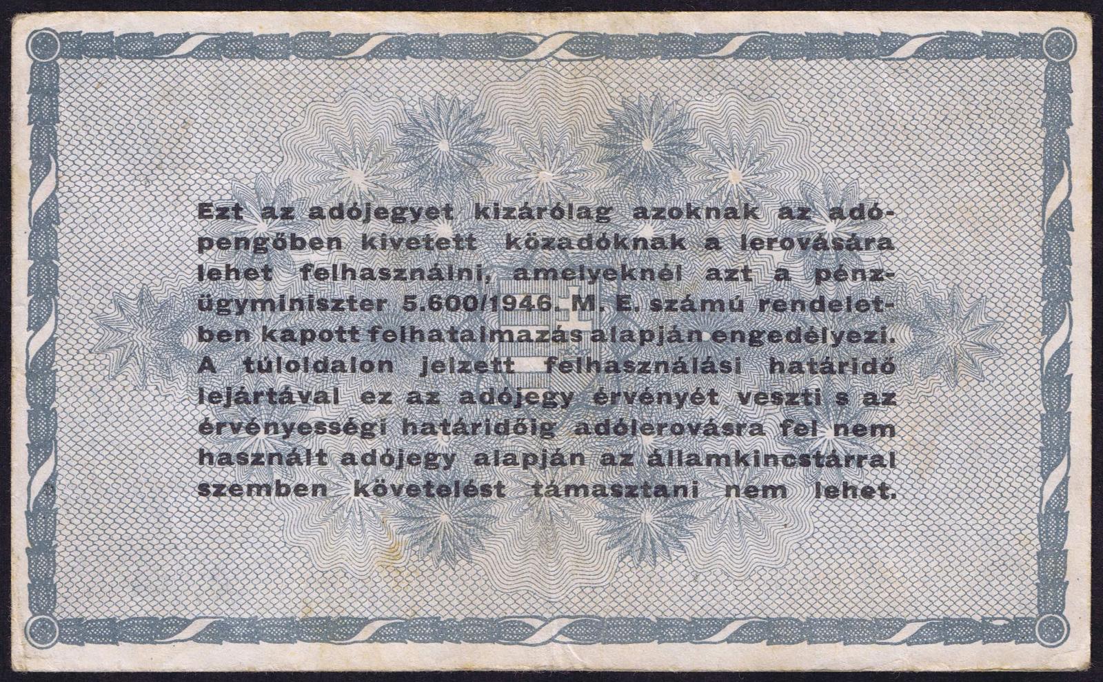 28.5.1946. 100,000 (Egyszázezer) Adópengö. Brown-lilac on pink underprint. Back: Arms in underprint at center. White paper without watermark, without serial number. 5.600/1946. M.E. on back.