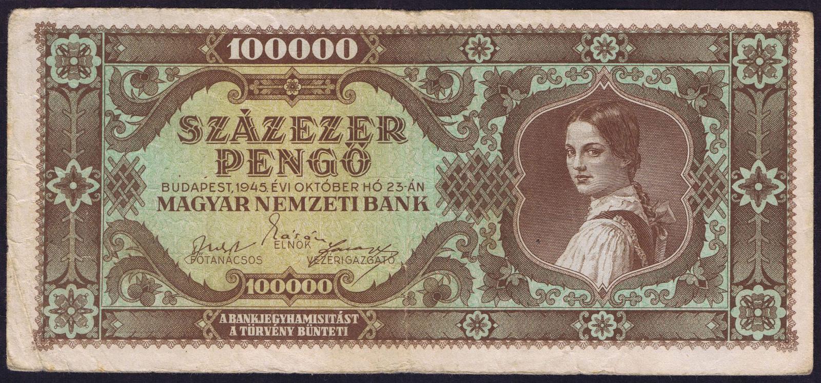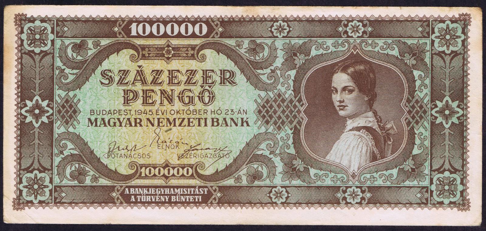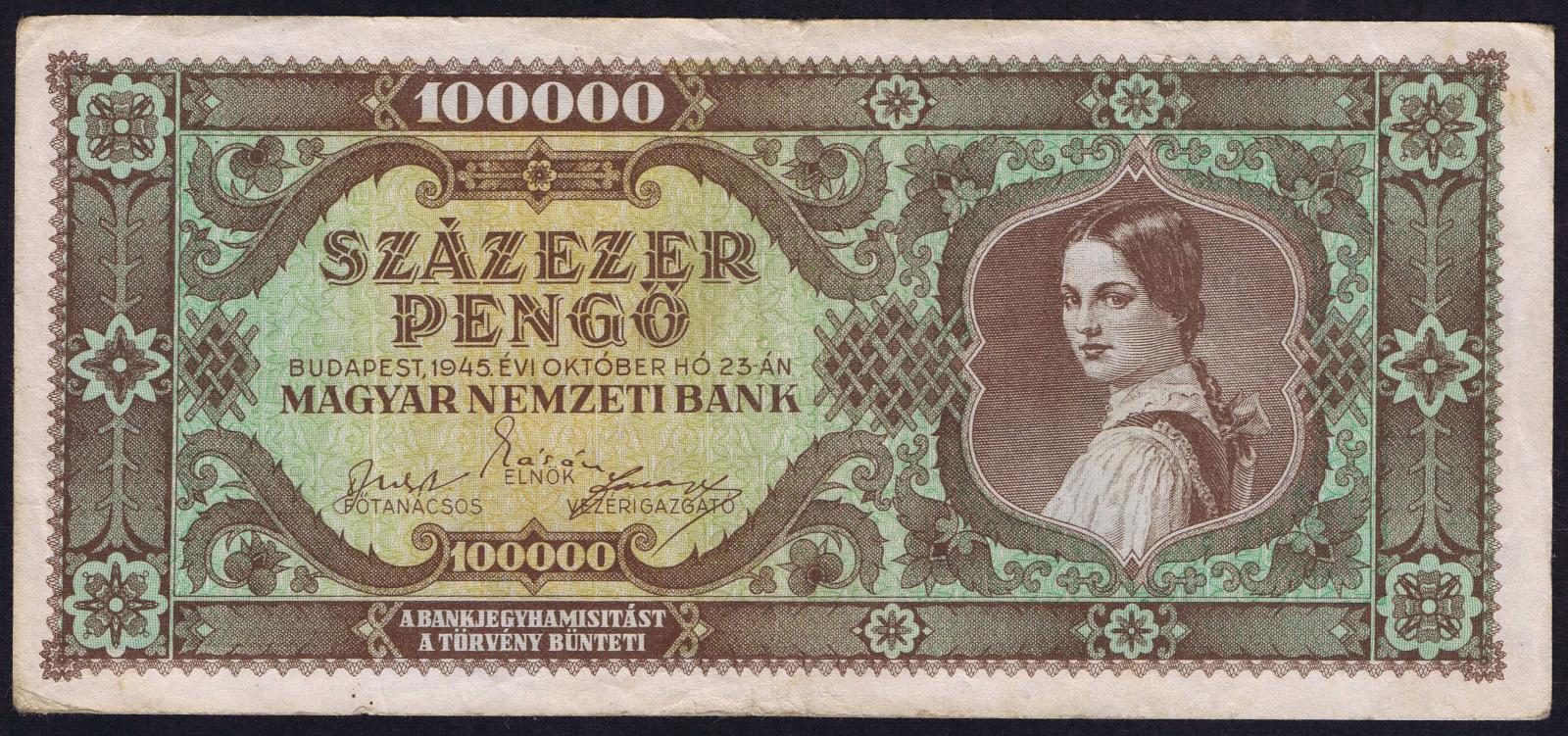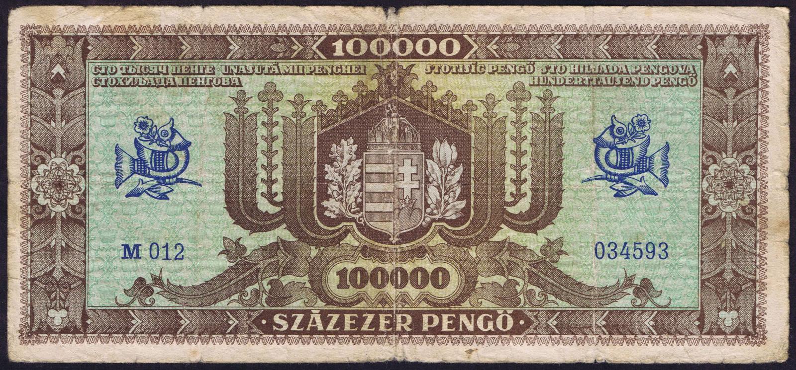 28.5.1946. 100,000 (Egyszázezer) Adópengö. Brown-lilac on pink underprint. Back: Arms in underprint at center. White paper without watermark, without serial number. 5.600/1946. M.E. on back.