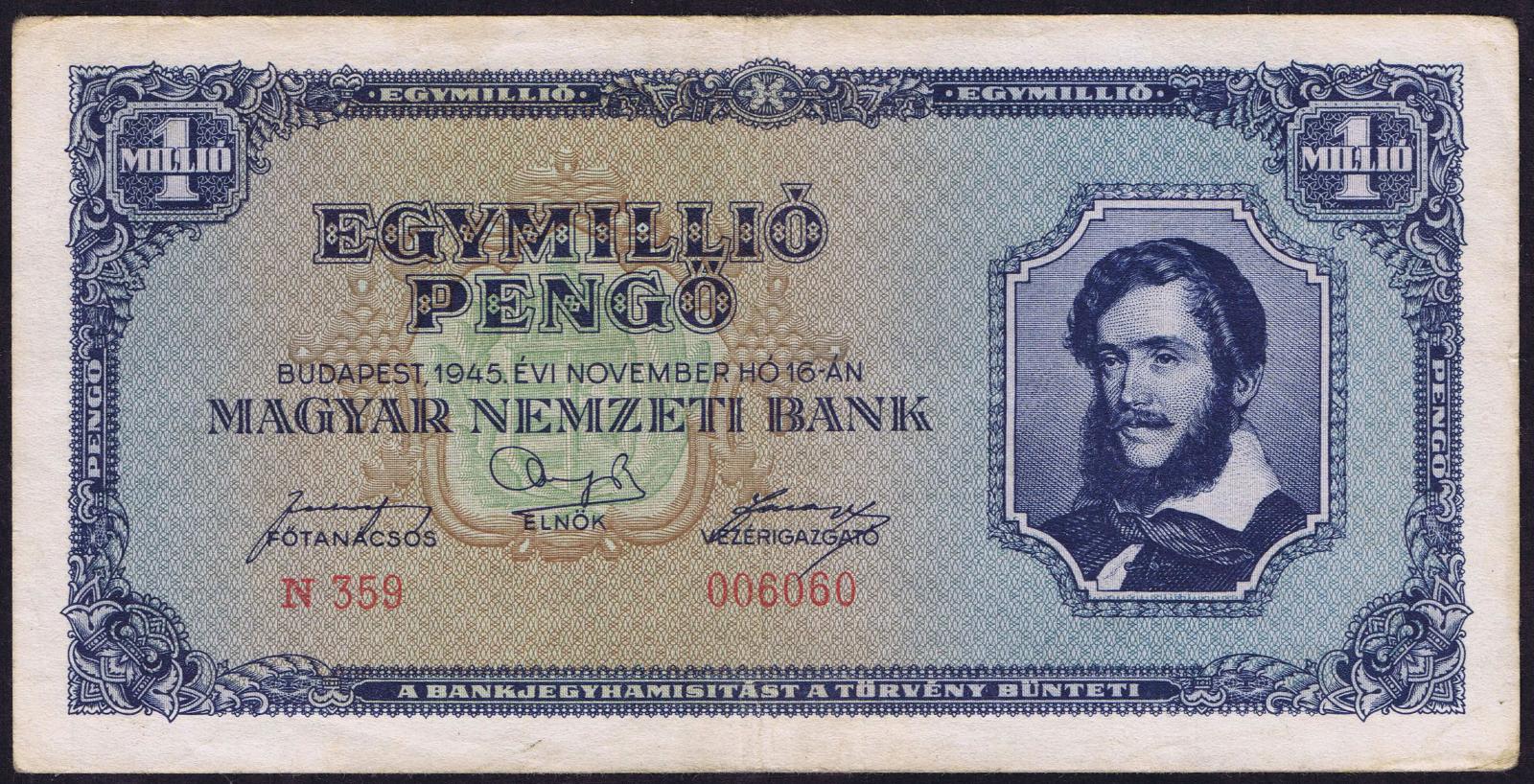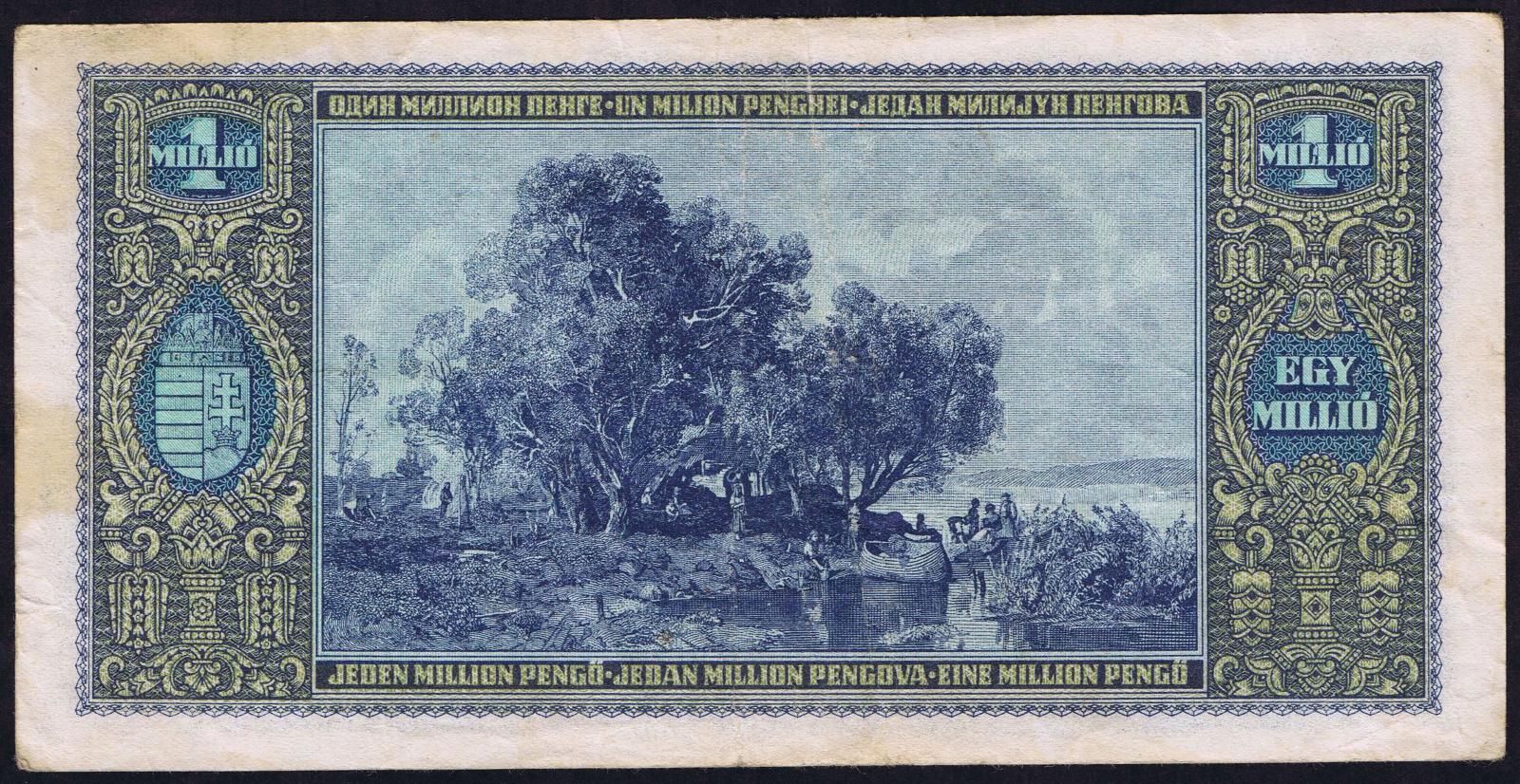 24.5.1946. 1 Million Milpengö. Brown on yellow underprint. Portrait left. Kossuth at right. Without serial number. Back: Painting At the shore of Lake Balaton by G. Mészóly).
