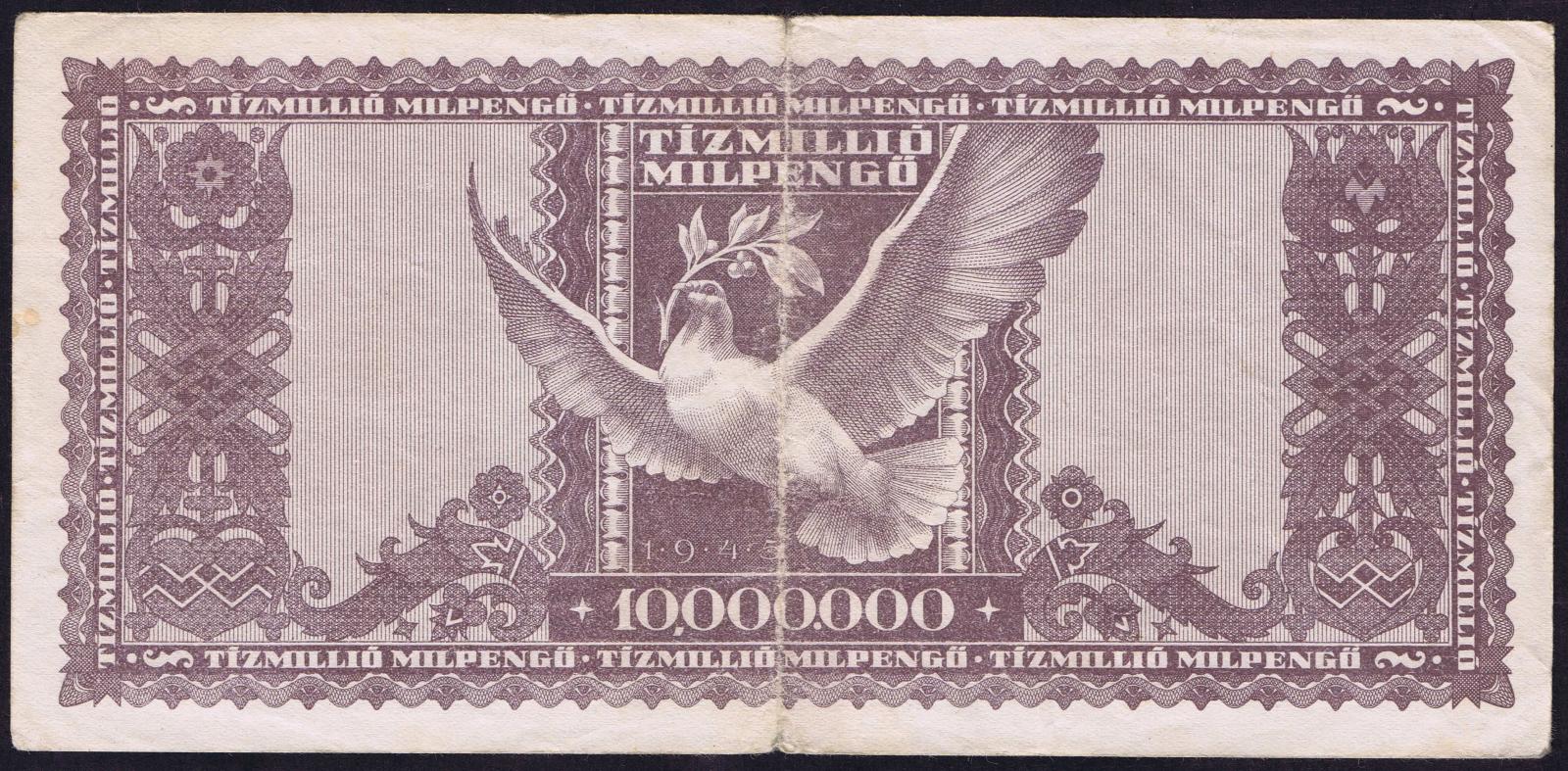 24.5.1946. 10 Million Milpengö. Brown on blue underprint. Portrait left. Kossuth at right. Without serial number. Back: Dove with olive branch.