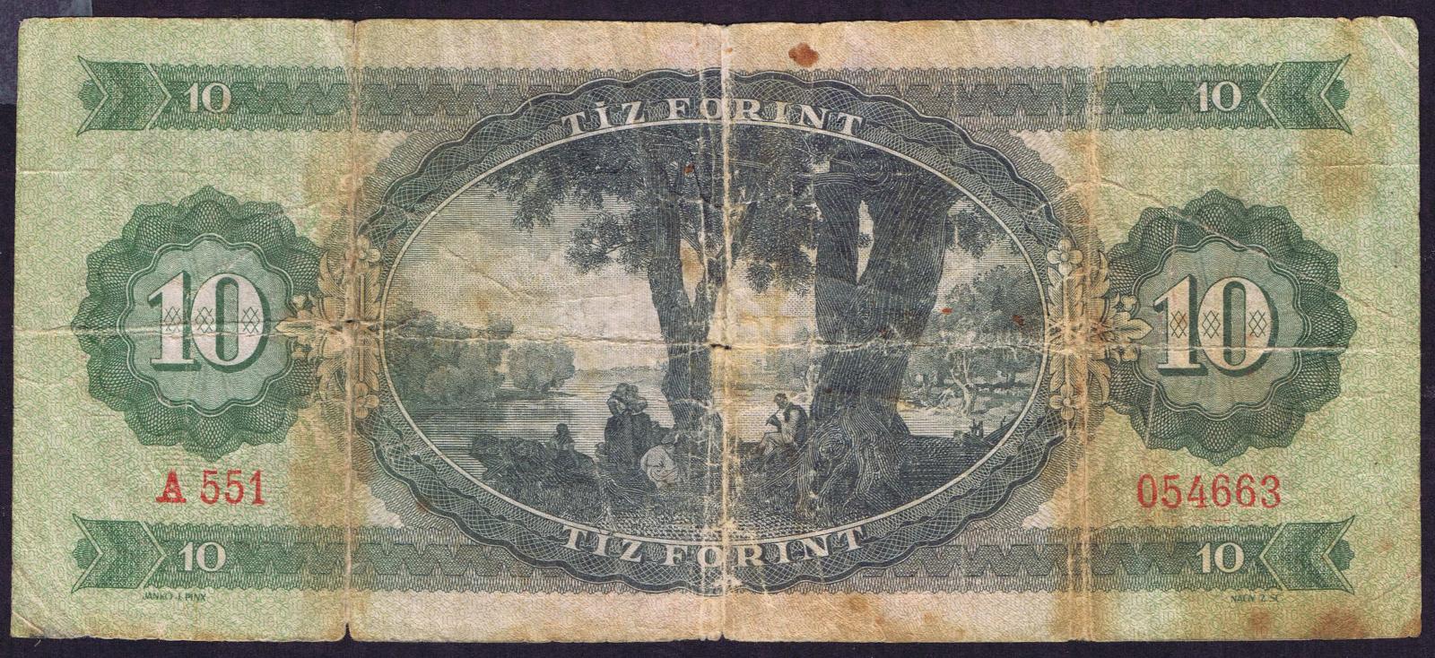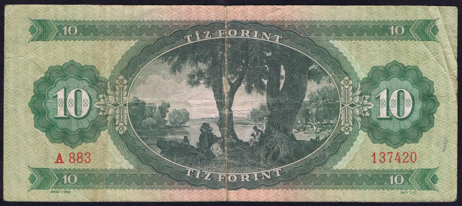 16.11.1945. Blue on brown and green underprint. Portrait left. Kossuth at right. Back: Painting \"At the shore of Lake Balaton\" (by G. Mészöly).
