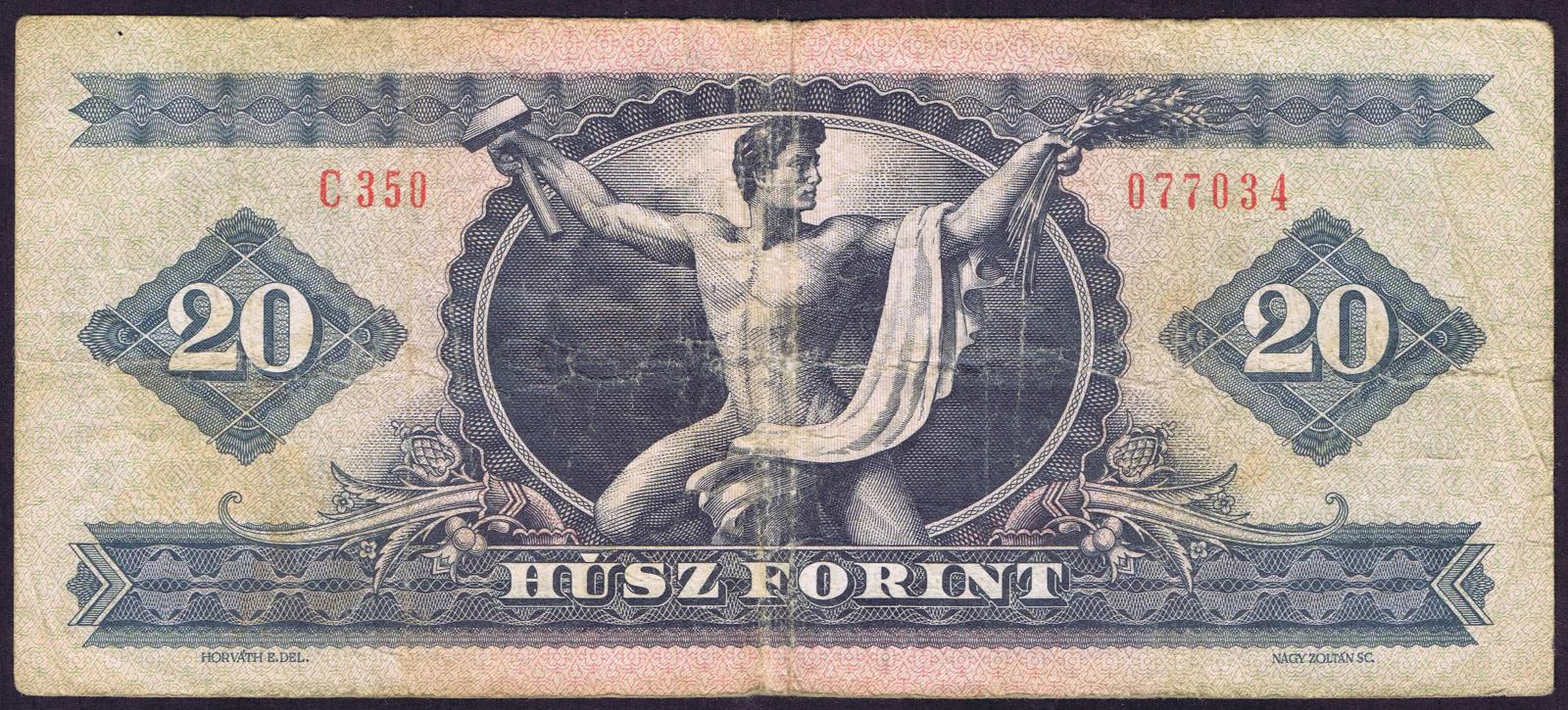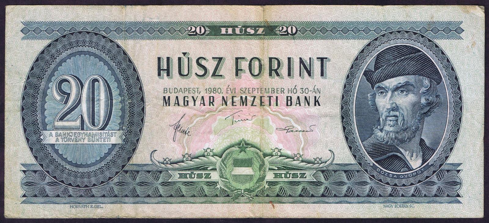 30.9.1980. Blue and green on light green and pink underprint. New arms and signature. Values at left, portrait of Gyorgy Dozsa at right. Penthathlete Csaba Hegedus with hammer and wheat at center on back.