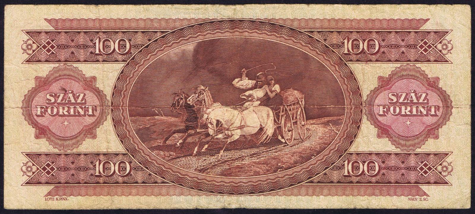 12.10.1962. Red-violet on blue and orange underprint. New arms and signature. Value at left, portrait of Lajos Kossuth at right. Horse-drawn wagon from Took Refuge from the Storm by Karoly Lotz at center on back.