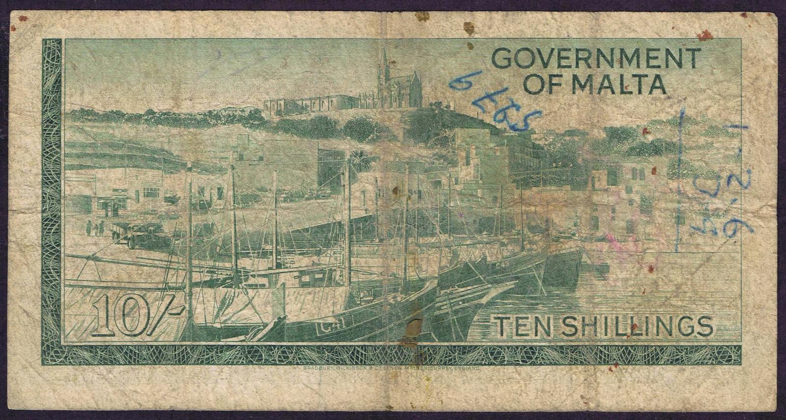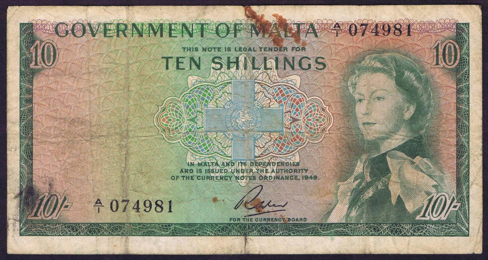 Malta pick 25a: 10 Shillings from 1949