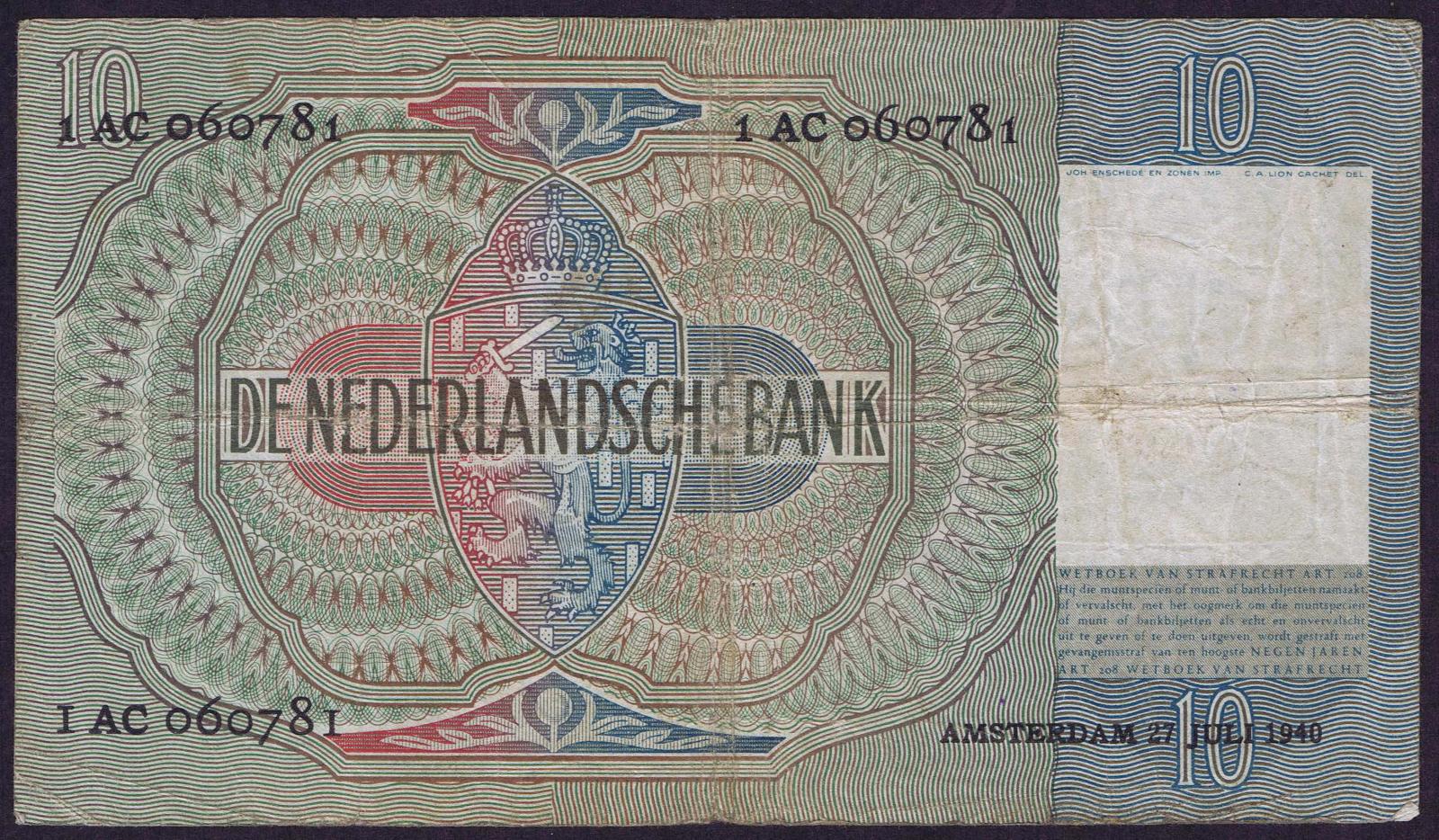 Netherlands pick 56a: 10 Gulden from 1940