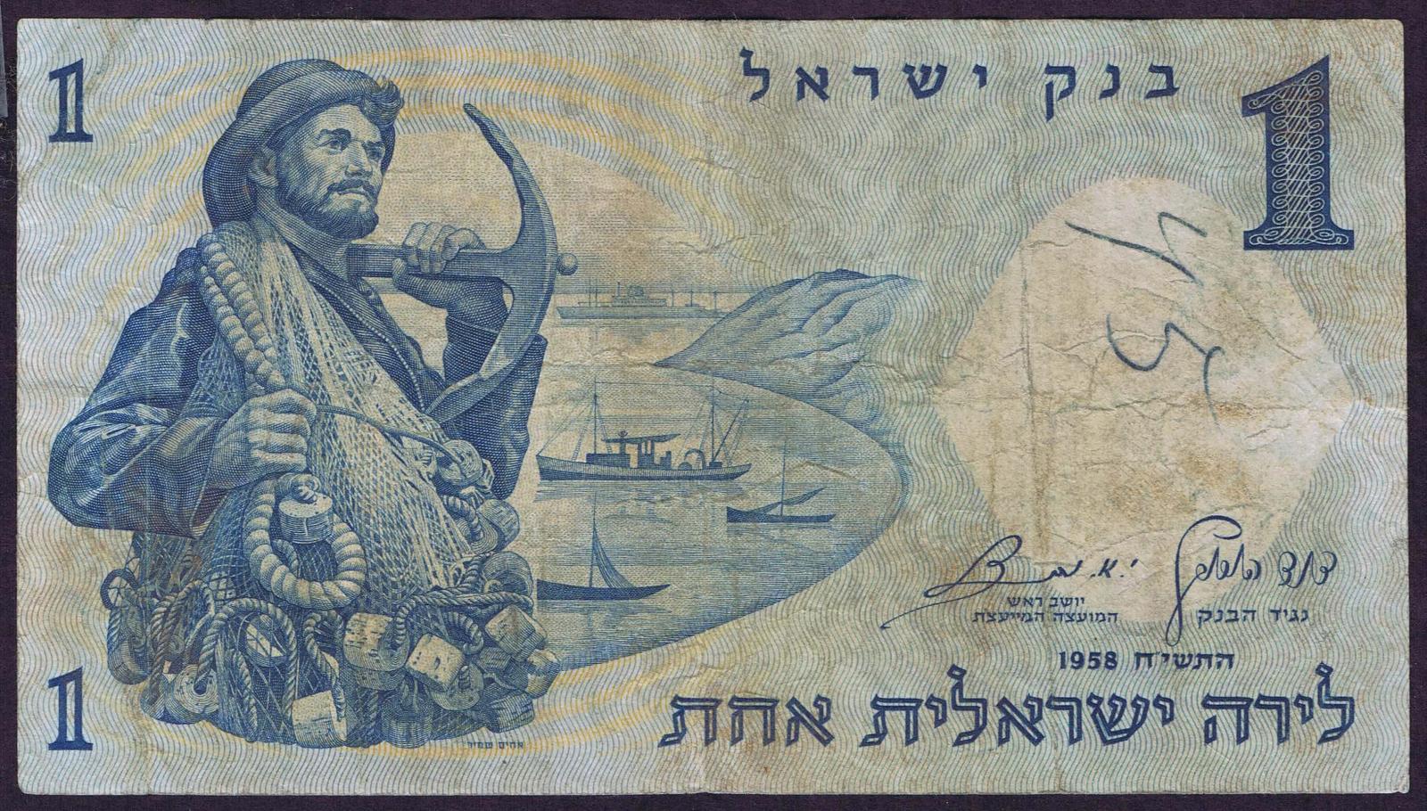 1958/5718. Blue on light blue and peach underprint. Fisherman with net and anchor at left and as watermark. Synagogue mosaic at right on back. Red serial number.