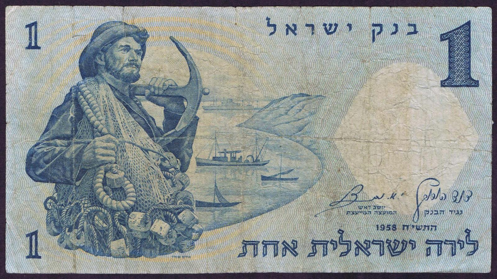 1958/5718. Blue on light blue and peach underprint. Fisherman with net and anchor at left and as watermark. Synagogue mosaic at right on back. Red serial number.