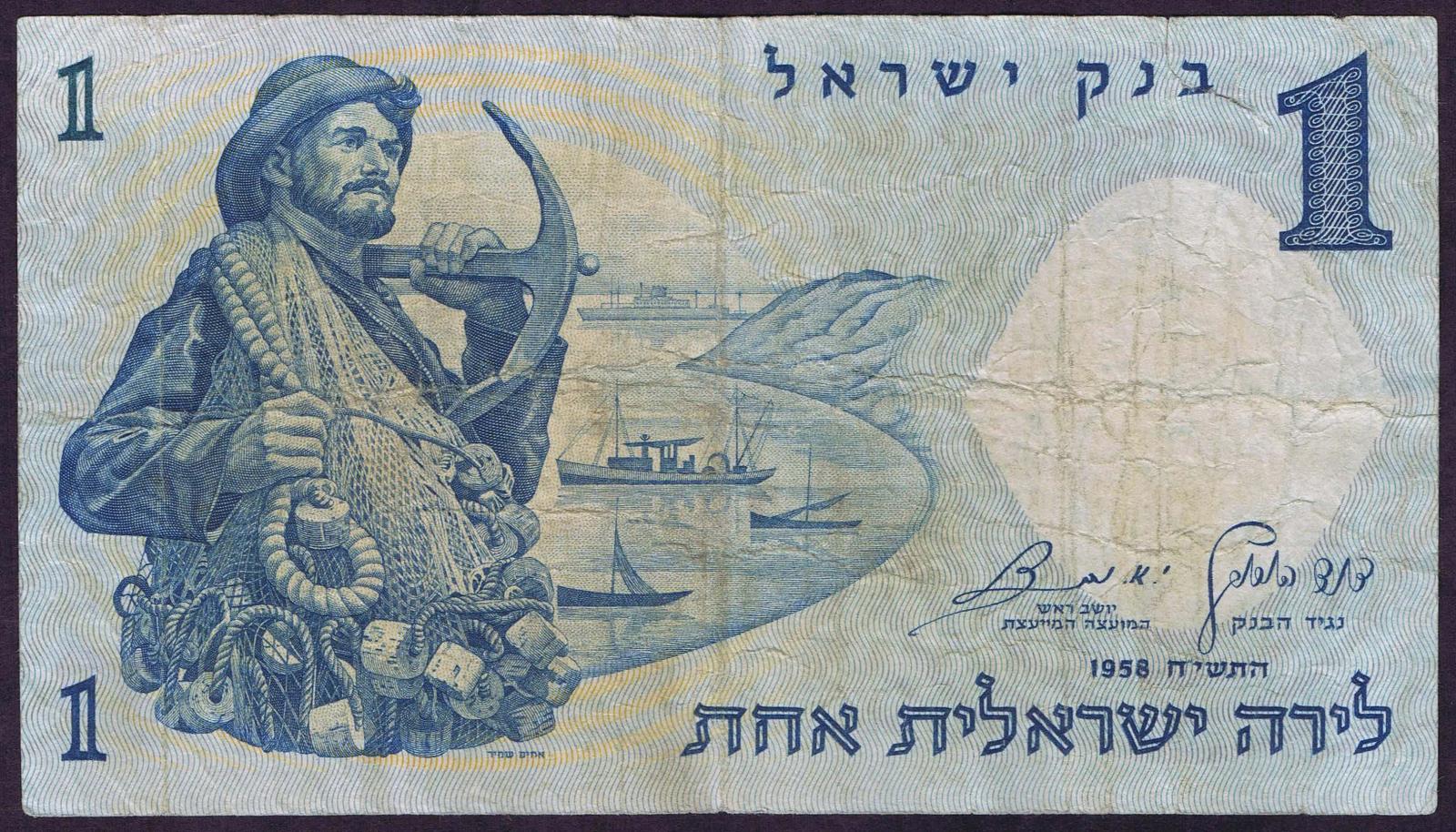 1958/5718. Blue on light blue and peach underprint. Fisherman with net and anchor at left and as watermark. Synagogue mosaic at right on back. Red serial number.