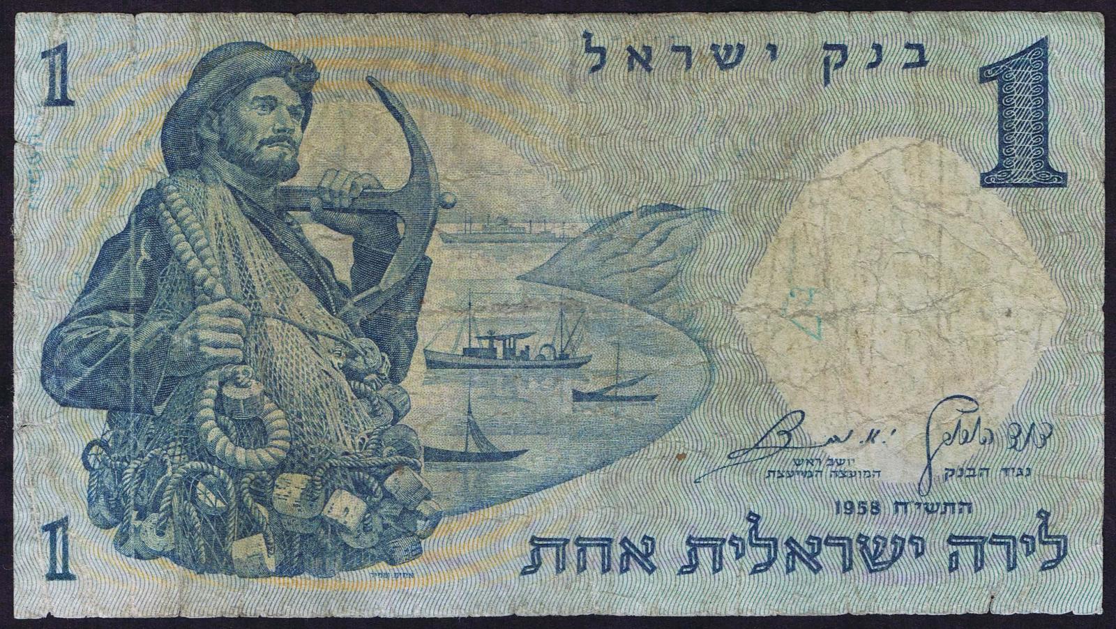 1958/5718. Blue on light blue and peach underprint. Fisherman with net and anchor at left and as watermark. Synagogue mosaic at right on back. Red serial number.