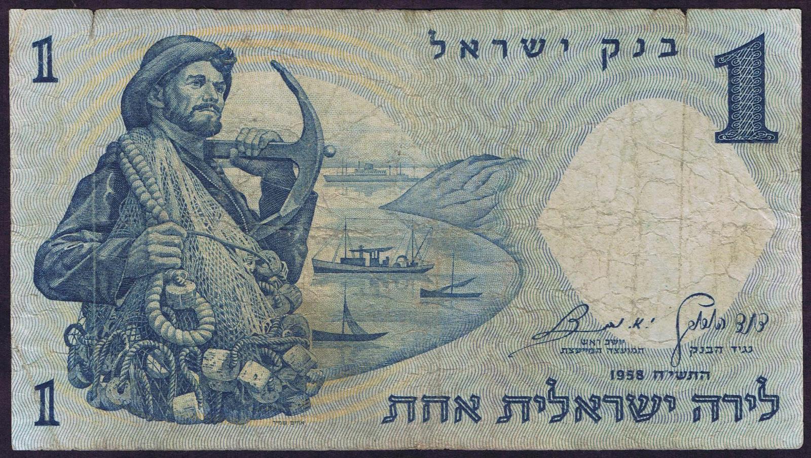1958/5718. Blue on light blue and peach underprint. Fisherman with net and anchor at left and as watermark. Synagogue mosaic at right on back. Red serial number.