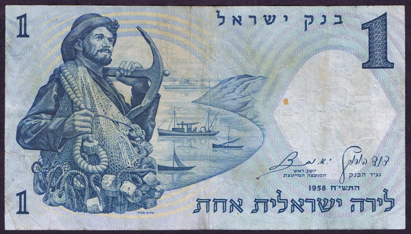 1958/5718. Blue on light blue and peach underprint. Fisherman with net and anchor at left and as watermark. Synagogue mosaic at right on back. Red serial number.