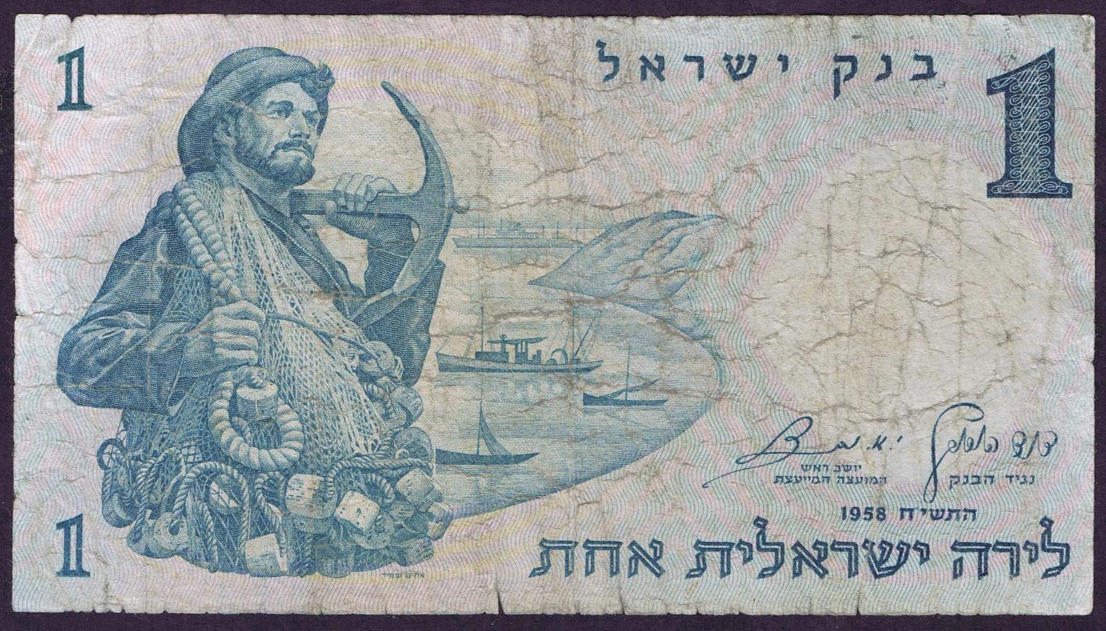 1958/5718. Blue on light blue and peach underprint. Fisherman with net and anchor at left and as watermark. Synagogue mosaic at right on back. Red serial number.