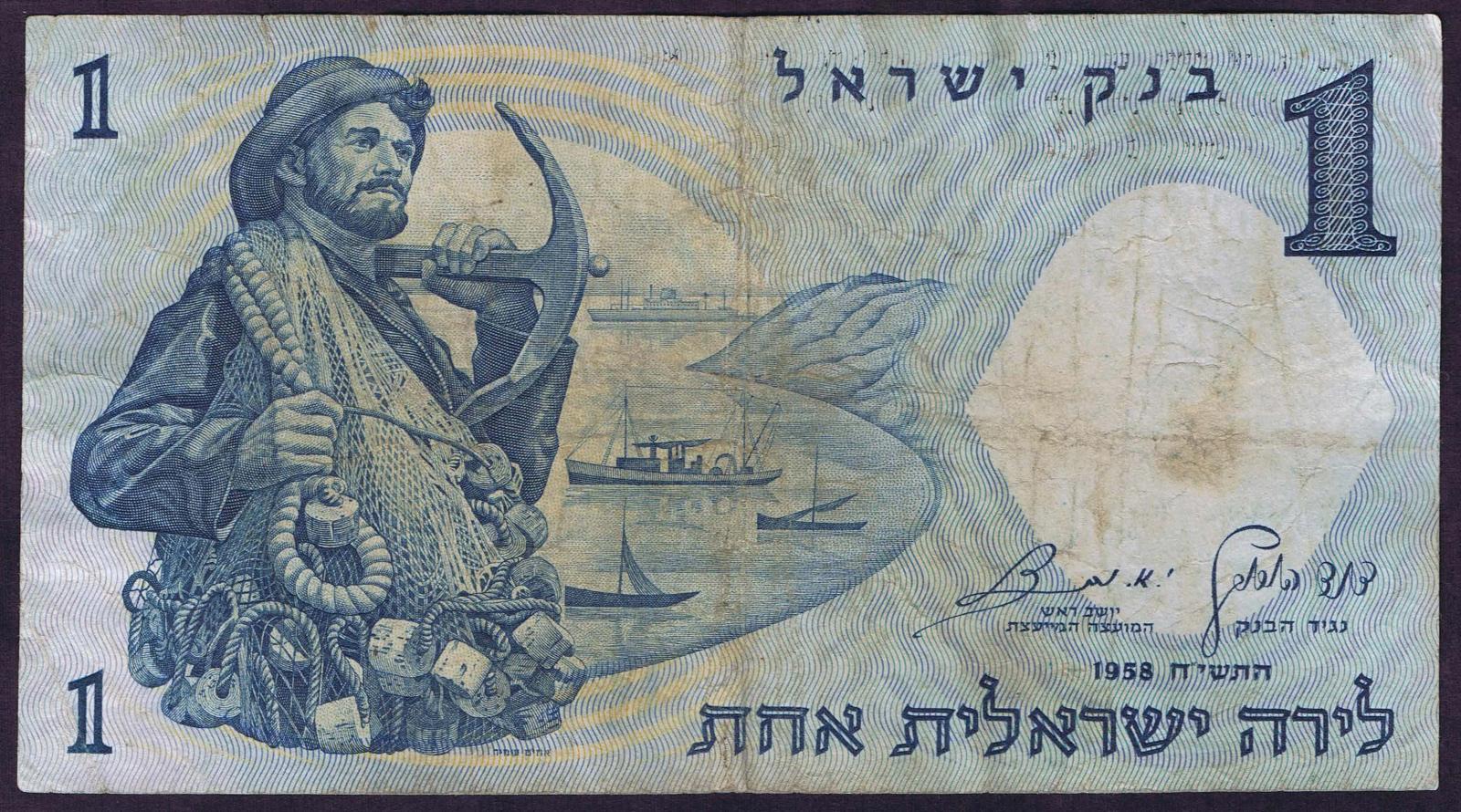 1958/5718. Blue on light blue and peach underprint. Fisherman with net and anchor at left and as watermark. Synagogue mosaic at right on back. Red serial number.