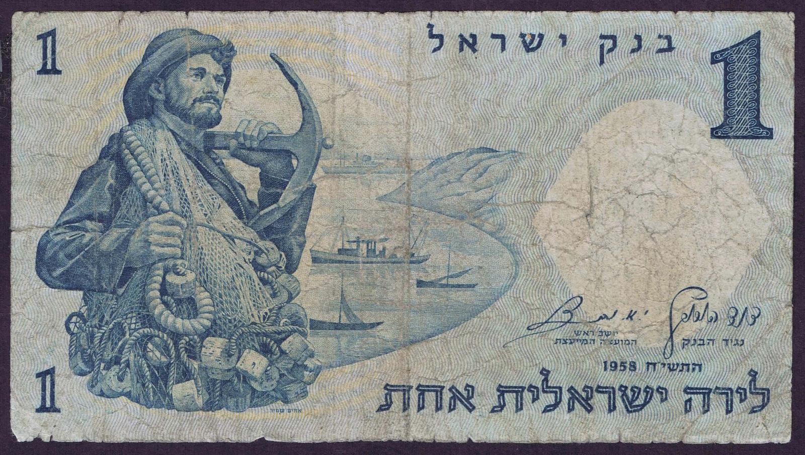 1958/5718. Blue on light blue and peach underprint. Fisherman with net and anchor at left and as watermark. Synagogue mosaic at right on back. Red serial number.