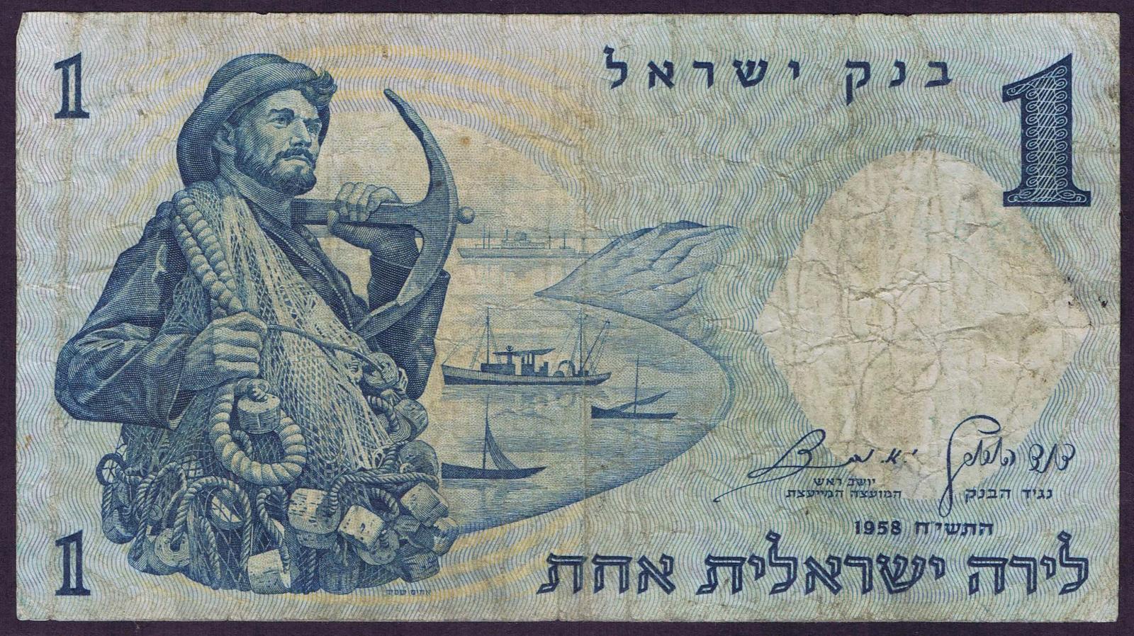 1958/5718. Blue on light blue and peach underprint. Fisherman with net and anchor at left and as watermark. Synagogue mosaic at right on back. Red serial number.