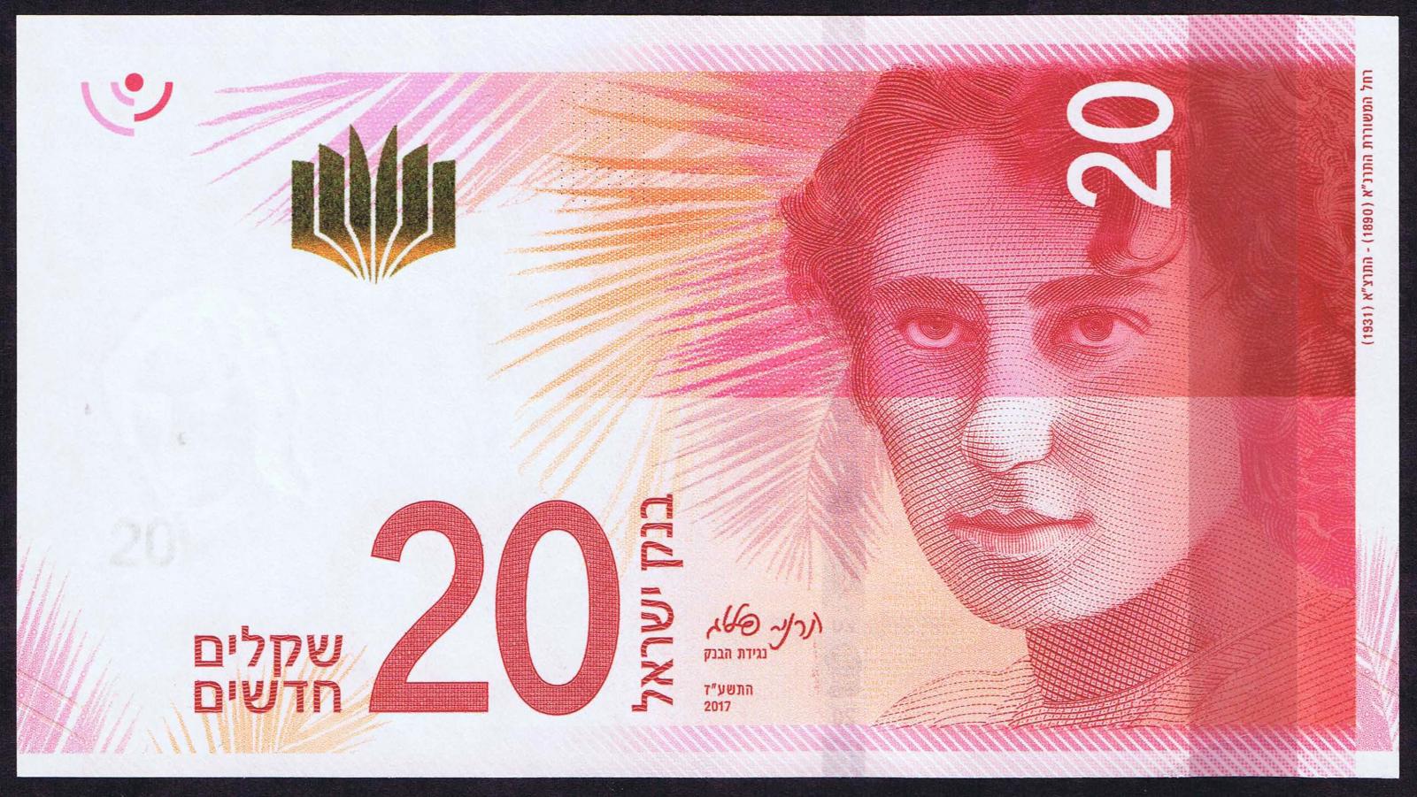 1968/5728. Gray-green and blue on multicolored underprint. Albert Einstein at right and as watermark. Atomic reactor at Nahal Sorek on back. Red serial number.