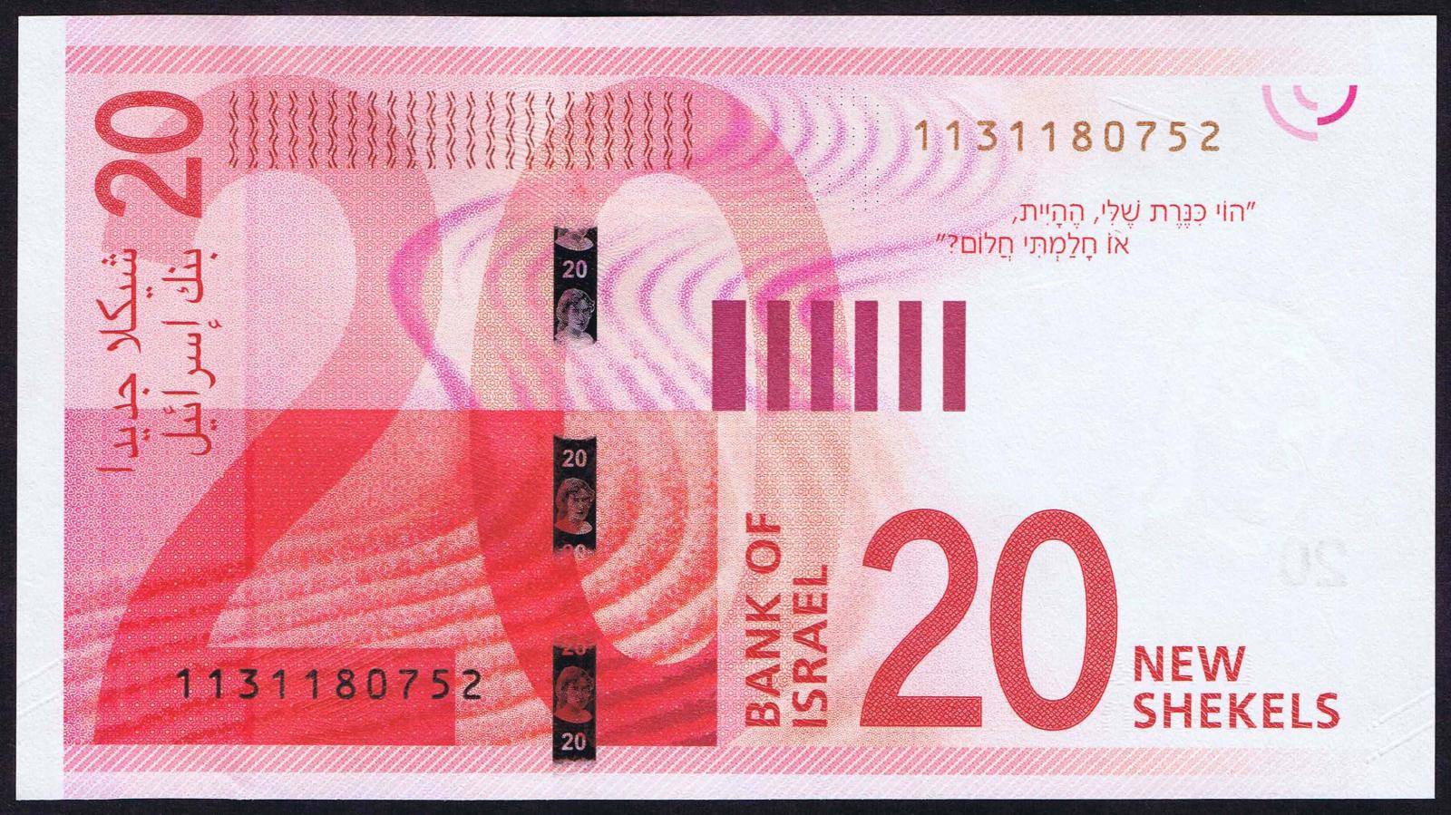 1973/5733. Purple and lilac underprint. Sir Moses Montefiore at right and as watermark. Jaffa Gate on back. Marks for the blind on face. Faint bar code strips at lower left and upper right on the back.