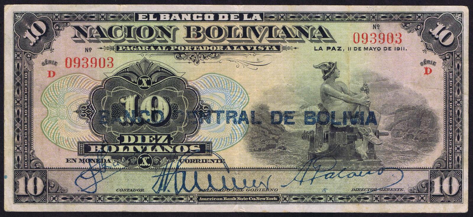 ND (1929). Black on tan and blue underprint. Mercury seated at left. Red series F-U. Back: Arms at center. Overprint: Blue BANCO CENTRAL DE BOLIVIA on number 106.